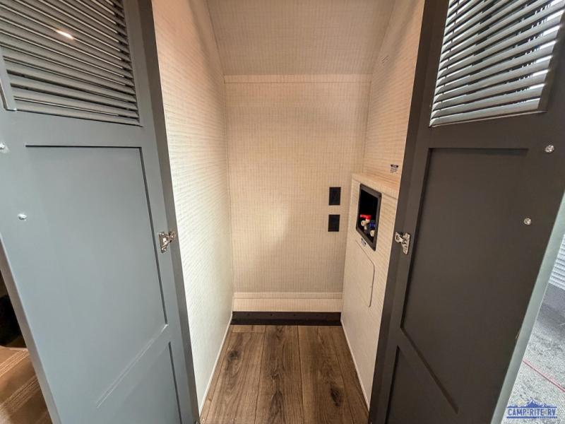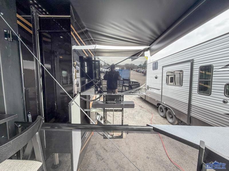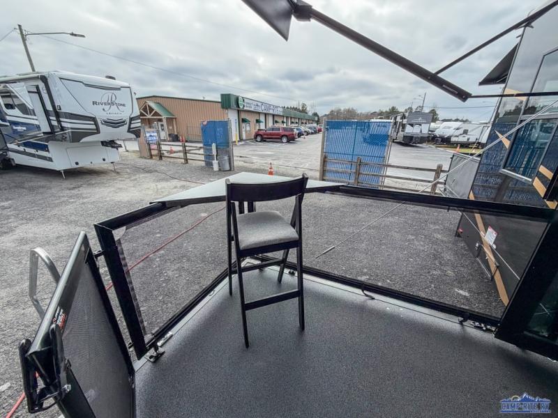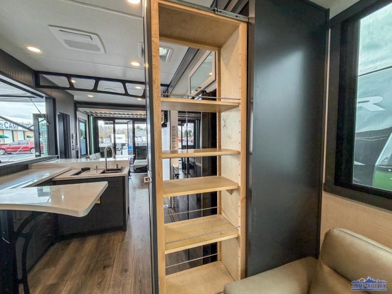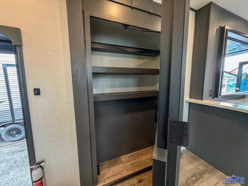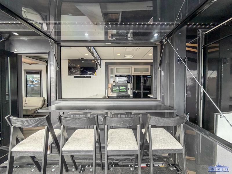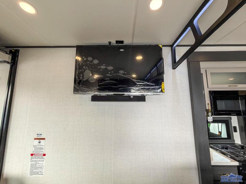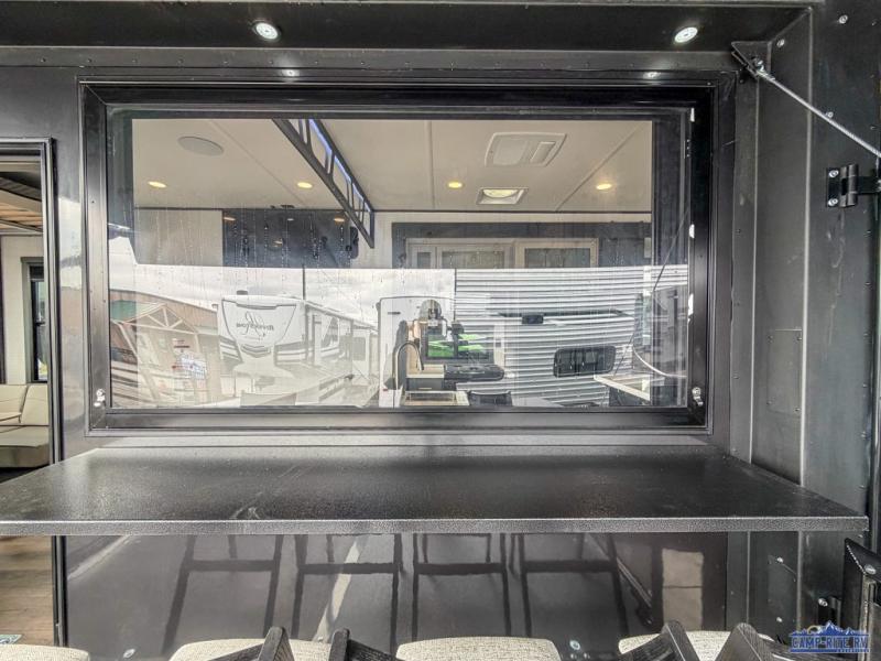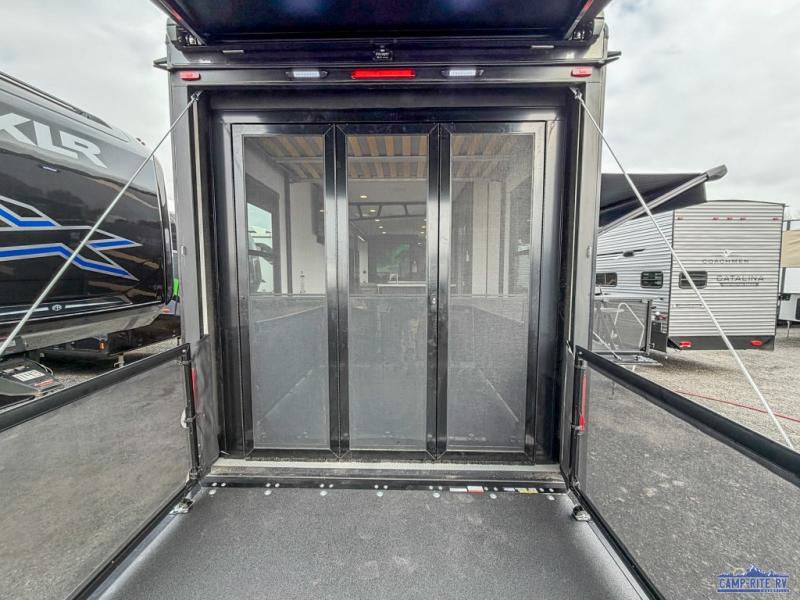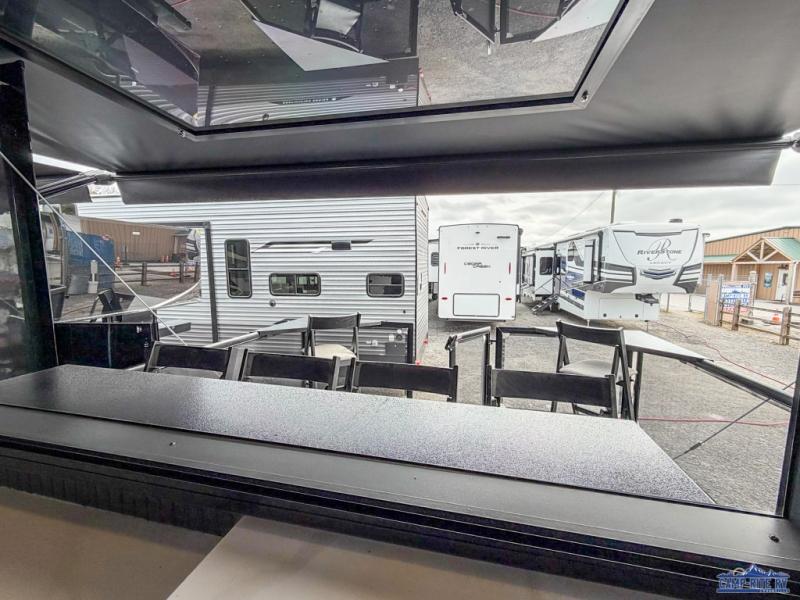 Once you arrive at your destination, you can unload your toys from the 13' garage, then relax on the dual sofas with a removable dinette tables in between. There is also a queen-size bed above the sofa where guests can sleep. Everyone will love to gather on the side patio that features a flip-down bar top and a window that looks into the kitchen. There are also bar stools here and inside at the counter, so everyone has a seat. If the weather isn't cooperating, you can relax on the L-shaped sofa in the main living area, and there is a 55" TV with a hidden pantry behind for snacks! A spacious full bath will let everyone freshen up after trail riding, and you'll love having your own bedroom up front. Here, you'll find a 66" x 80" king bed slide out, a wardrobe, dresser, plus washer and dryer prep if you choose to add those appliances!