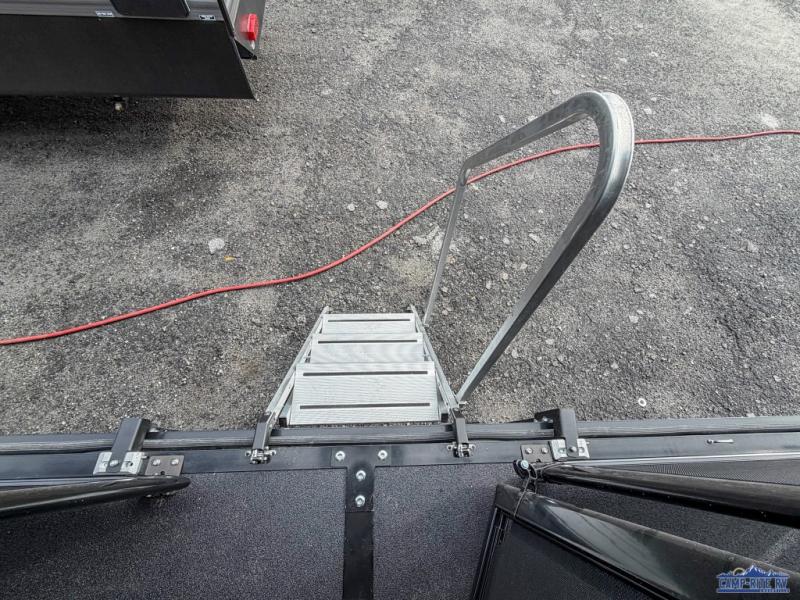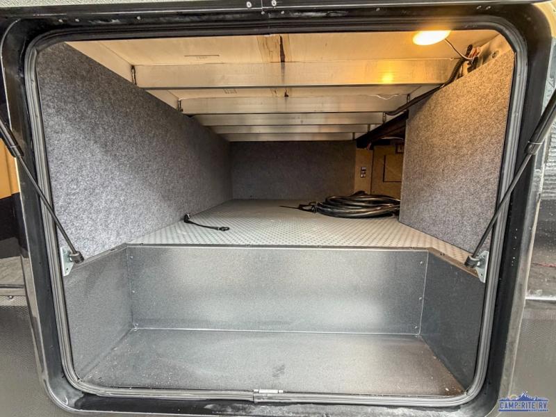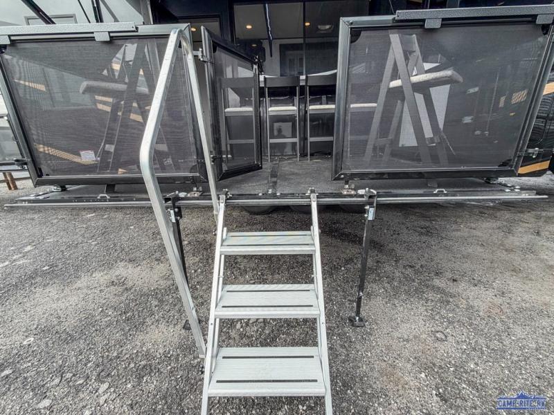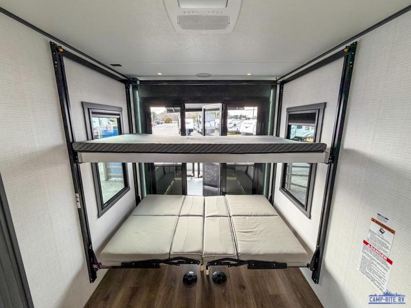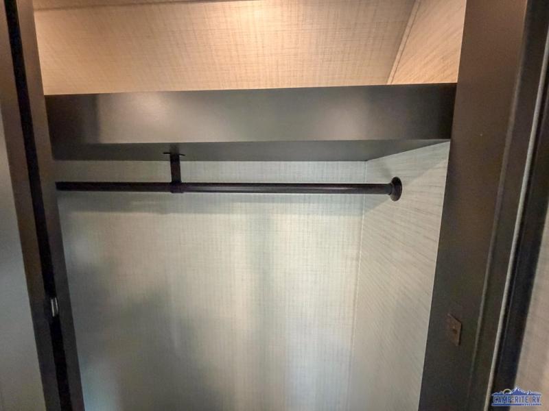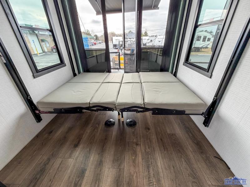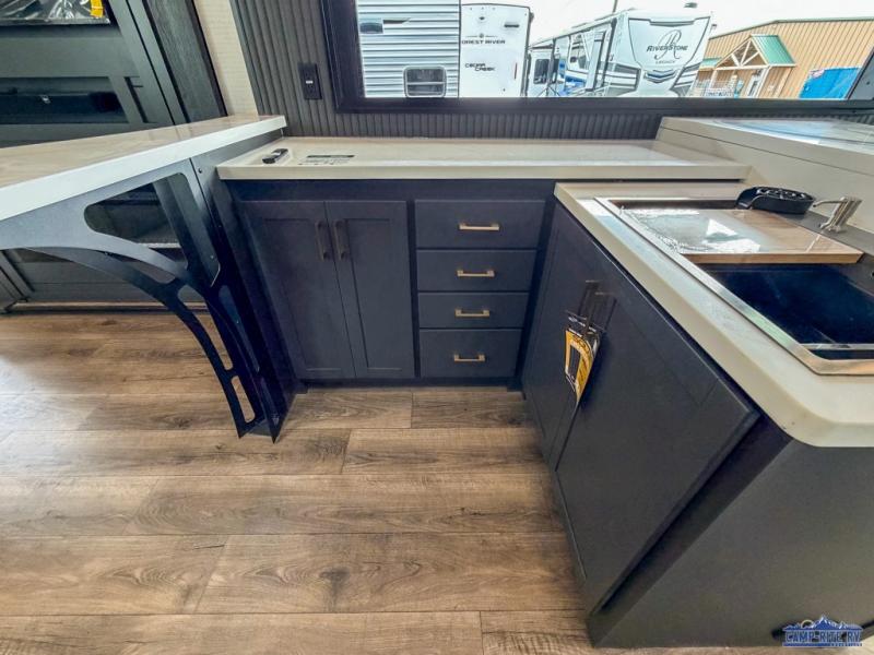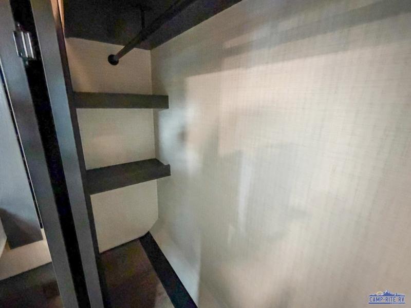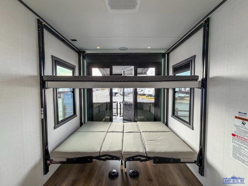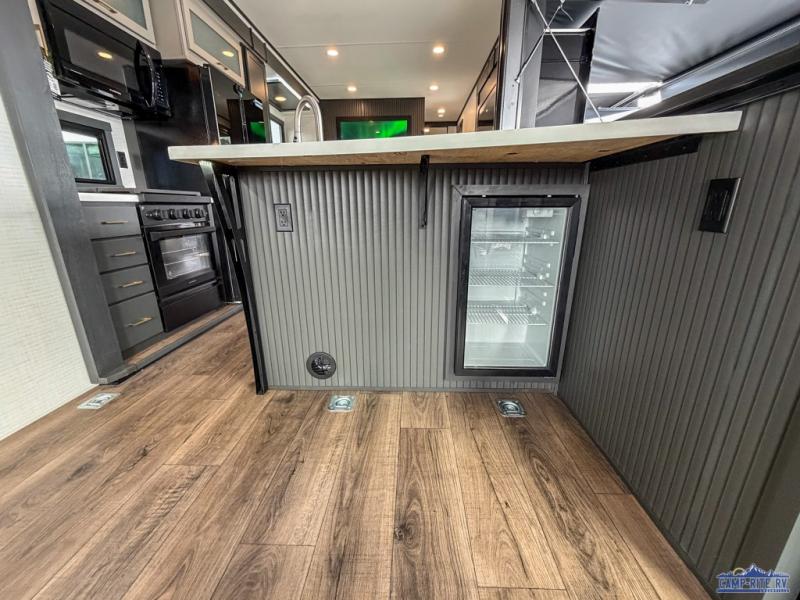 Once you arrive at your destination, you can unload your toys from the 13' garage, then relax on the dual sofas with a removable dinette tables in between. There is also a queen-size bed above the sofa where guests can sleep. Everyone will love to gather on the side patio that features a flip-down bar top and a window that looks into the kitchen. There are also bar stools here and inside at the counter, so everyone has a seat. If the weather isn't cooperating, you can relax on the L-shaped sofa in the main living area, and there is a 55" TV with a hidden pantry behind for snacks! A spacious full bath will let everyone freshen up after trail riding, and you'll love having your own bedroom up front. Here, you'll find a 66" x 80" king bed slide out, a wardrobe, dresser, plus washer and dryer prep if you choose to add those appliances!
