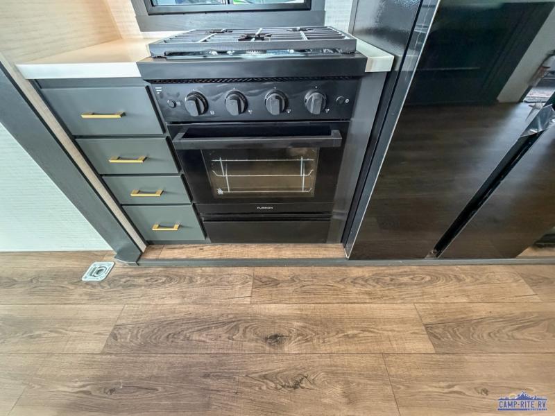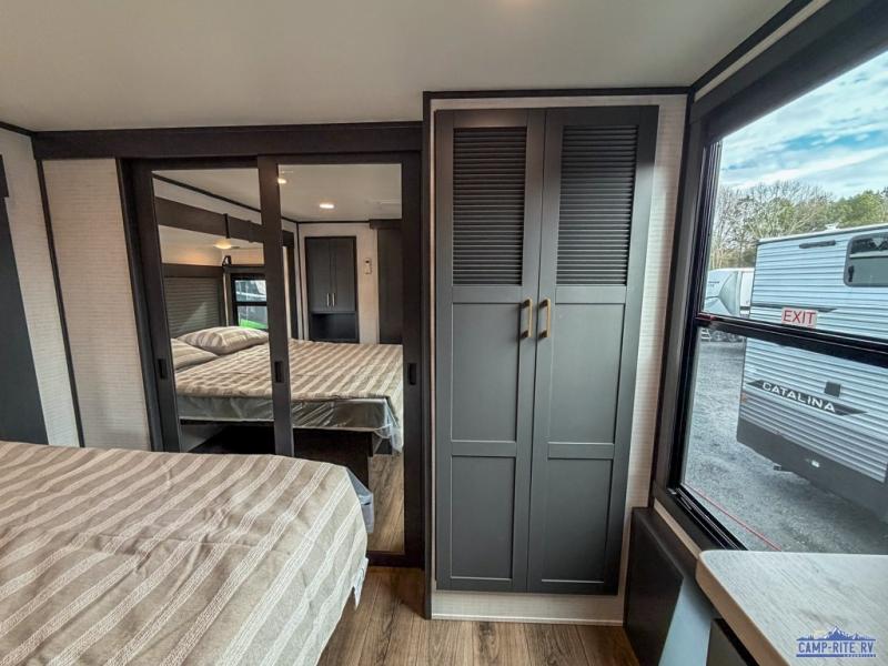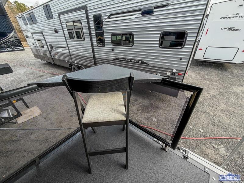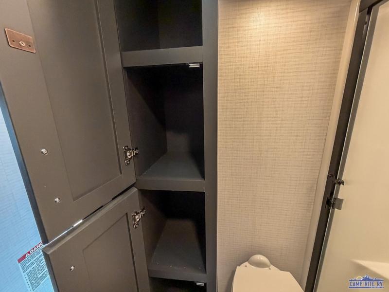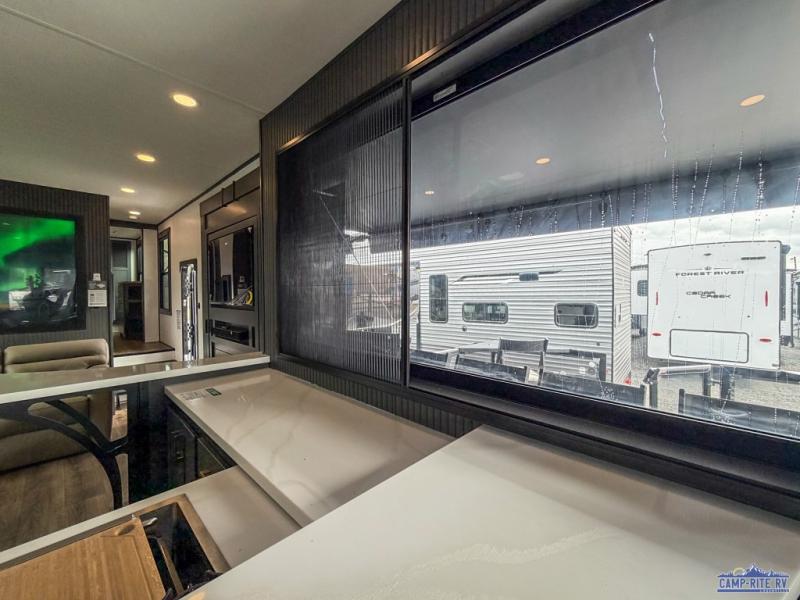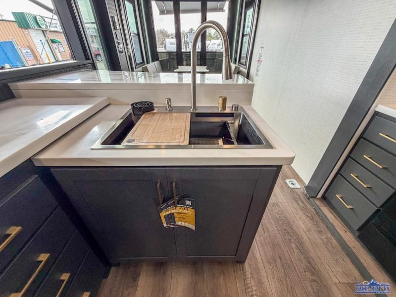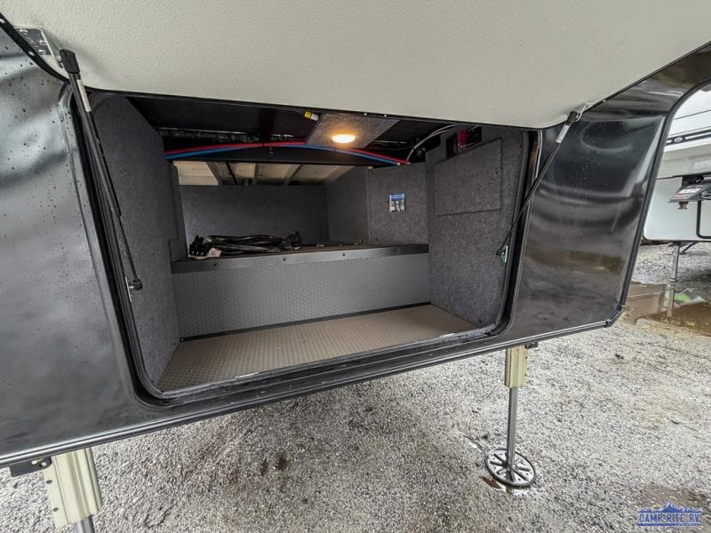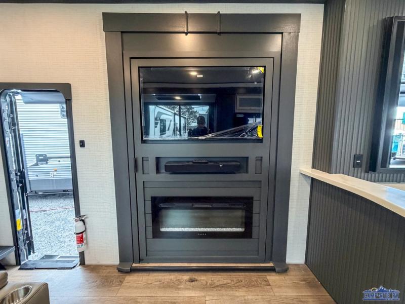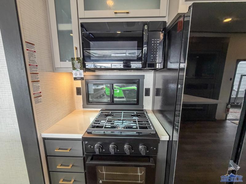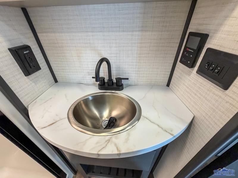 Once you arrive at your destination, you can unload your toys from the 13' garage, then relax on the dual sofas with a removable dinette tables in between. There is also a queen-size bed above the sofa where guests can sleep. Everyone will love to gather on the side patio that features a flip-down bar top and a window that looks into the kitchen. There are also bar stools here and inside at the counter, so everyone has a seat. If the weather isn't cooperating, you can relax on the L-shaped sofa in the main living area, and there is a 55" TV with a hidden pantry behind for snacks! A spacious full bath will let everyone freshen up after trail riding, and you'll love having your own bedroom up front. Here, you'll find a 66" x 80" king bed slide out, a wardrobe, dresser, plus washer and dryer prep if you choose to add those appliances!
