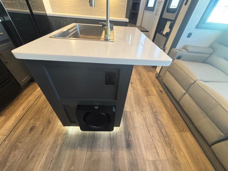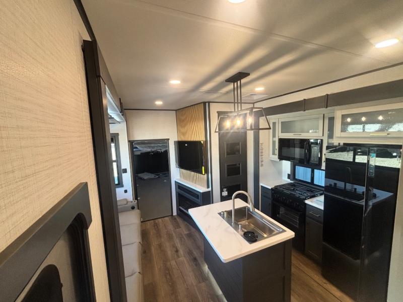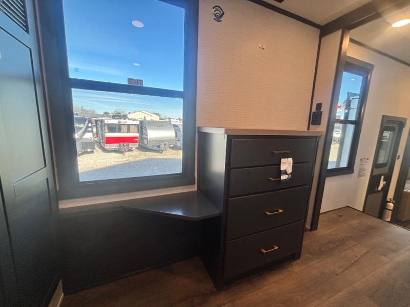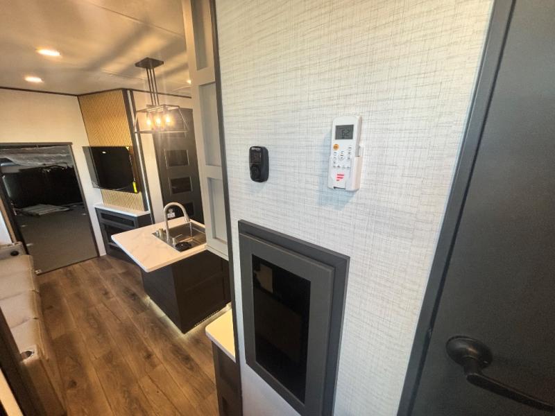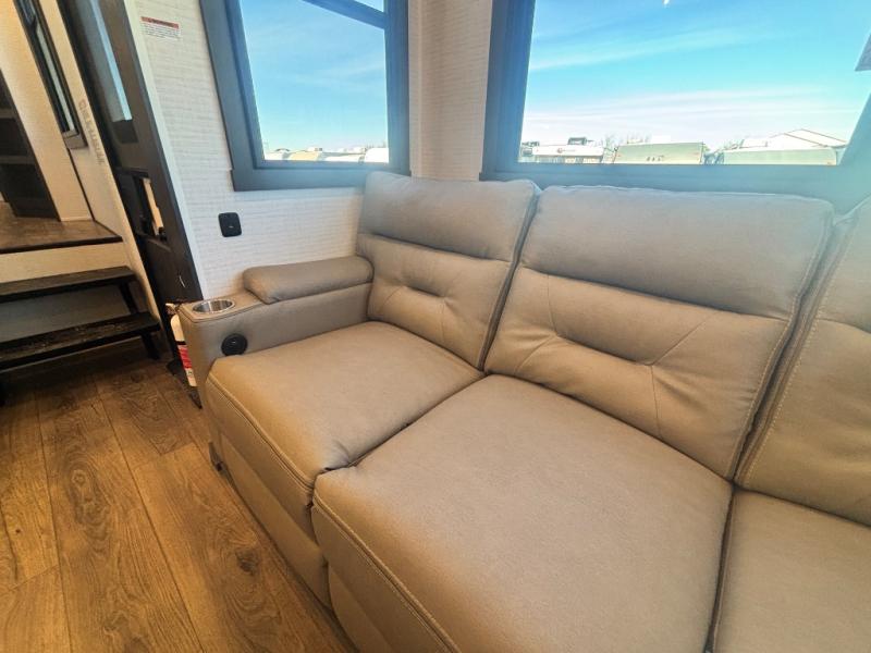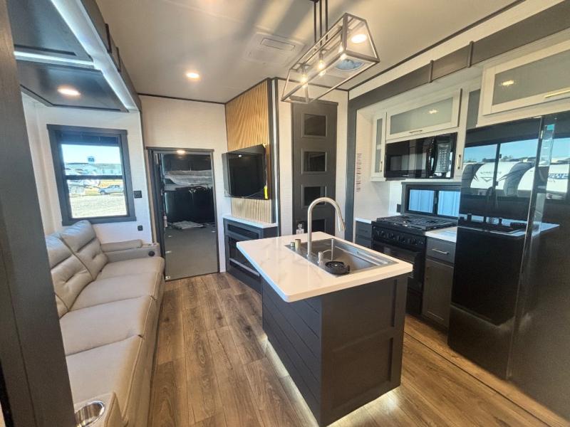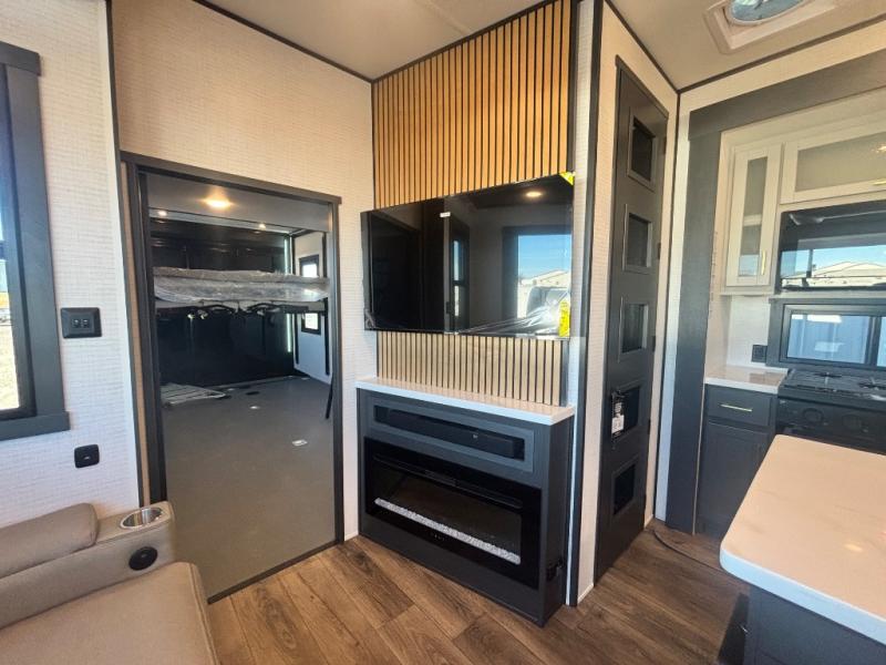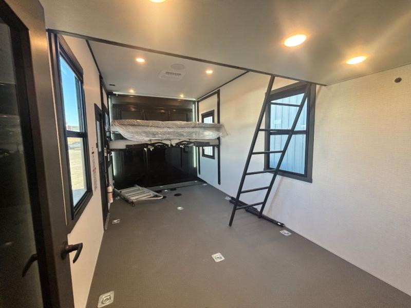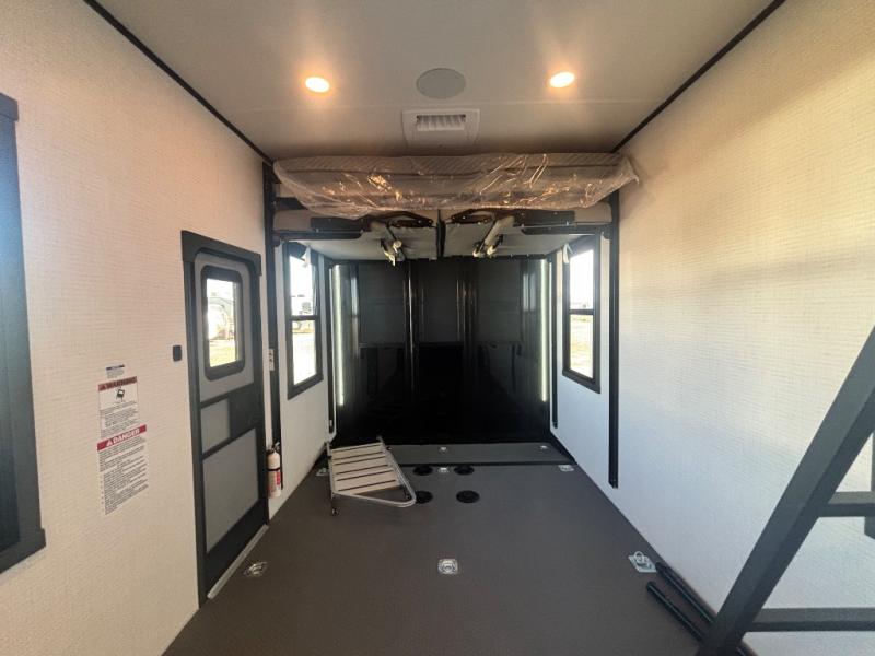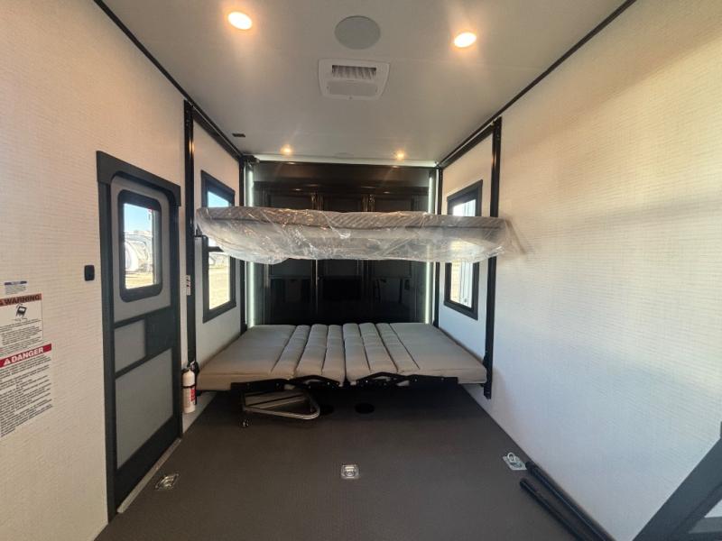 This 40G17 model is built for both adventure and comfort, starting with an expansive 17-foot garage that provides ample space for all your toys. Inside the garage, you’ll find a versatile Happi-Jack dinette with a removable table, perfect for meals or hanging out, and a Happi-Jack queen bed system that offers additional sleeping space when needed. One of the unit's two entry doors is also conveniently located here along with a half bath. In the middle living area, one of the three slide-outs houses the large sofa, centered across a cozy fireplace and a 55-inch TV ideal for relaxing after a long day. The kitchen is designed for functionality, featuring an island with a double sink, a 16 cu.ft. refrigerator, microwave, and a large 20-cu.ft. pantry to keep all your snacks and essentials organized. Toward the front, you’ll find the full bathroom and a private bedroom that includes a king bed, spacious wardrobe and dresser, offering plenty of storage for clothes and personal items, making this toy hauler the perfect home on the road.