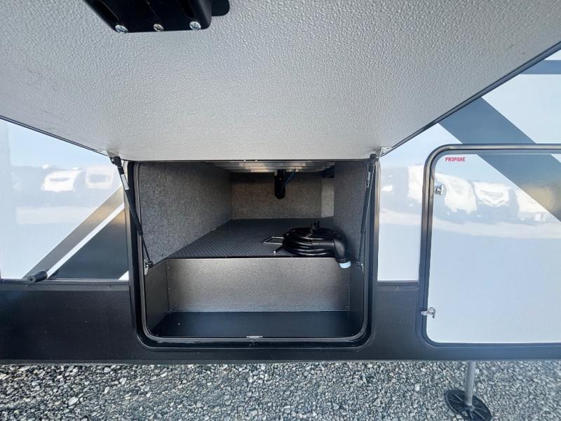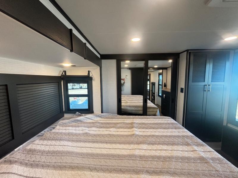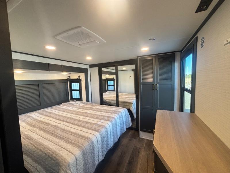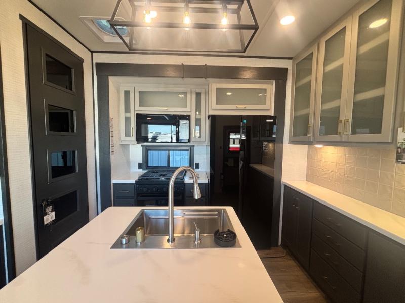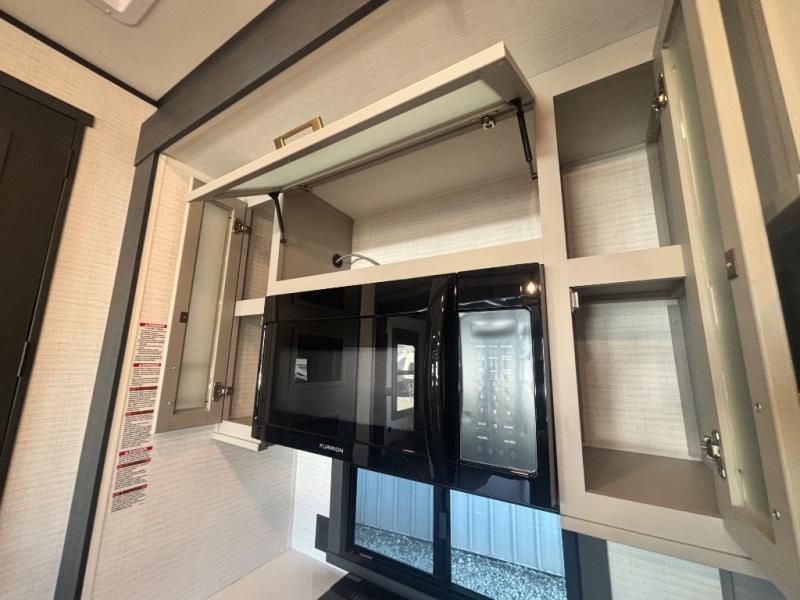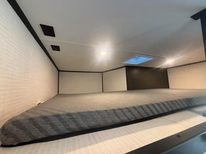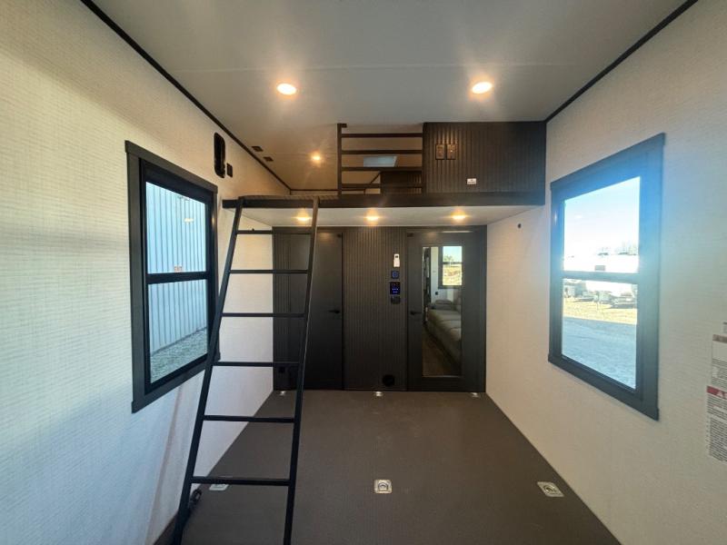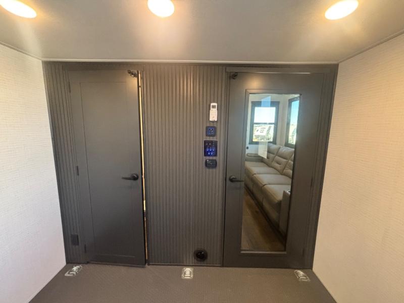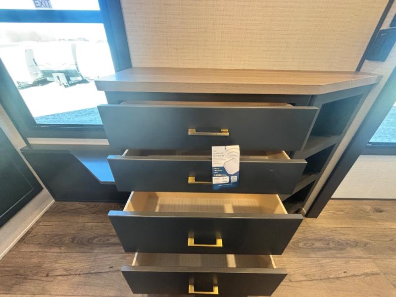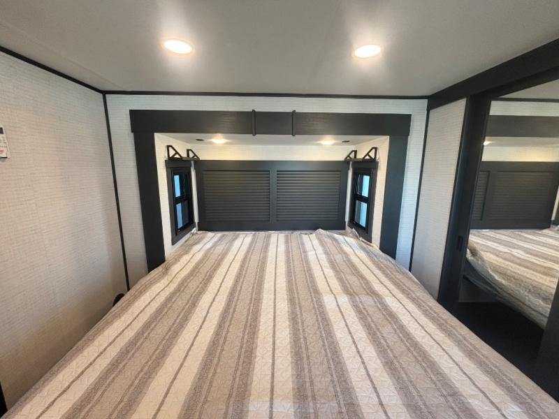 This 40G17 model is built for both adventure and comfort, starting with an expansive 17-foot garage that provides ample space for all your toys. Inside the garage, you’ll find a versatile Happi-Jack dinette with a removable table, perfect for meals or hanging out, and a Happi-Jack queen bed system that offers additional sleeping space when needed. One of the unit's two entry doors is also conveniently located here along with a half bath. In the middle living area, one of the three slide-outs houses the large sofa, centered across a cozy fireplace and a 55-inch TV ideal for relaxing after a long day. The kitchen is designed for functionality, featuring an island with a double sink, a 16 cu.ft. refrigerator, microwave, and a large 20-cu.ft. pantry to keep all your snacks and essentials organized. Toward the front, you’ll find the full bathroom and a private bedroom that includes a king bed, spacious wardrobe and dresser, offering plenty of storage for clothes and personal items, making this toy hauler the perfect home on the road.