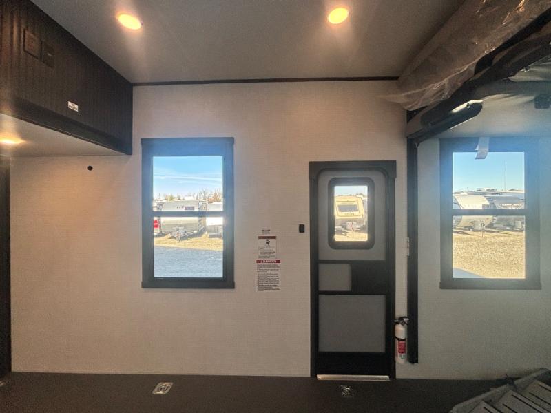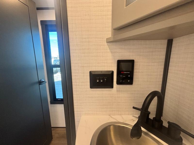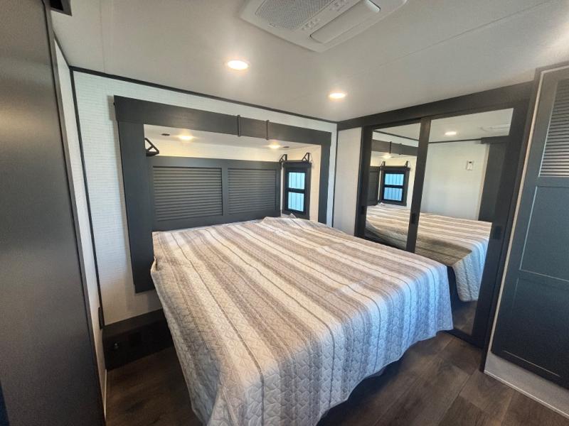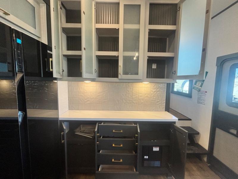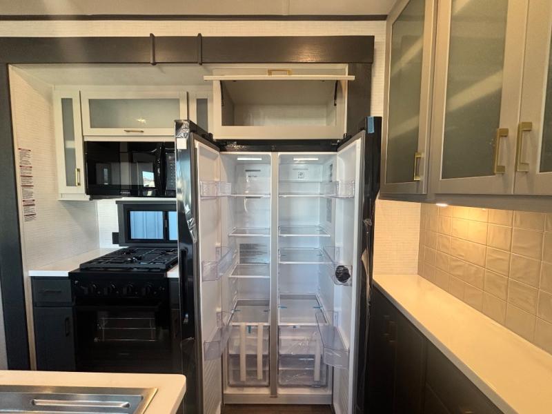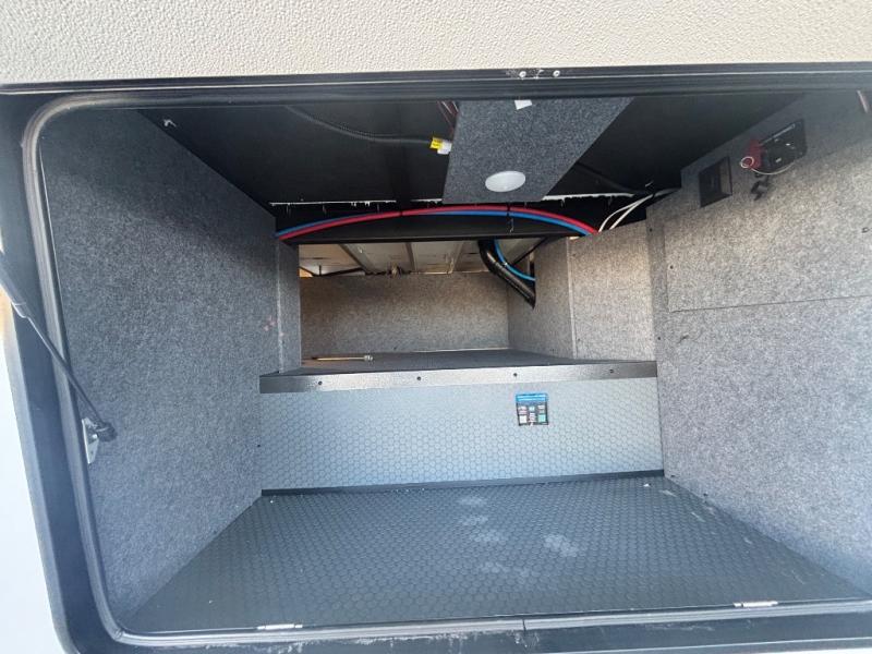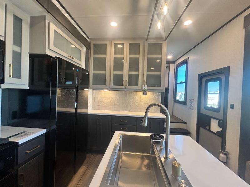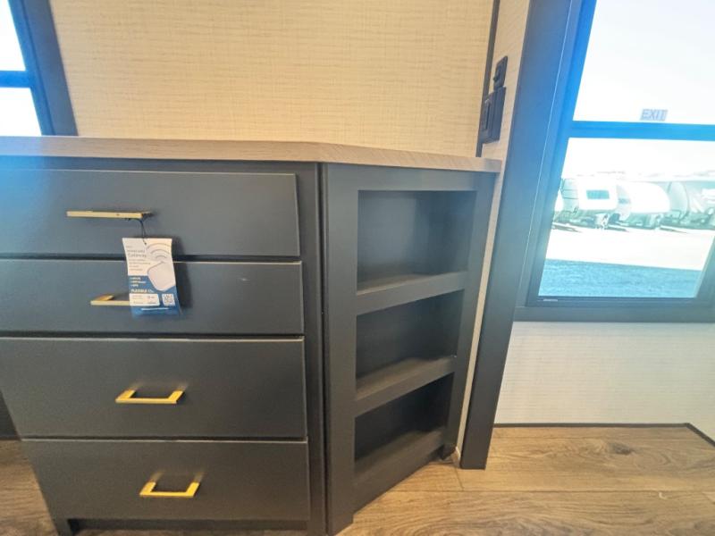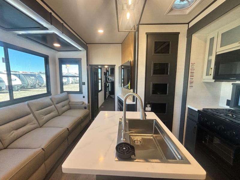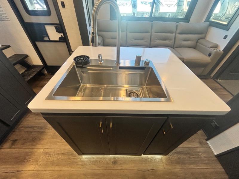 This 40G17 model is built for both adventure and comfort, starting with an expansive 17-foot garage that provides ample space for all your toys. Inside the garage, you’ll find a versatile Happi-Jack dinette with a removable table, perfect for meals or hanging out, and a Happi-Jack queen bed system that offers additional sleeping space when needed. One of the unit's two entry doors is also conveniently located here along with a half bath. In the middle living area, one of the three slide-outs houses the large sofa, centered across a cozy fireplace and a 55-inch TV ideal for relaxing after a long day. The kitchen is designed for functionality, featuring an island with a double sink, a 16 cu.ft. refrigerator, microwave, and a large 20-cu.ft. pantry to keep all your snacks and essentials organized. Toward the front, you’ll find the full bathroom and a private bedroom that includes a king bed, spacious wardrobe and dresser, offering plenty of storage for clothes and personal items, making this toy hauler the perfect home on the road.