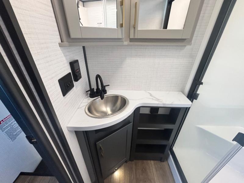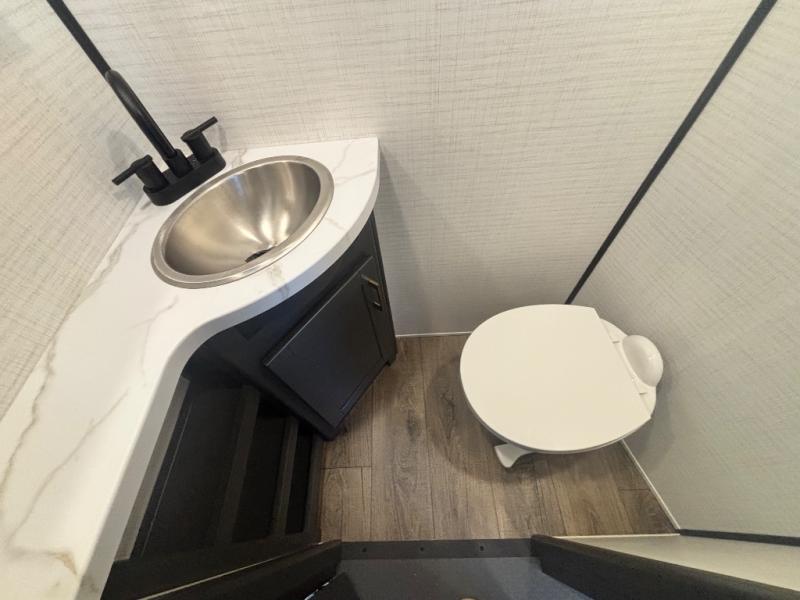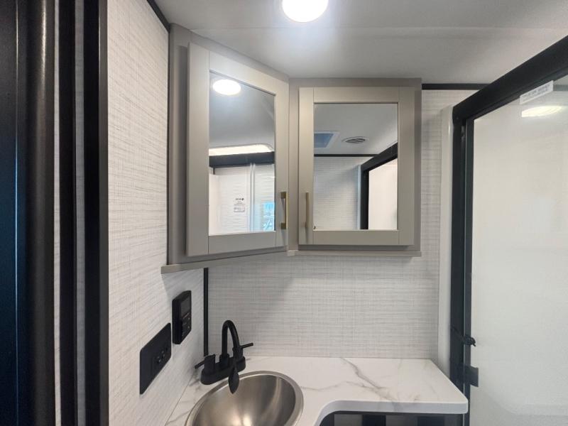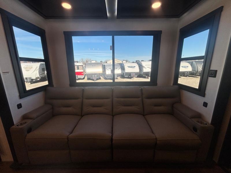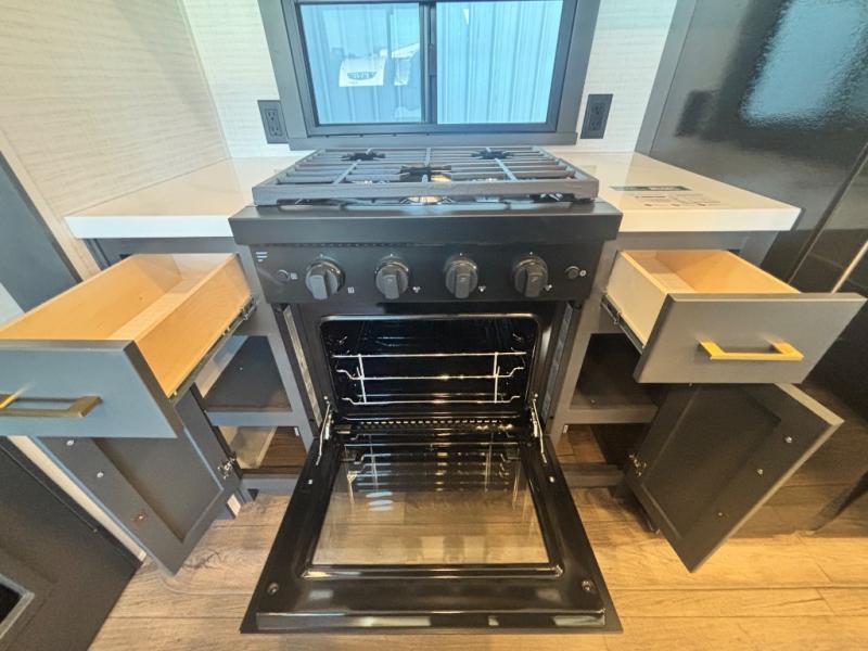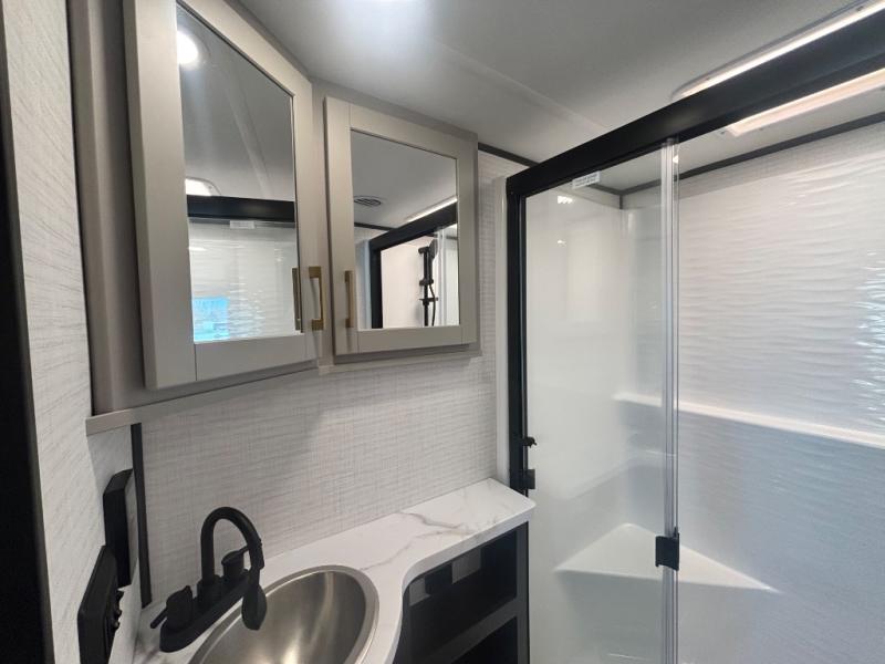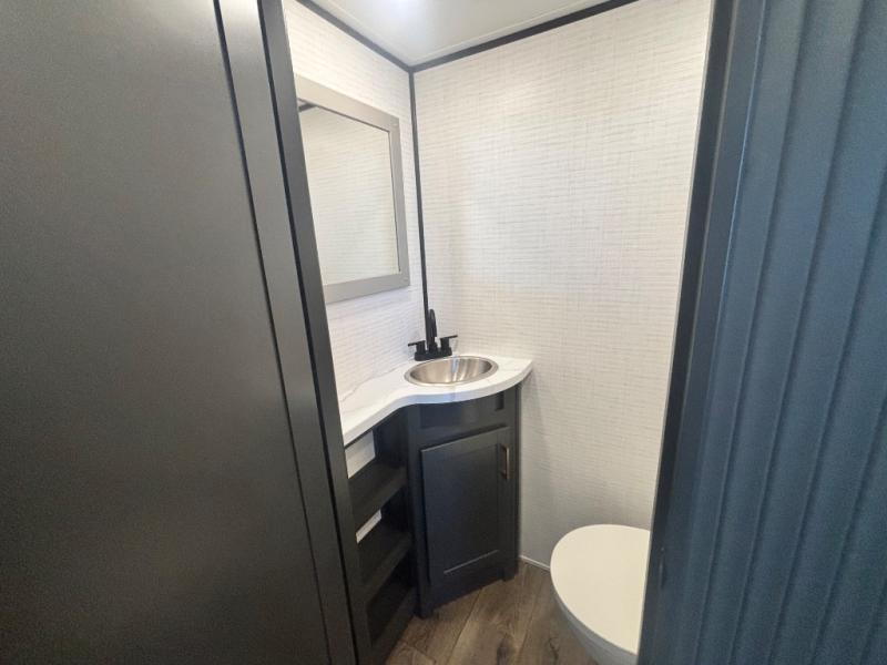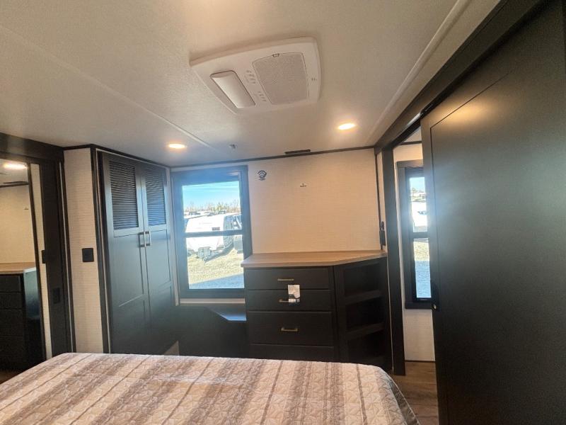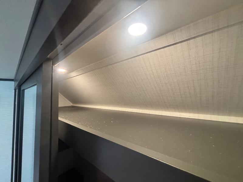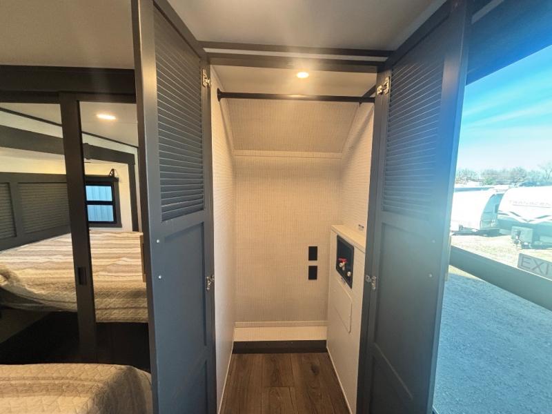 This 40G17 model is built for both adventure and comfort, starting with an expansive 17-foot garage that provides ample space for all your toys. Inside the garage, you’ll find a versatile Happi-Jack dinette with a removable table, perfect for meals or hanging out, and a Happi-Jack queen bed system that offers additional sleeping space when needed. One of the unit's two entry doors is also conveniently located here along with a half bath. In the middle living area, one of the three slide-outs houses the large sofa, centered across a cozy fireplace and a 55-inch TV ideal for relaxing after a long day. The kitchen is designed for functionality, featuring an island with a double sink, a 16 cu.ft. refrigerator, microwave, and a large 20-cu.ft. pantry to keep all your snacks and essentials organized. Toward the front, you’ll find the full bathroom and a private bedroom that includes a king bed, spacious wardrobe and dresser, offering plenty of storage for clothes and personal items, making this toy hauler the perfect home on the road.