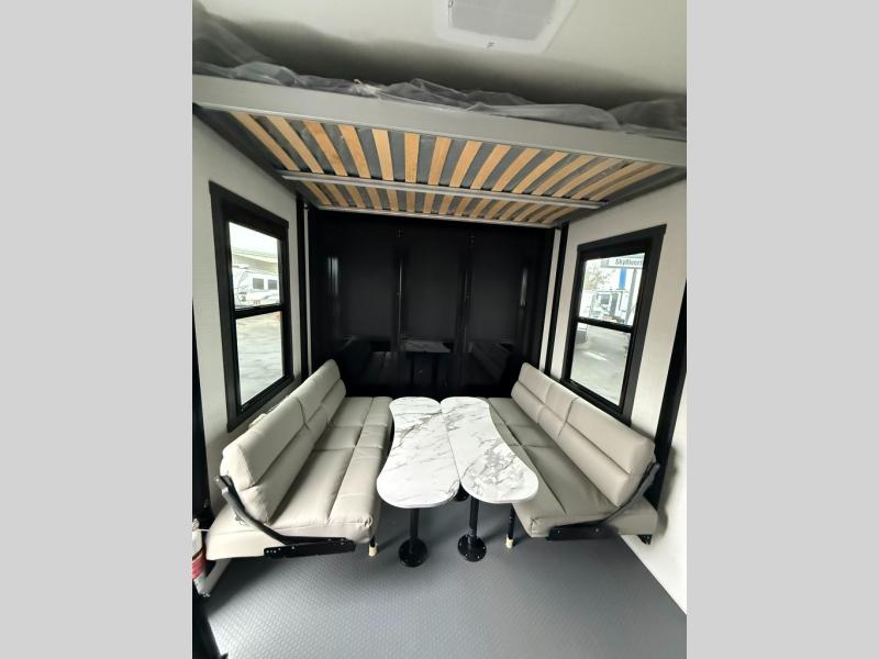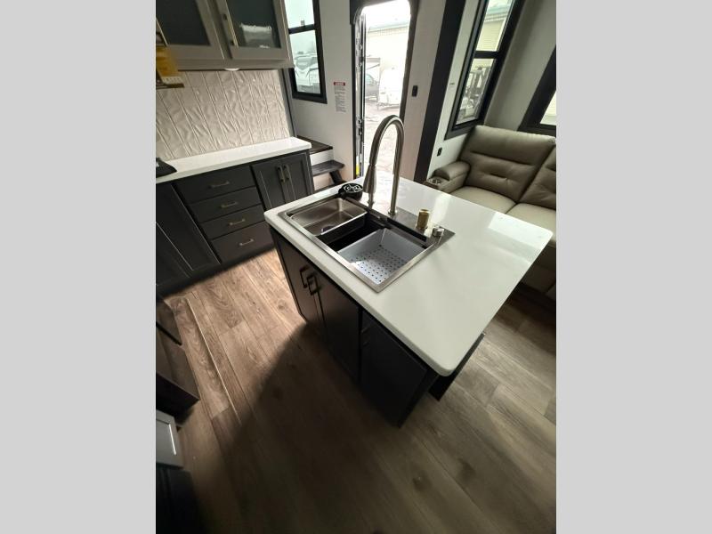 This 40G17 model is built for both adventure and comfort, starting with an expansive 17-foot garage that provides ample space for all your toys. Inside the garage, you’ll find a versatile Happi-Jack dinette with a removable table, perfect for meals or hanging out, and a Happi-Jack queen bed system that offers additional sleeping space when needed. One of the unit's two entry doors is also conveniently located here along with a half bath. In the middle living area, one of the three slide-outs houses the large sofa, centered across a cozy fireplace and a 55-inch TV ideal for relaxing after a long day. The kitchen is designed for functionality, featuring an island with a double sink, a 16 cu.ft. refrigerator, microwave, and a large 20-cu.ft. pantry to keep all your snacks and essentials organized. Toward the front, you’ll find the full bathroom and a private bedroom that includes a king bed, spacious wardrobe and dresser, offering plenty of storage for clothes and personal items, making this toy hauler the perfect home on the road.