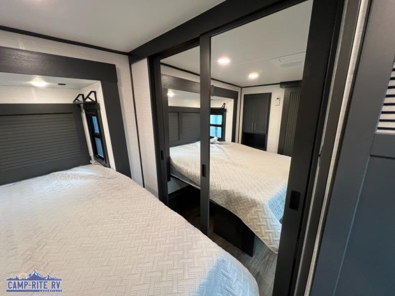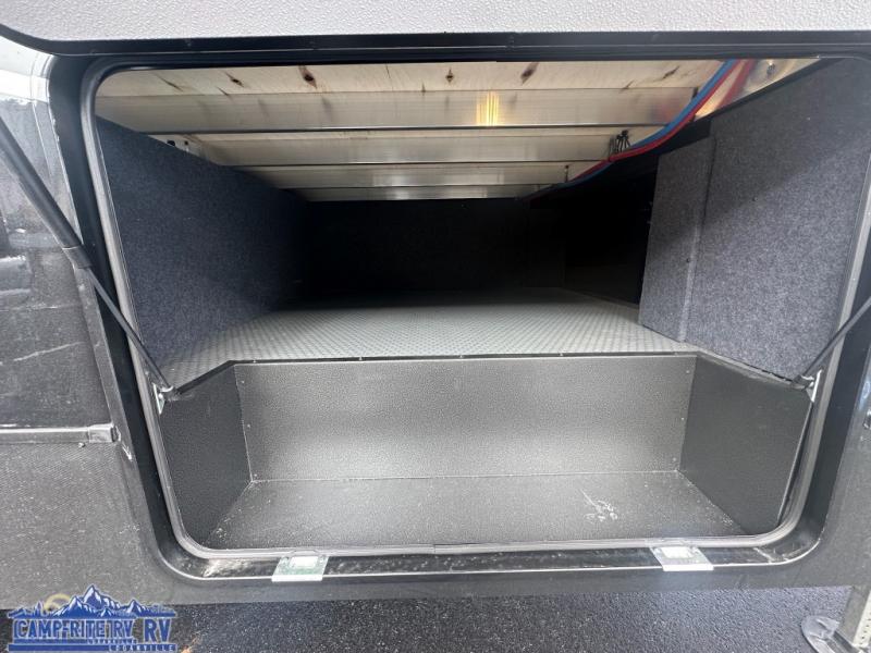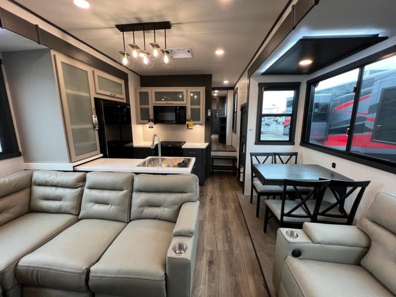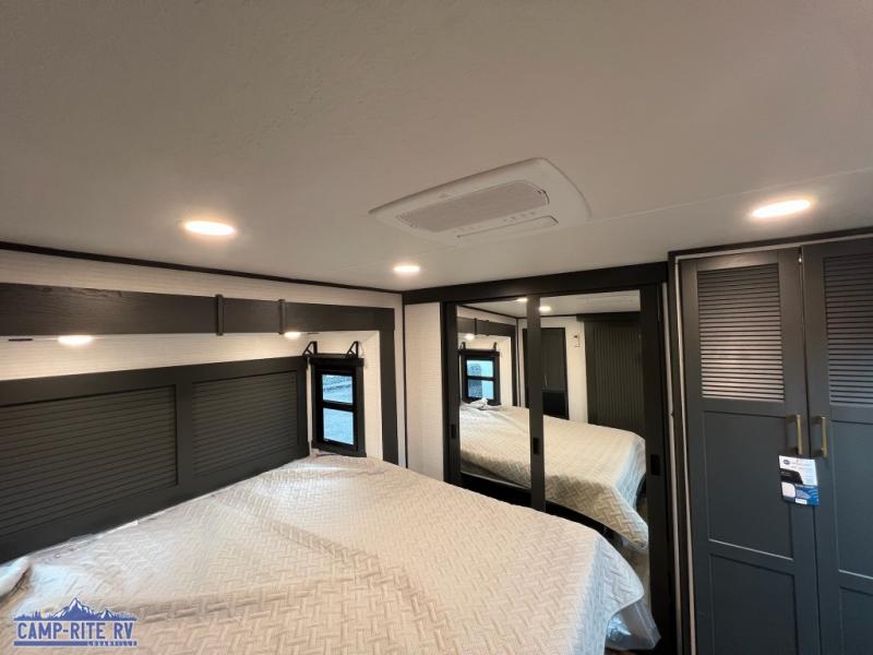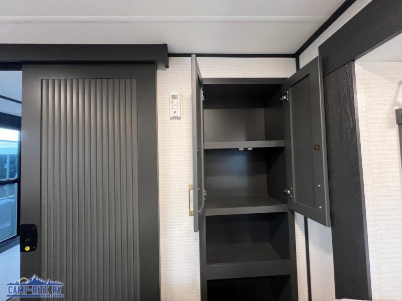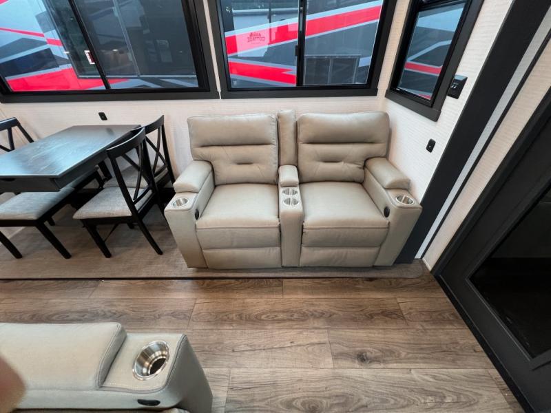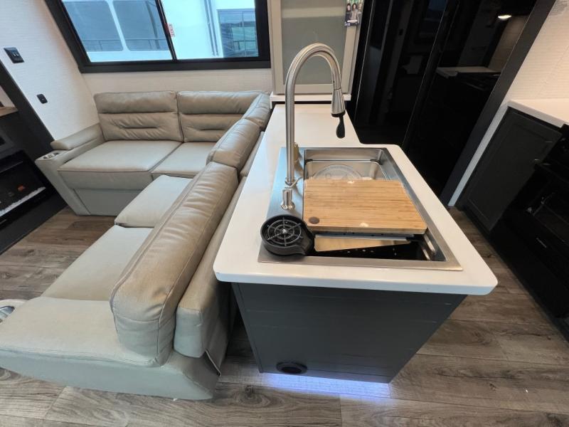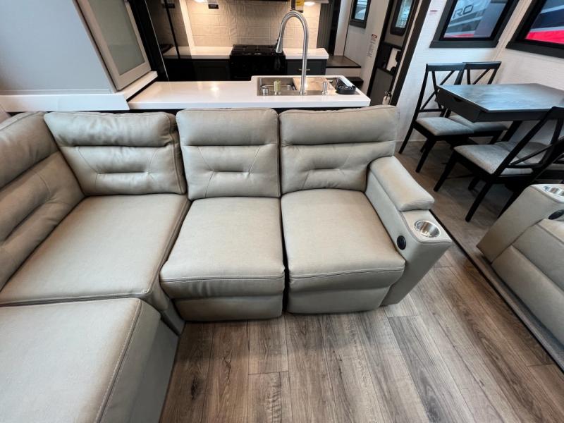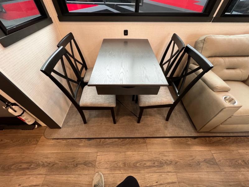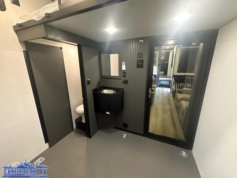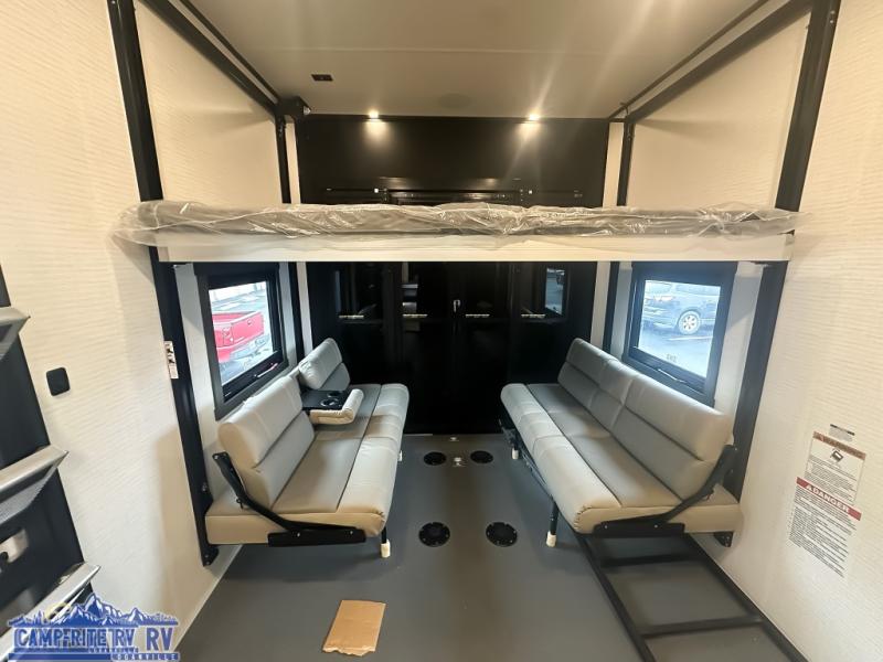 When you're ready to kick up some mud, hitch this toy hauler up and head out! You can set up the patio deck once your toys are removed from the 14' separate garage and relax with a cold drink. You'll find seating space on the Sit N Sleep roll-over sofas with a removable dinette table in between, and the Sleep N Store electric queen bed will provide sleeping space for your guests. There is also a loft and a half bath for even more convenience. Head through the garage glass sliding doors to the living area with an L-shaped sofa and theater seating, or start lunch in the shared middle kitchen with ample counter space. There is even a free-standing table and chairs like you would find at home. The full bath up front lets you clean up after a trail ride and the front private bedroom will have you feeling right at home. A king bed slide out comes standard, along with a large front wardrobe with washer and dryer prep, plus a dresser and TV backer if you want to add your own TV.