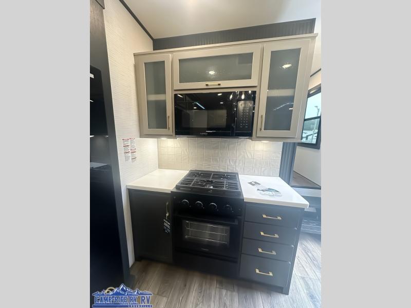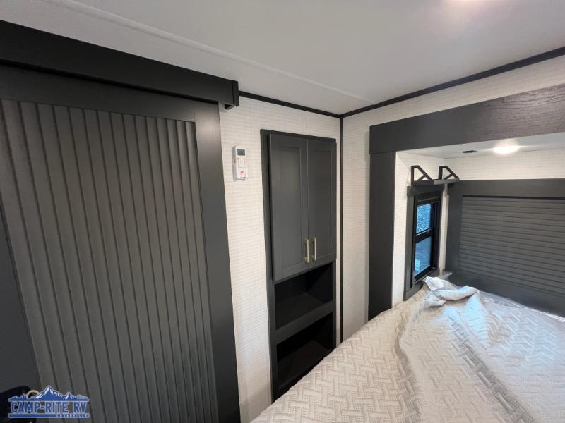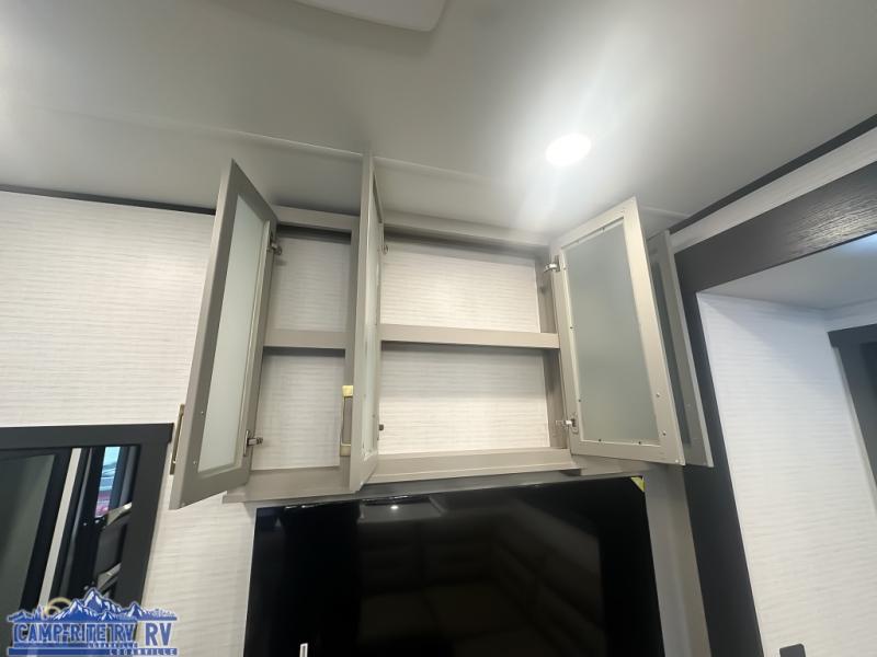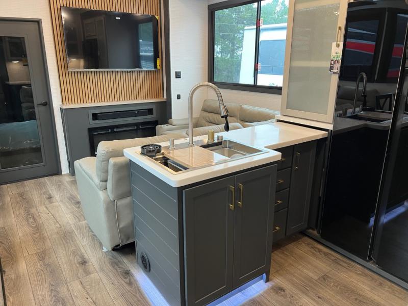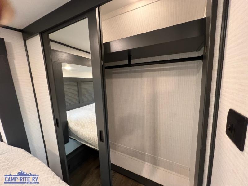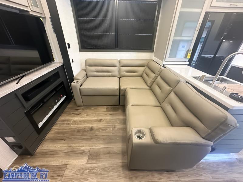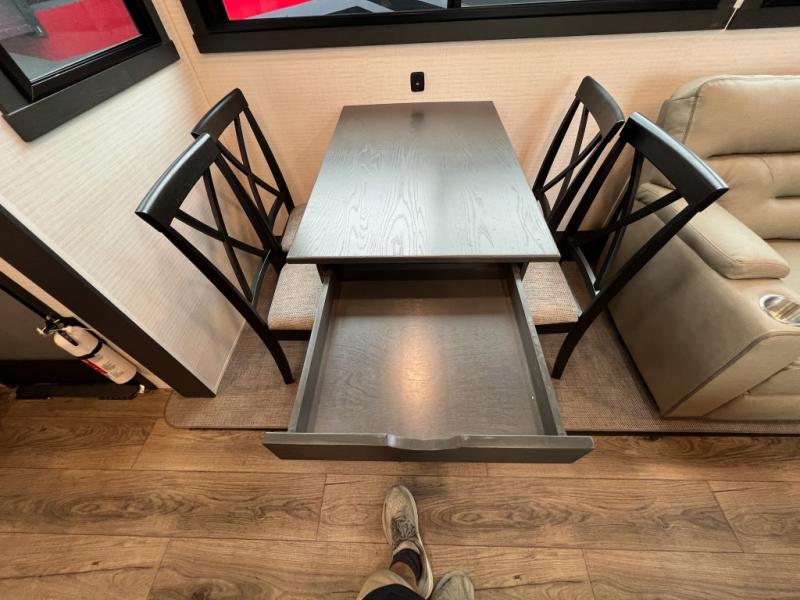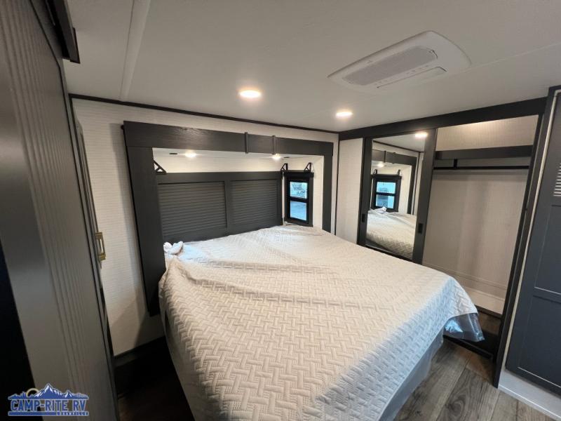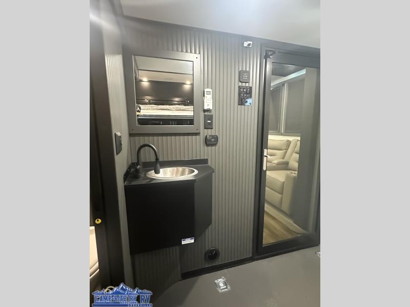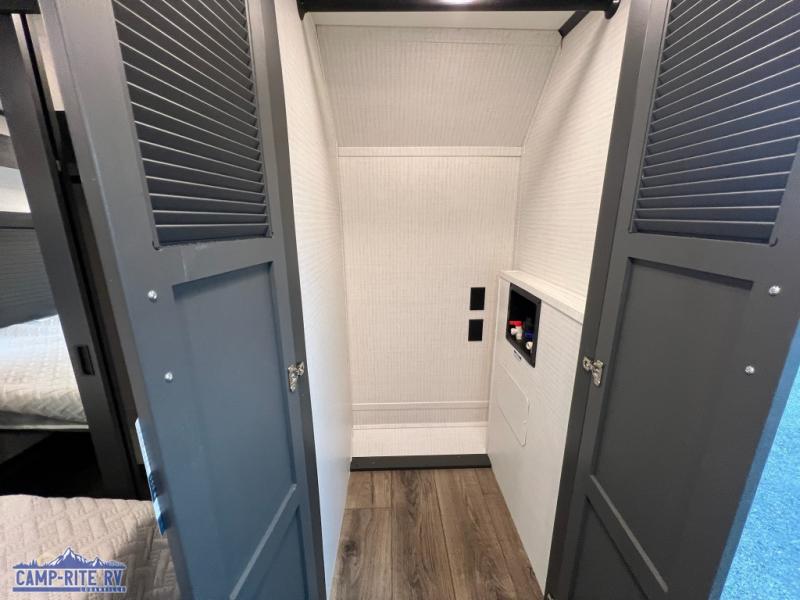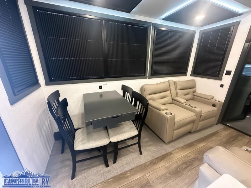 When you're ready to kick up some mud, hitch this toy hauler up and head out! You can set up the patio deck once your toys are removed from the 14' separate garage and relax with a cold drink. You'll find seating space on the Sit N Sleep roll-over sofas with a removable dinette table in between, and the Sleep N Store electric queen bed will provide sleeping space for your guests. There is also a loft and a half bath for even more convenience. Head through the garage glass sliding doors to the living area with an L-shaped sofa and theater seating, or start lunch in the shared middle kitchen with ample counter space. There is even a free-standing table and chairs like you would find at home. The full bath up front lets you clean up after a trail ride and the front private bedroom will have you feeling right at home. A king bed slide out comes standard, along with a large front wardrobe with washer and dryer prep, plus a dresser and TV backer if you want to add your own TV.