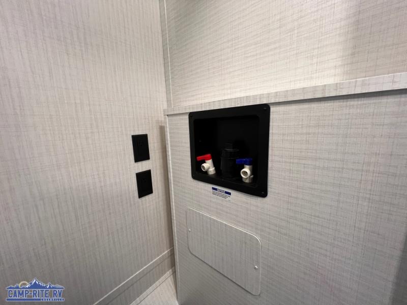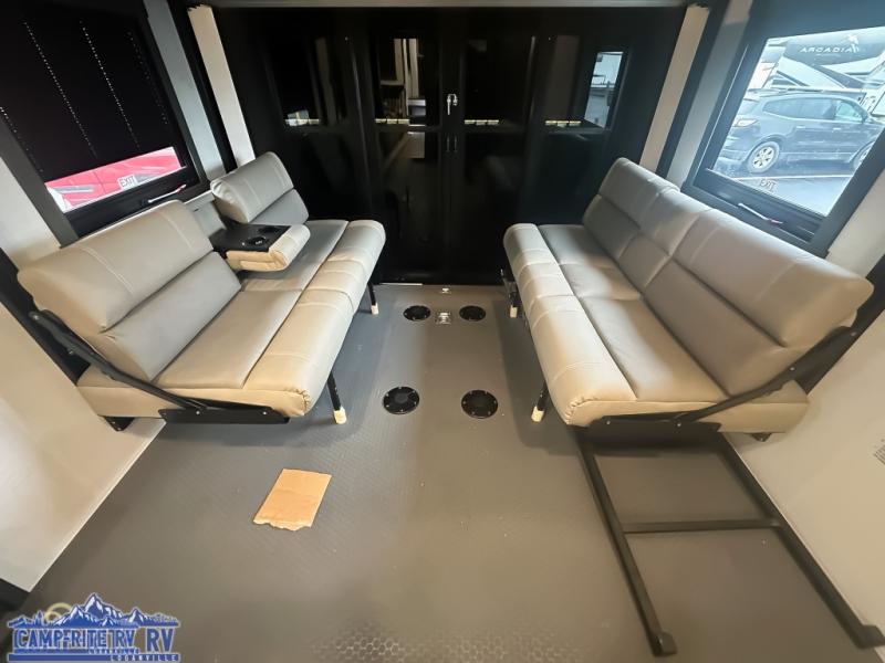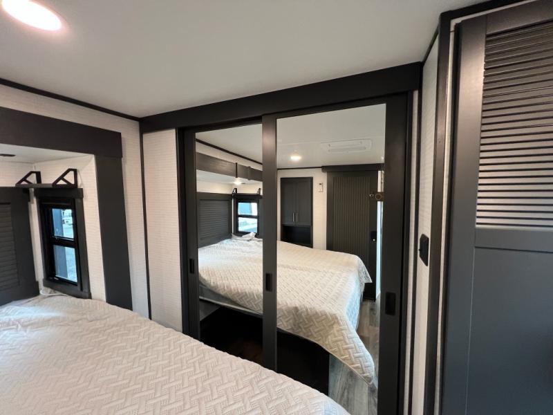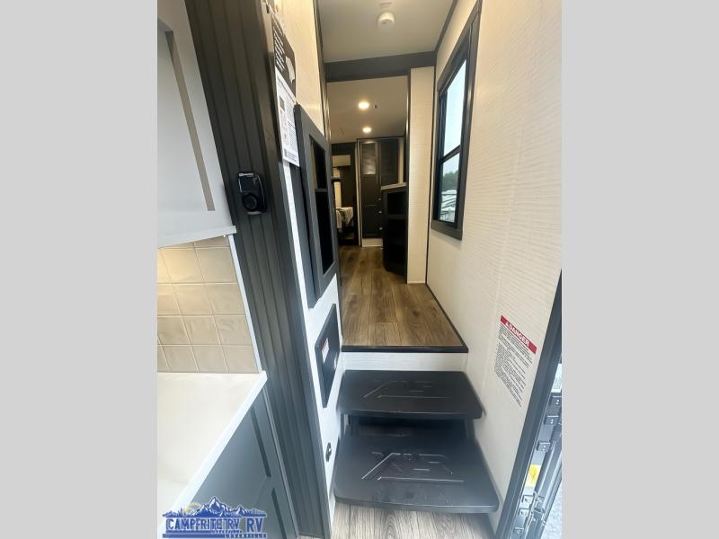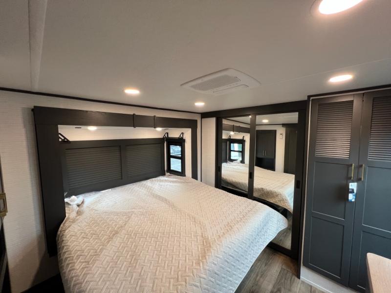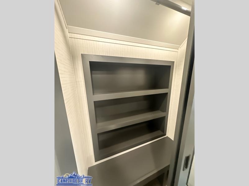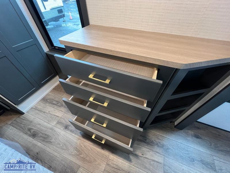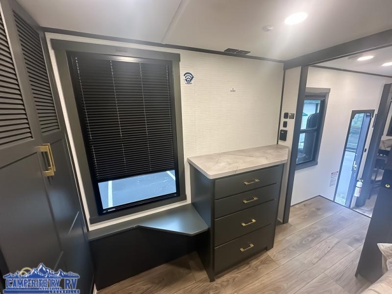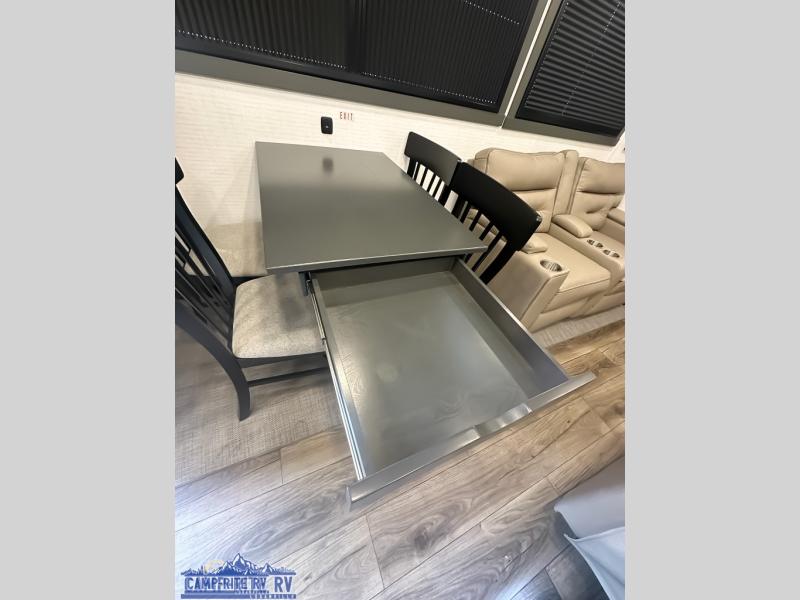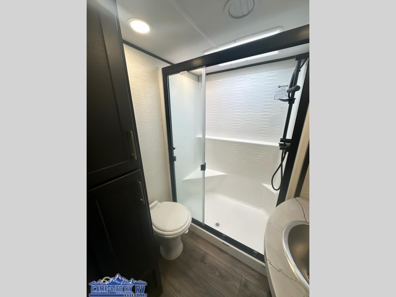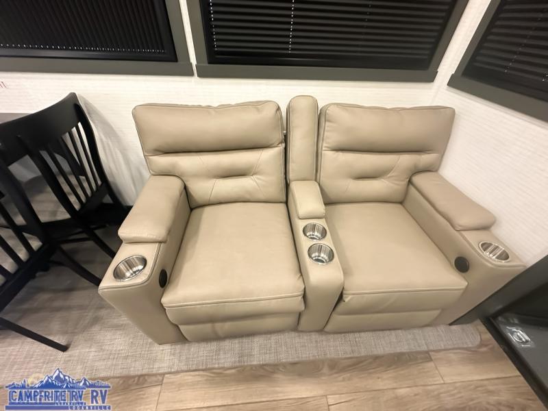 When you're ready to kick up some mud, hitch this toy hauler up and head out! You can set up the patio deck once your toys are removed from the 14' separate garage and relax with a cold drink. You'll find seating space on the Sit N Sleep roll-over sofas with a removable dinette table in between, and the Sleep N Store electric queen bed will provide sleeping space for your guests. There is also a loft and a half bath for even more convenience. Head through the garage glass sliding doors to the living area with an L-shaped sofa and theater seating, or start lunch in the shared middle kitchen with ample counter space. There is even a free-standing table and chairs like you would find at home. The full bath up front lets you clean up after a trail ride and the front private bedroom will have you feeling right at home. A king bed slide out comes standard, along with a large front wardrobe with washer and dryer prep, plus a dresser and TV backer if you want to add your own TV.