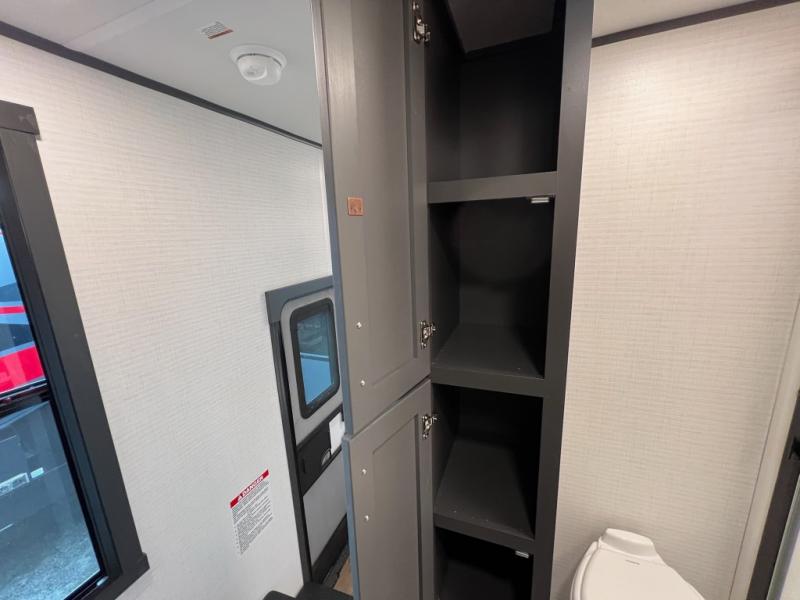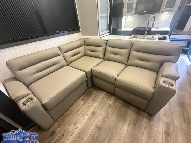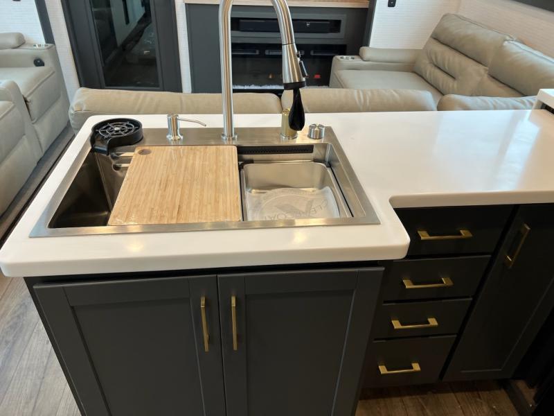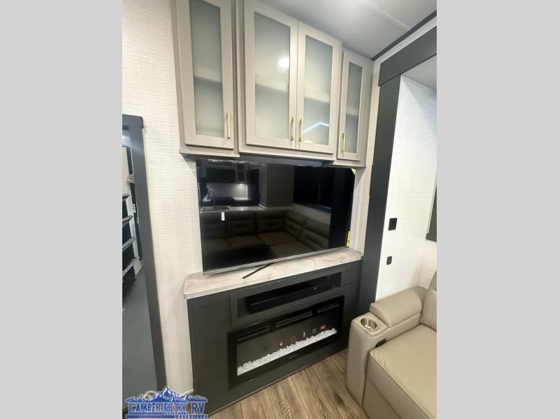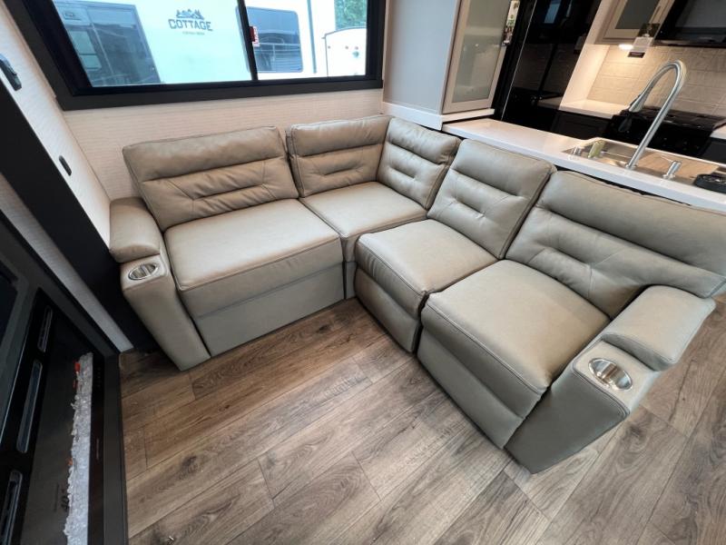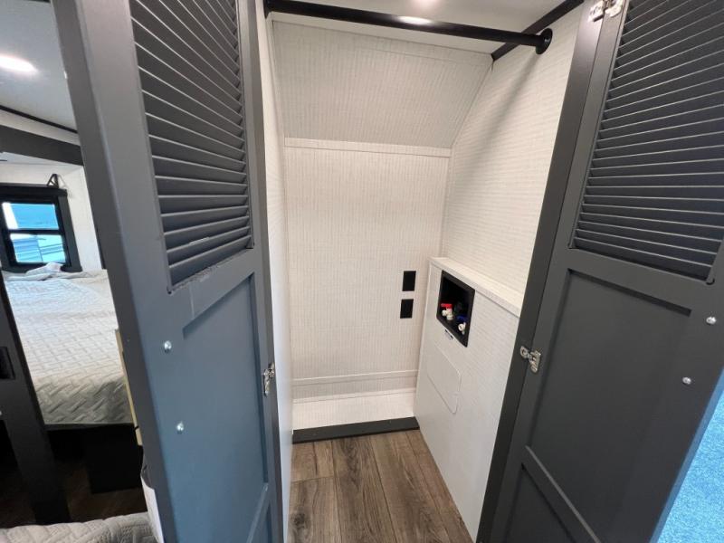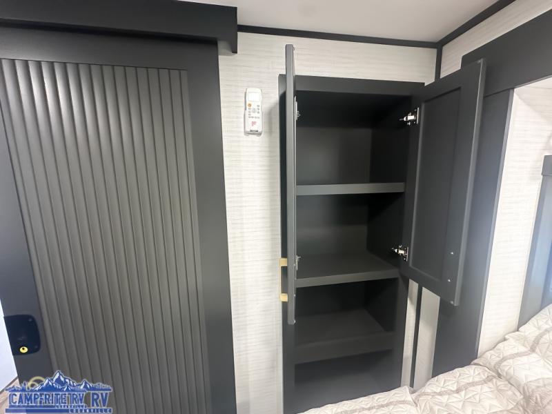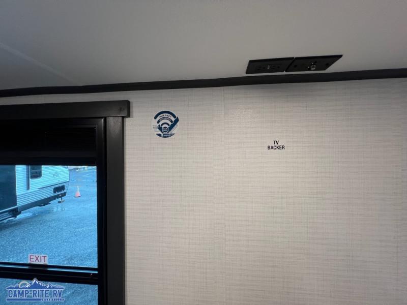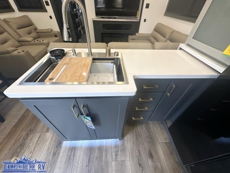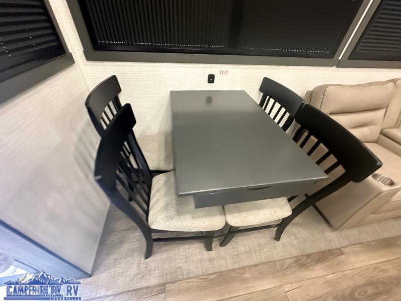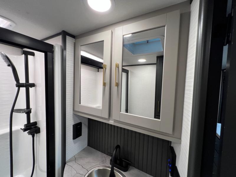 When you're ready to kick up some mud, hitch this toy hauler up and head out! You can set up the patio deck once your toys are removed from the 14' separate garage and relax with a cold drink. You'll find seating space on the Sit N Sleep roll-over sofas with a removable dinette table in between, and the Sleep N Store electric queen bed will provide sleeping space for your guests. There is also a loft and a half bath for even more convenience. Head through the garage glass sliding doors to the living area with an L-shaped sofa and theater seating, or start lunch in the shared middle kitchen with ample counter space. There is even a free-standing table and chairs like you would find at home. The full bath up front lets you clean up after a trail ride and the front private bedroom will have you feeling right at home. A king bed slide out comes standard, along with a large front wardrobe with washer and dryer prep, plus a dresser and TV backer if you want to add your own TV.