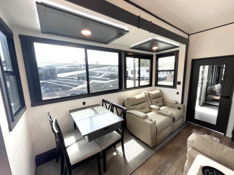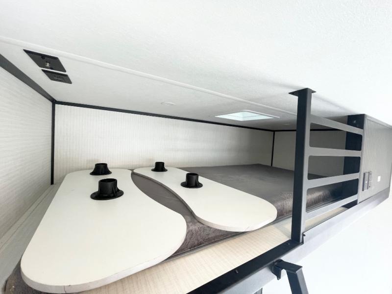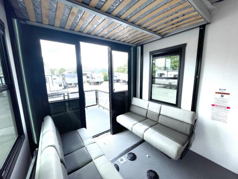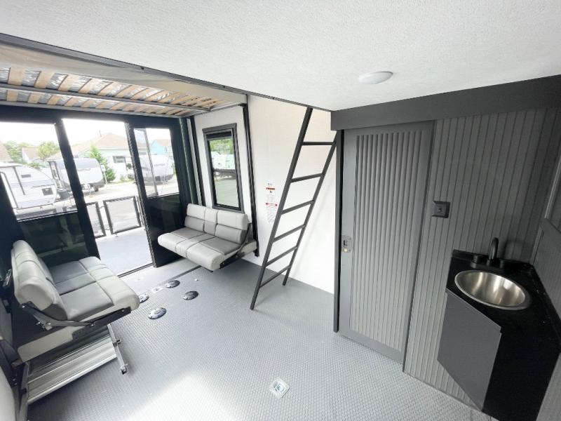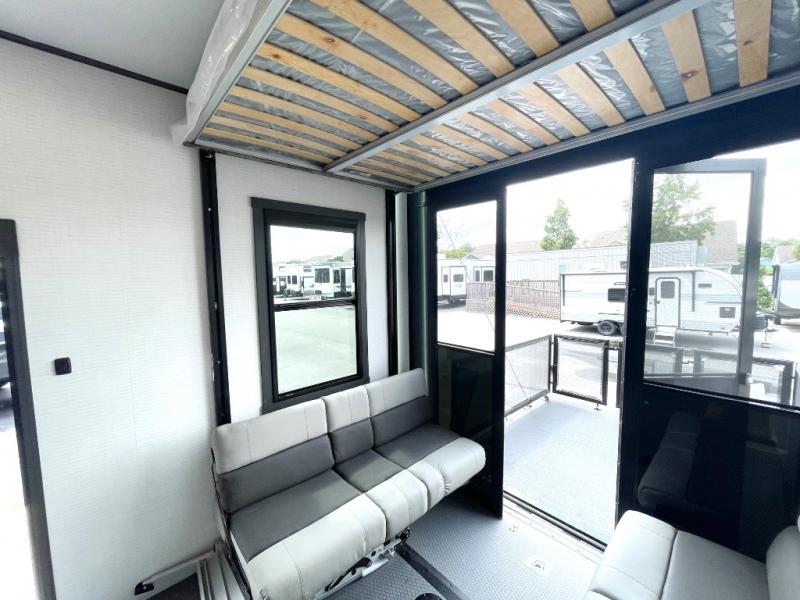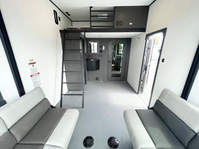 When you're ready to kick up some mud, hitch this toy hauler up and head out! You can set up the patio deck once your toys are removed from the 14' separate garage and relax with a cold drink. You'll find seating space on the Sit N Sleep roll-over sofas with a removable dinette table in between, and the Sleep N Store electric queen bed will provide sleeping space for your guests. There is also a loft and a half bath for even more convenience. Head through the garage glass sliding doors to the living area with an L-shaped sofa and theater seating, or start lunch in the shared middle kitchen with ample counter space. There is even a free-standing table and chairs like you would find at home. The full bath up front lets you clean up after a trail ride and the front private bedroom will have you feeling right at home. A king bed slide out comes standard, along with a large front wardrobe with washer and dryer prep, plus a dresser and TV backer if you want to add your own TV.