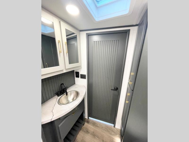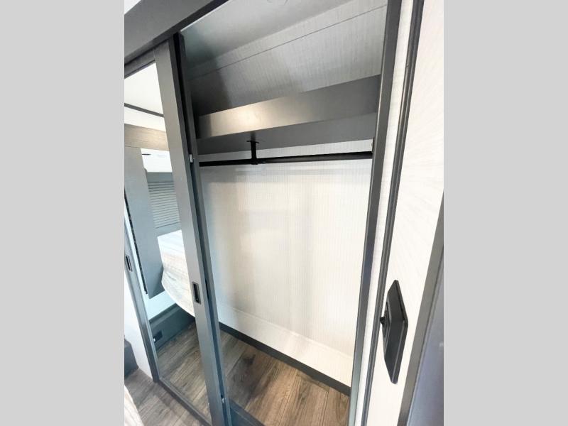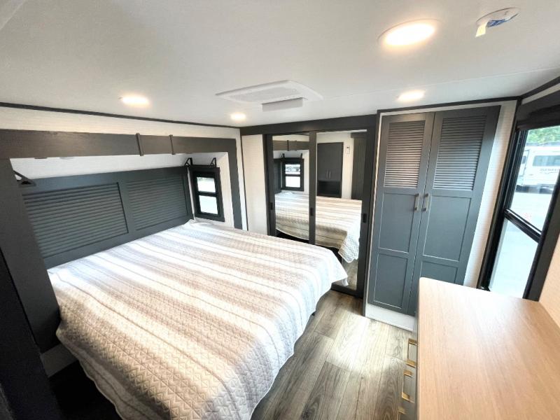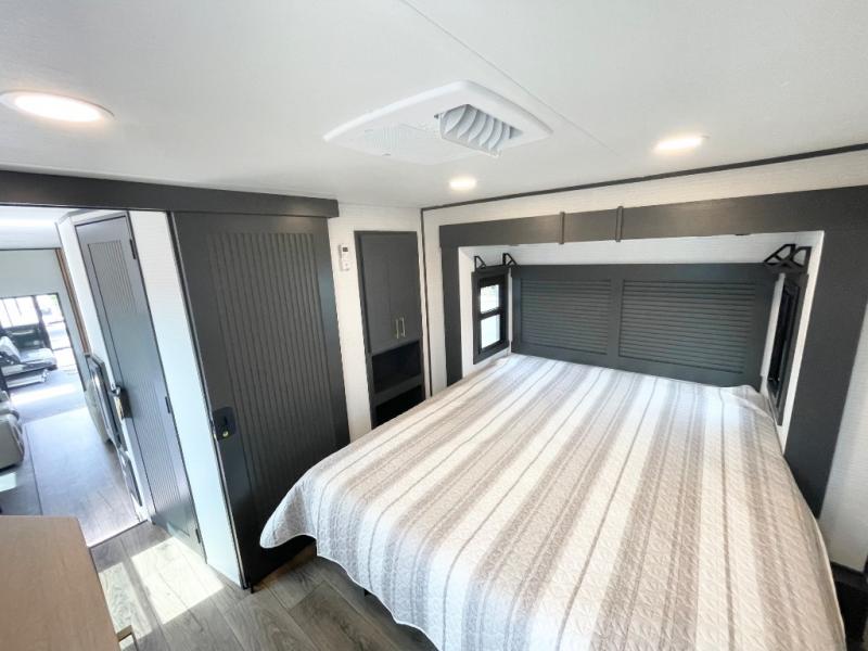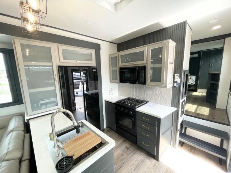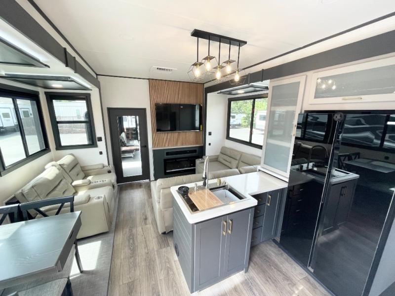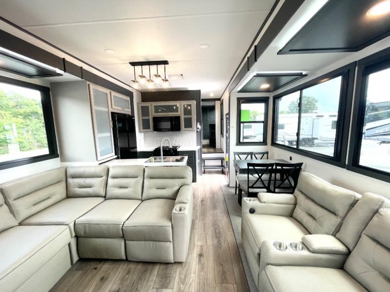 When you're ready to kick up some mud, hitch this toy hauler up and head out! You can set up the patio deck once your toys are removed from the 14' separate garage and relax with a cold drink. You'll find seating space on the Sit N Sleep roll-over sofas with a removable dinette table in between, and the Sleep N Store electric queen bed will provide sleeping space for your guests. There is also a loft and a half bath for even more convenience. Head through the garage glass sliding doors to the living area with an L-shaped sofa and theater seating, or start lunch in the shared middle kitchen with ample counter space. There is even a free-standing table and chairs like you would find at home. The full bath up front lets you clean up after a trail ride and the front private bedroom will have you feeling right at home. A king bed slide out comes standard, along with a large front wardrobe with washer and dryer prep, plus a dresser and TV backer if you want to add your own TV.