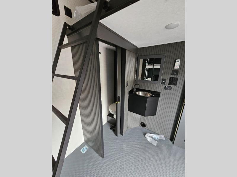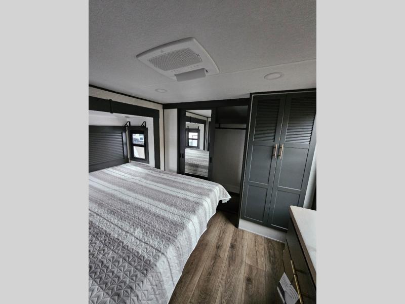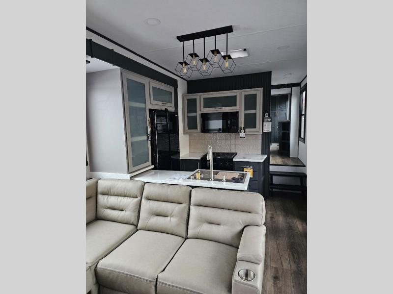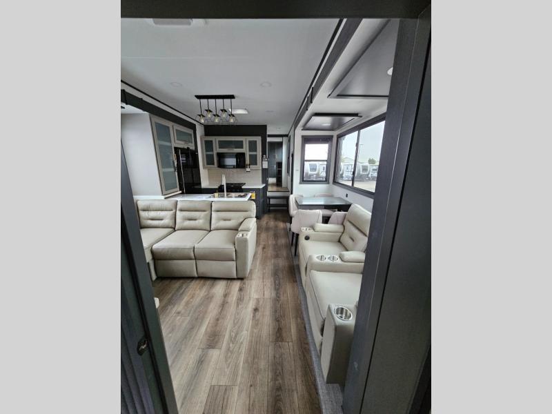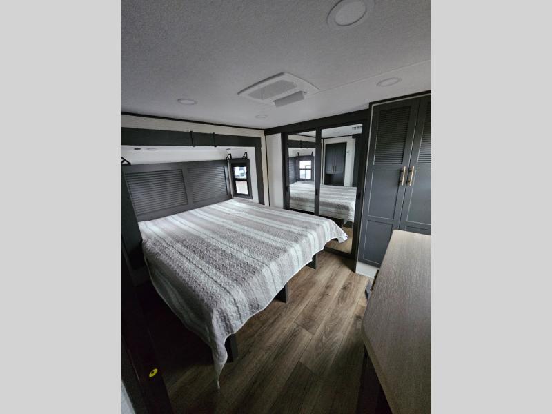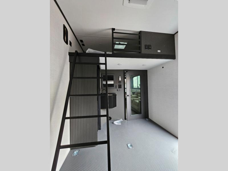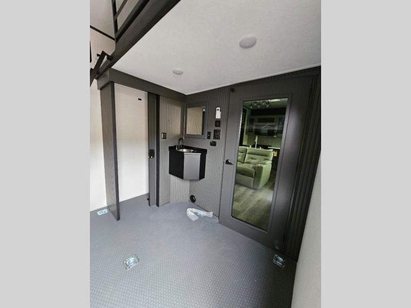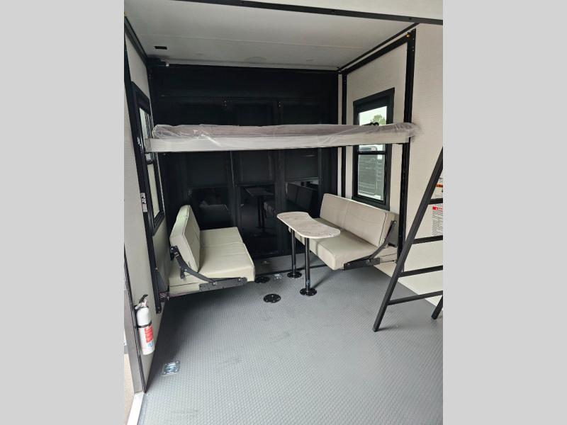 When you're ready to kick up some mud, hitch this toy hauler up and head out! You can set up the patio deck once your toys are removed from the 14' separate garage and relax with a cold drink. You'll find seating space on the Sit N Sleep roll-over sofas with a removable dinette table in between, and the Sleep N Store electric queen bed will provide sleeping space for your guests. There is also a loft and a half bath for even more convenience. Head through the garage glass sliding doors to the living area with an L-shaped sofa and theater seating or start lunch in the middle kitchen with ample counter space. There is even a free-standing table and chairs like you would find at home. The full bath up front lets you clean up after a trail ride and the front private bedroom will have you feeling right at home. With a 66" x 80" king bed slide out, along with a large front wardrobe with washer and dryer prep, plus a dresser and TV backer if you want to add your own TV.