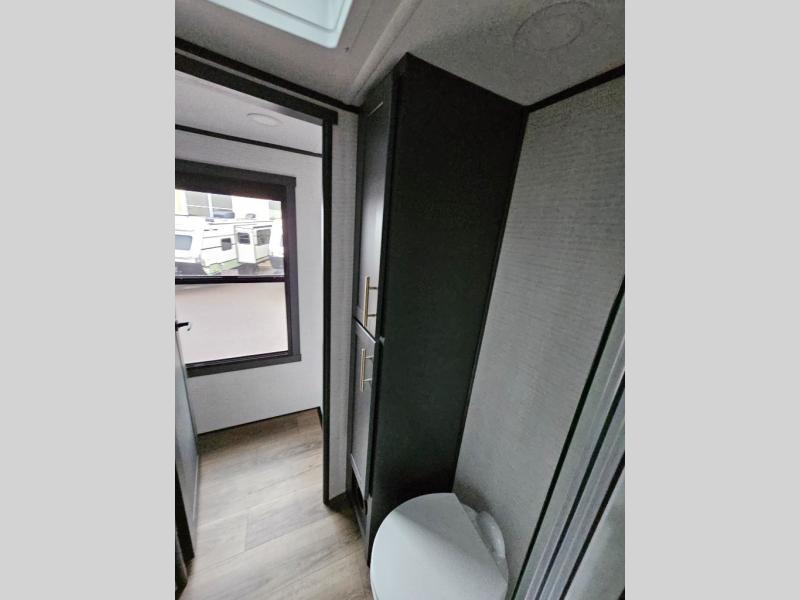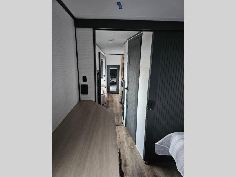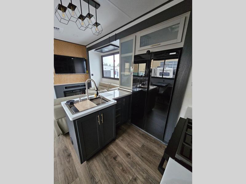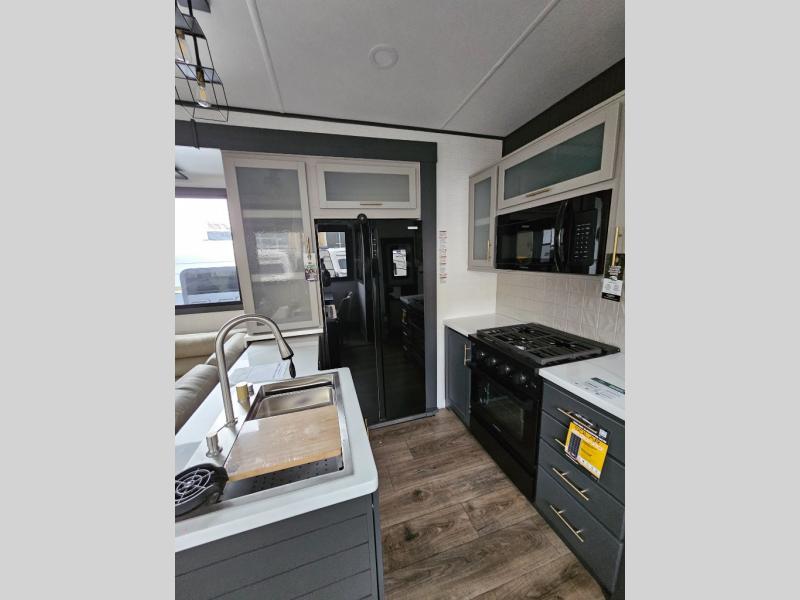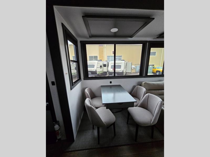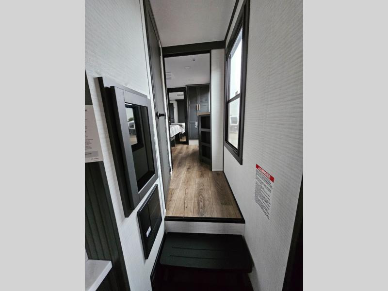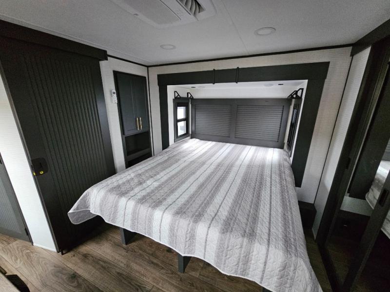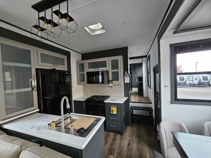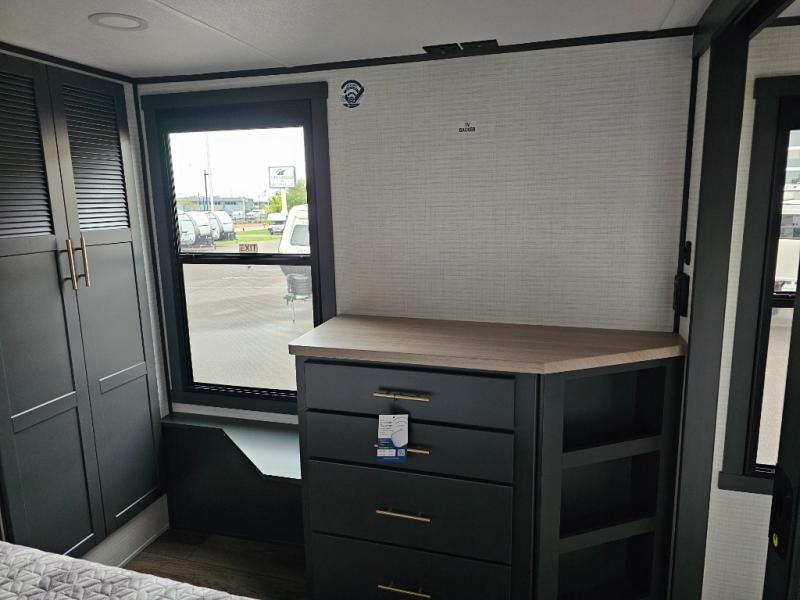 When you're ready to kick up some mud, hitch this toy hauler up and head out! You can set up the patio deck once your toys are removed from the 14' separate garage and relax with a cold drink. You'll find seating space on the Sit N Sleep roll-over sofas with a removable dinette table in between, and the Sleep N Store electric queen bed will provide sleeping space for your guests. There is also a loft and a half bath for even more convenience. Head through the garage glass sliding doors to the living area with an L-shaped sofa and theater seating or start lunch in the middle kitchen with ample counter space. There is even a free-standing table and chairs like you would find at home. The full bath up front lets you clean up after a trail ride and the front private bedroom will have you feeling right at home. With a 66" x 80" king bed slide out, along with a large front wardrobe with washer and dryer prep, plus a dresser and TV backer if you want to add your own TV.