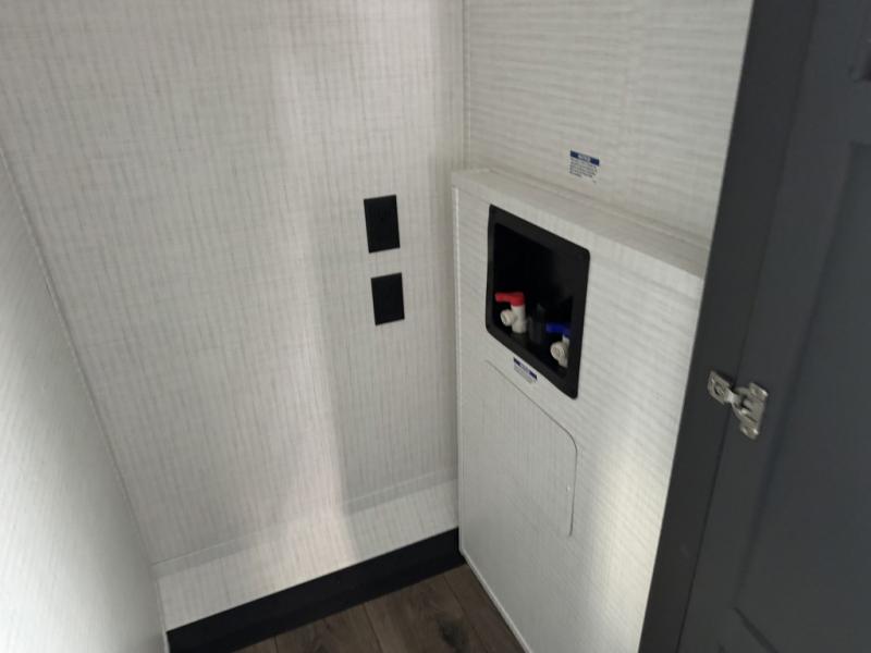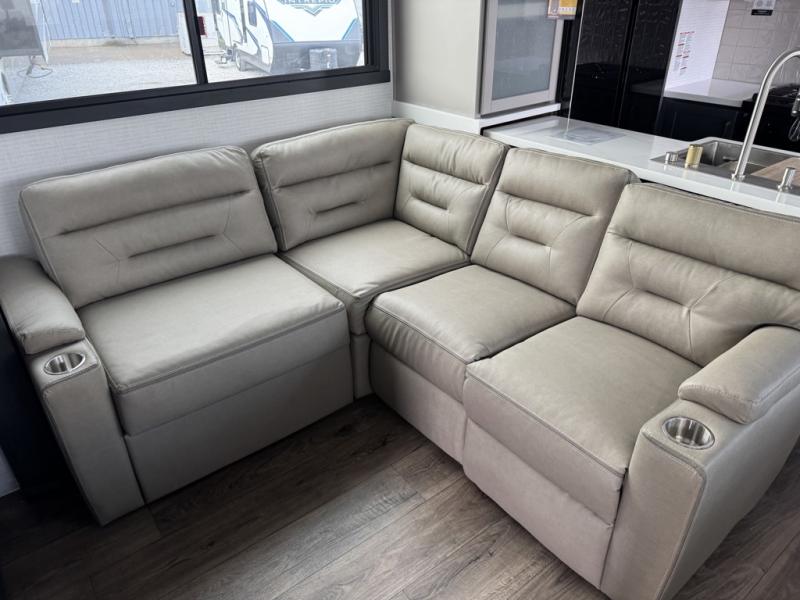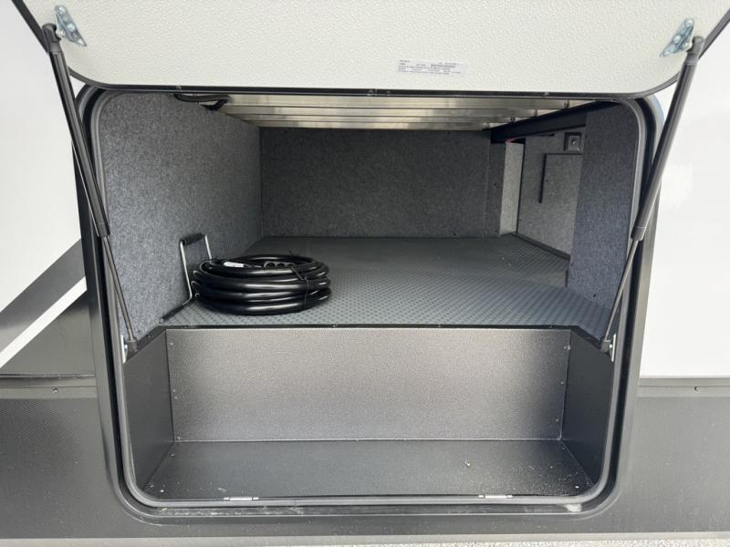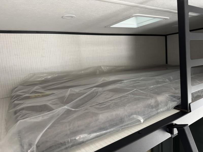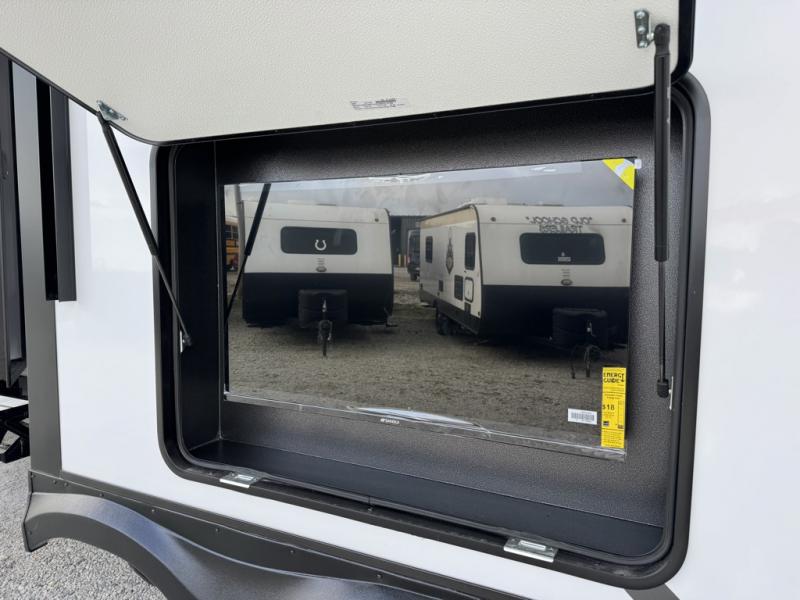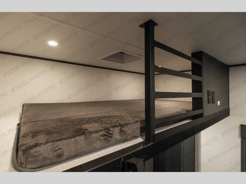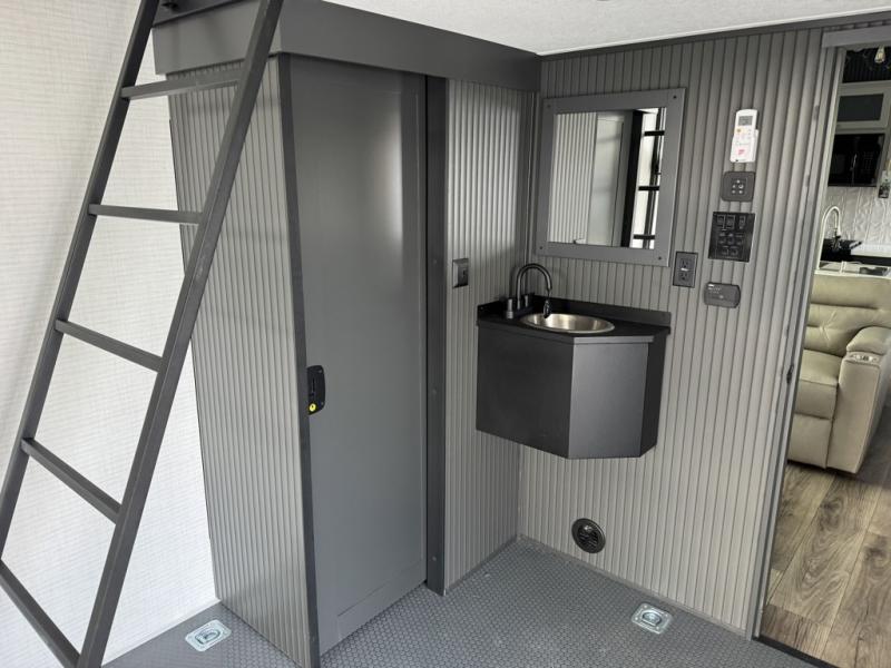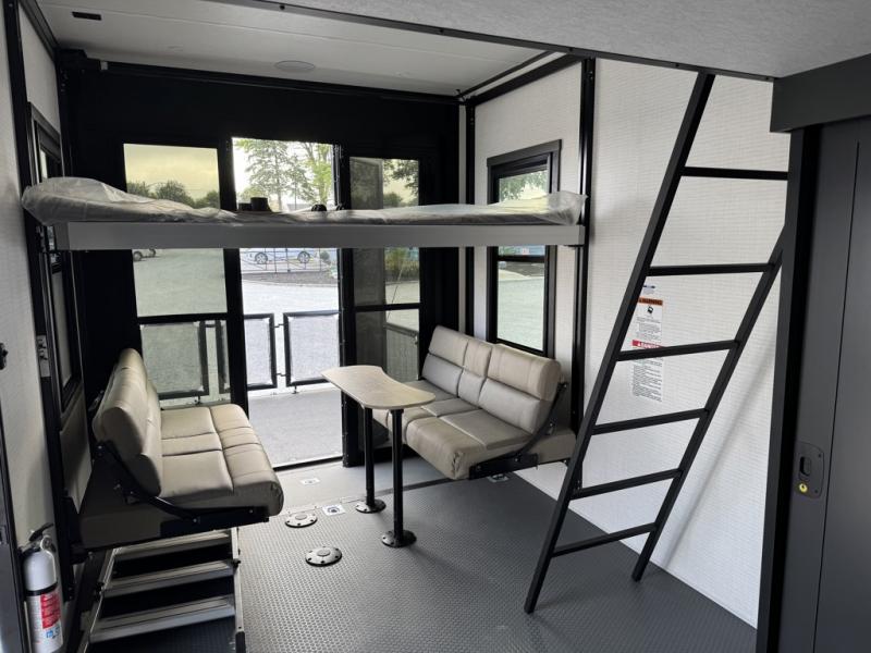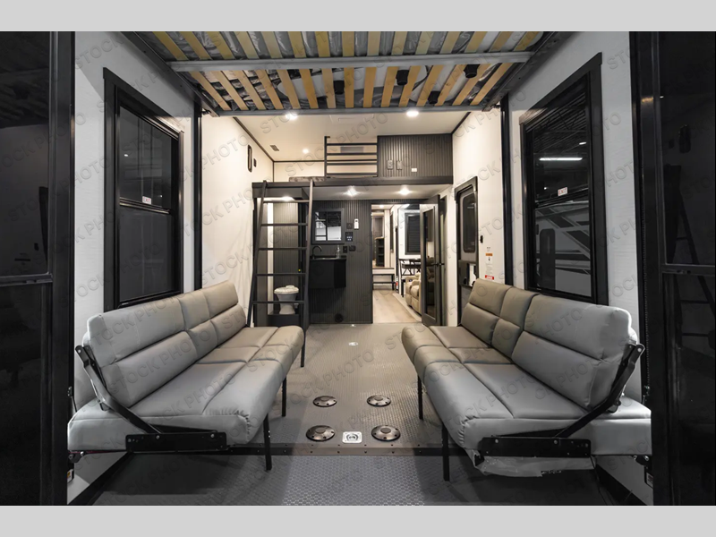 When you're ready to kick up some mud, hitch this toy hauler up and head out! You can set up the patio deck once your toys are removed from the 14' separate garage and relax with a cold drink. You'll find seating space on the Sit N Sleep roll-over sofas with a removable dinette table in between, and the Sleep N Store electric queen bed will provide sleeping space for your guests. There is also a loft and a half bath for even more convenience. Head through the garage glass sliding doors to the living area with an L-shaped sofa and theater seating or start lunch in the middle kitchen with ample counter space. There is even a free-standing table and chairs like you would find at home. The full bath up front lets you clean up after a trail ride and the front private bedroom will have you feeling right at home. With a 66" x 80" king bed slide out, along with a large front wardrobe with washer and dryer prep, plus a dresser and TV backer if you want to add your own TV.