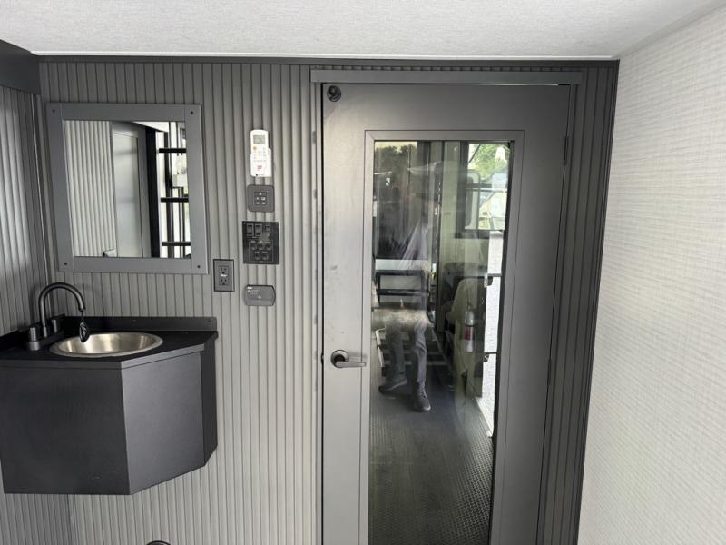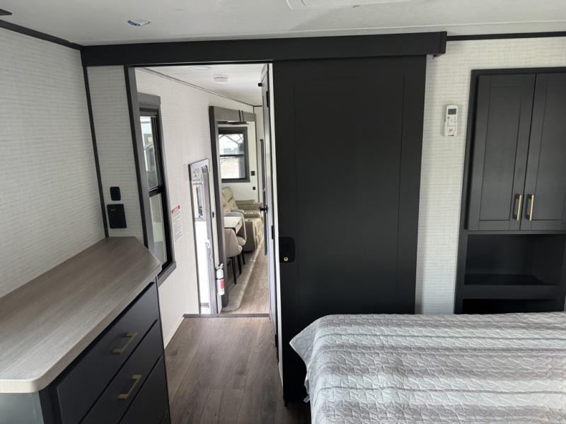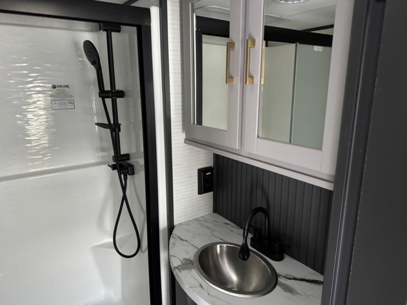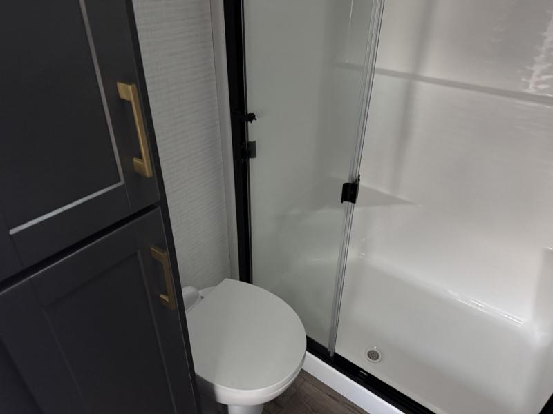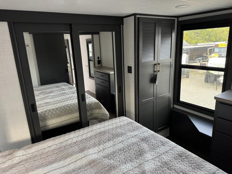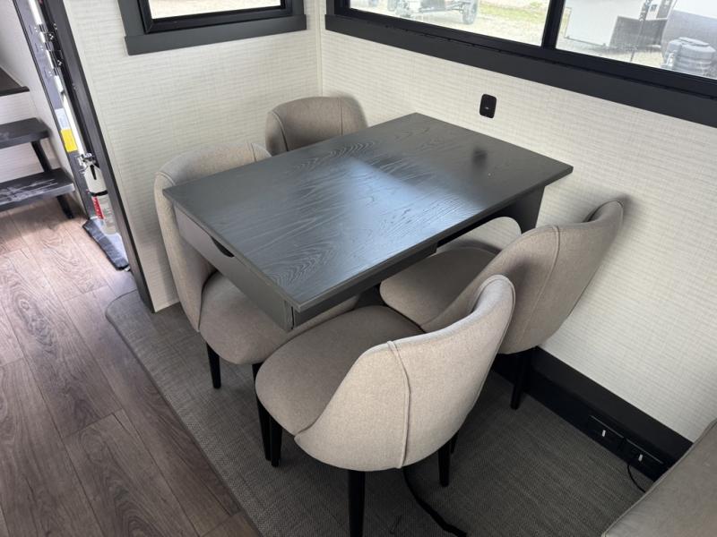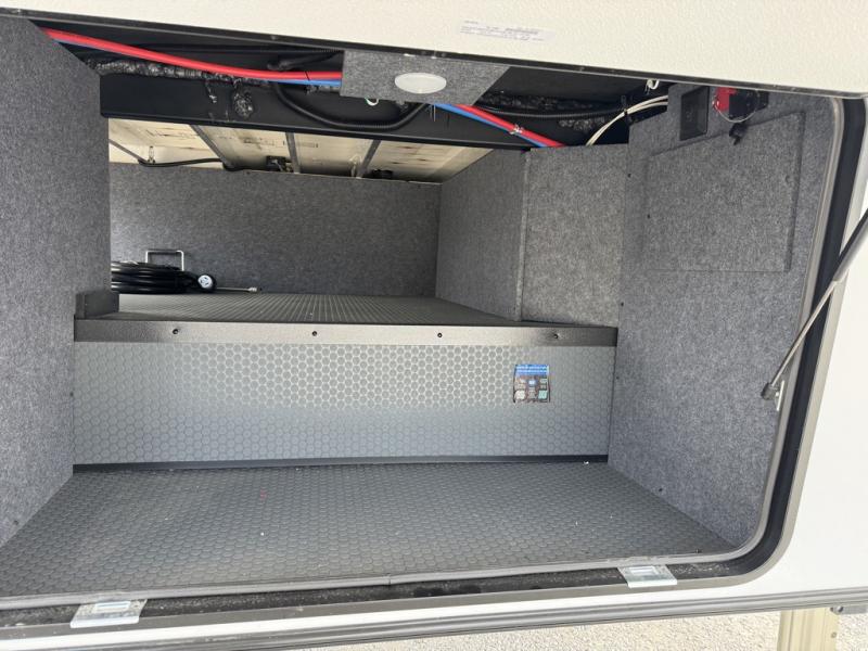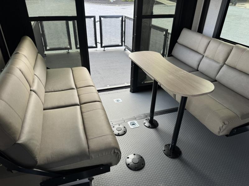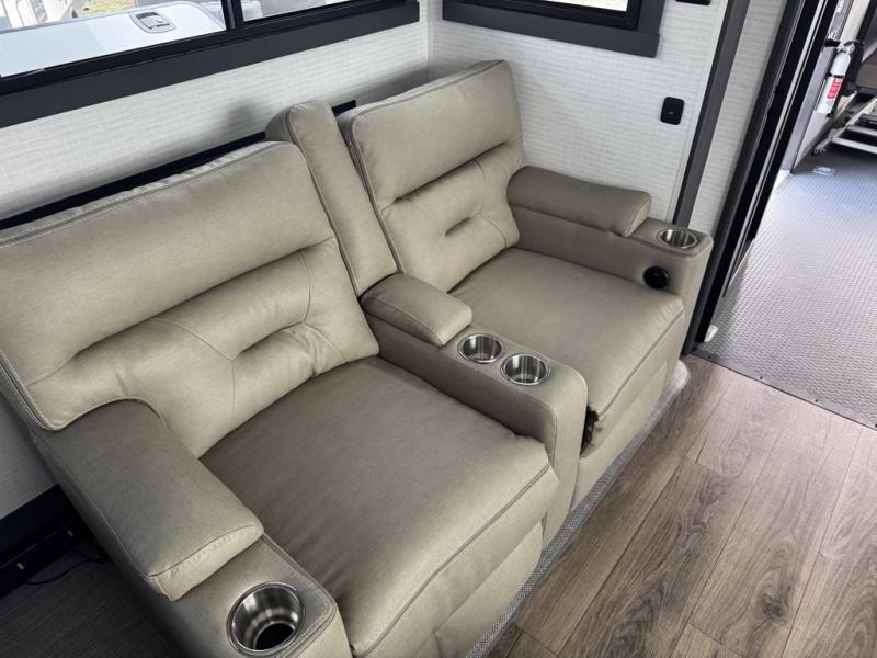 When you're ready to kick up some mud, hitch this toy hauler up and head out! You can set up the patio deck once your toys are removed from the 14' separate garage and relax with a cold drink. You'll find seating space on the Sit N Sleep roll-over sofas with a removable dinette table in between, and the Sleep N Store electric queen bed will provide sleeping space for your guests. There is also a loft and a half bath for even more convenience. Head through the garage glass sliding doors to the living area with an L-shaped sofa and theater seating or start lunch in the middle kitchen with ample counter space. There is even a free-standing table and chairs like you would find at home. The full bath up front lets you clean up after a trail ride and the front private bedroom will have you feeling right at home. With a 66" x 80" king bed slide out, along with a large front wardrobe with washer and dryer prep, plus a dresser and TV backer if you want to add your own TV.