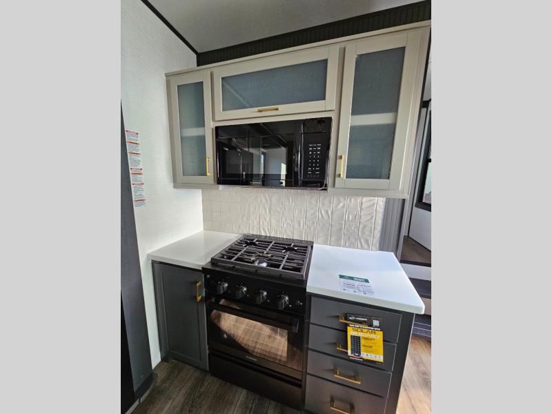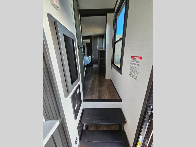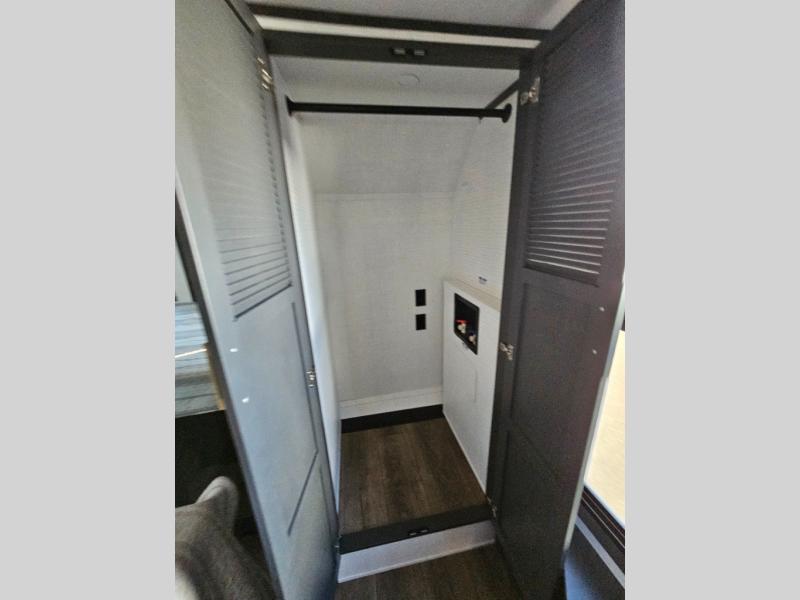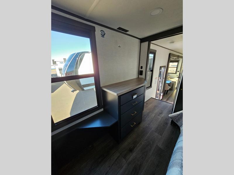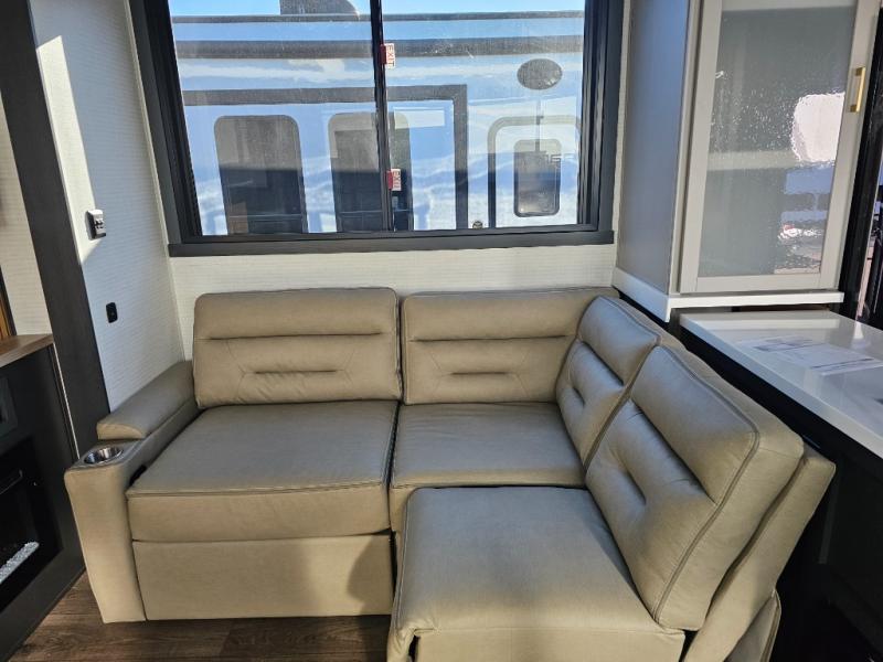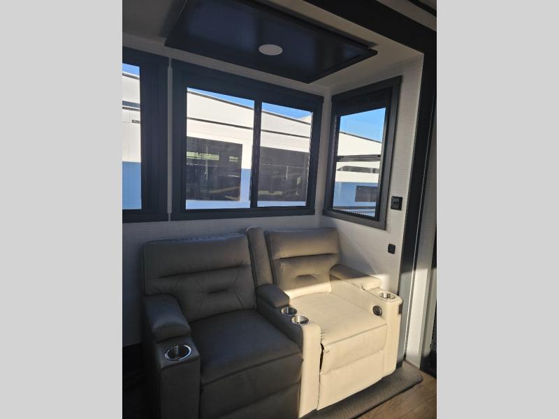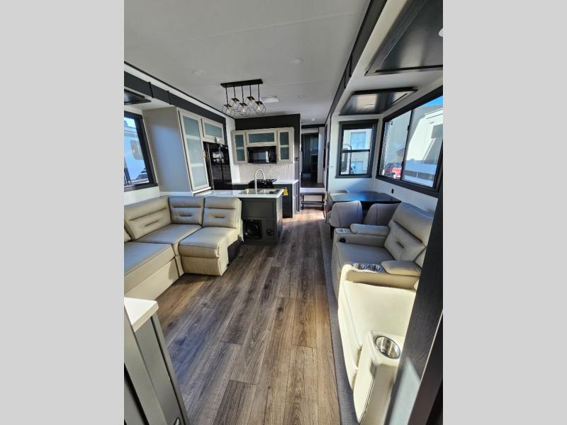 When you're ready to kick up some mud, hitch this toy hauler up and head out! You can set up the patio deck once your toys are removed from the 14' separate garage and relax with a cold drink. You'll find seating space on the Sit N Sleep roll-over sofas with a removable dinette table in between, and the Sleep N Store electric queen bed will provide sleeping space for your guests. There is also a loft and a half bath for even more convenience. Head through the garage glass sliding doors to the living area with an L-shaped sofa and theater seating or start lunch in the middle kitchen with ample counter space. There is even a free-standing table and chairs like you would find at home. The full bath up front lets you clean up after a trail ride and the front private bedroom will have you feeling right at home. With a 66" x 80" king bed slide out, along with a large front wardrobe with washer and dryer prep, plus a dresser and TV backer if you want to add your own TV.