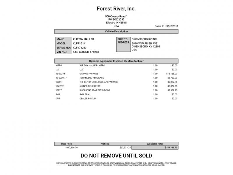 Forest River XLR Nitro toy hauler 41G14 highlights: