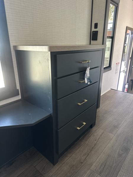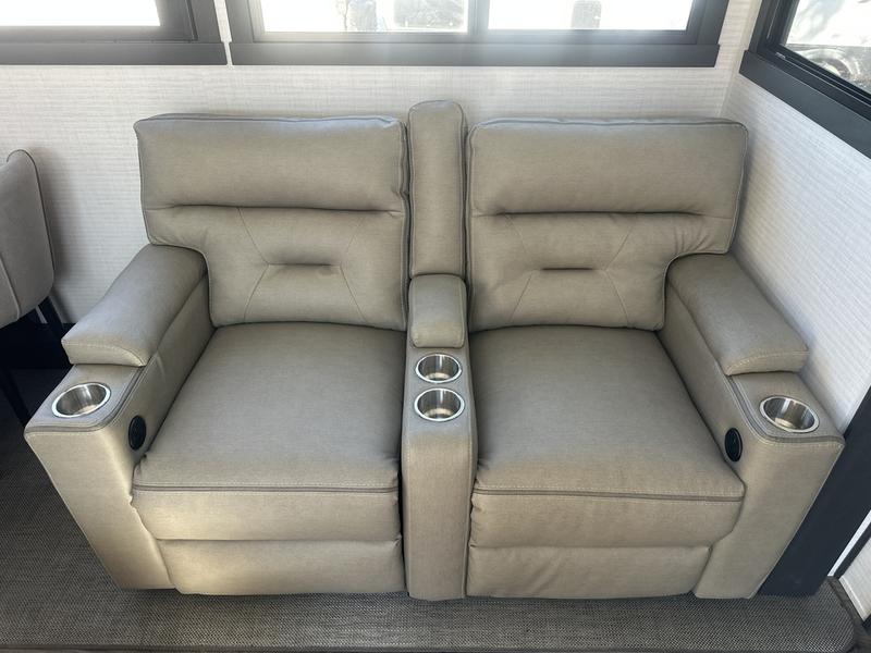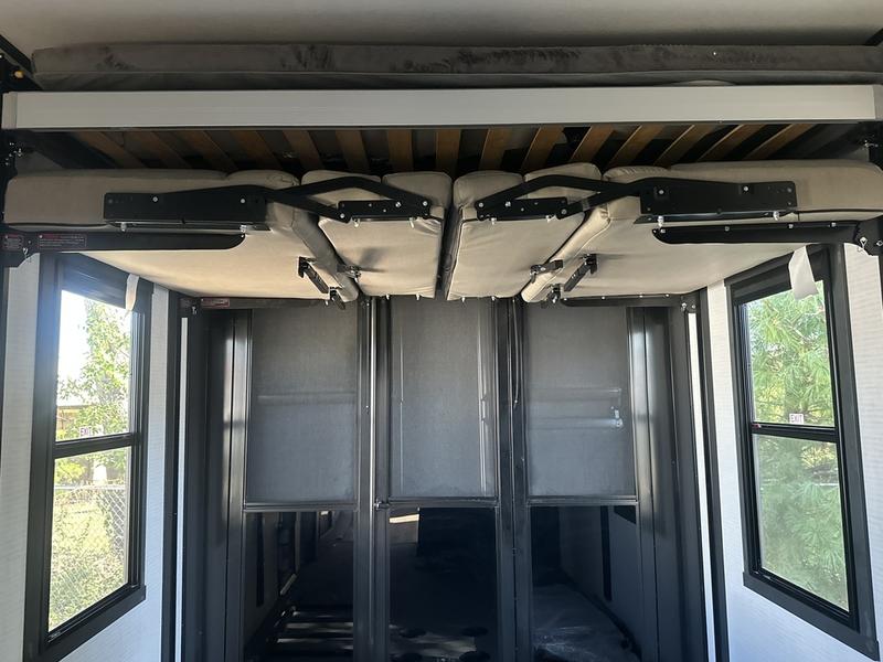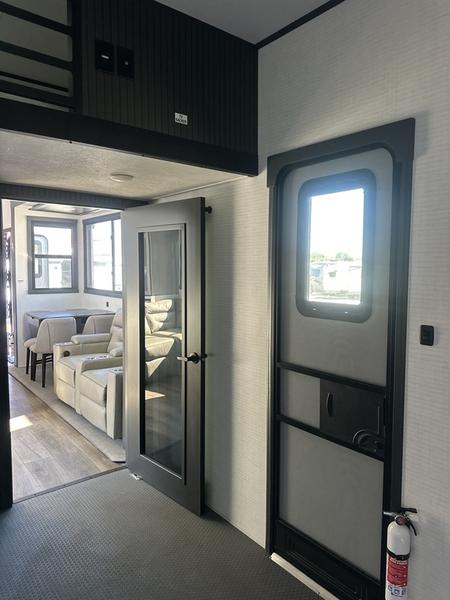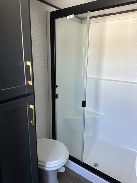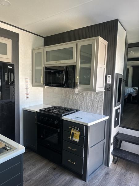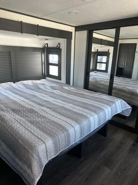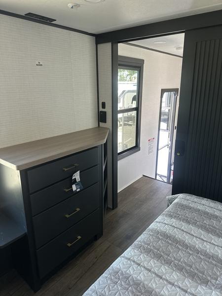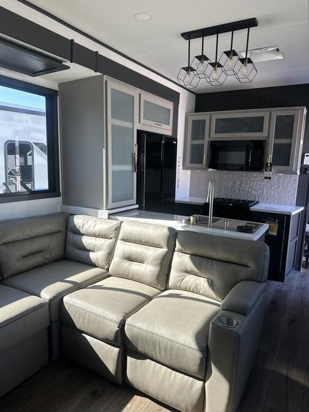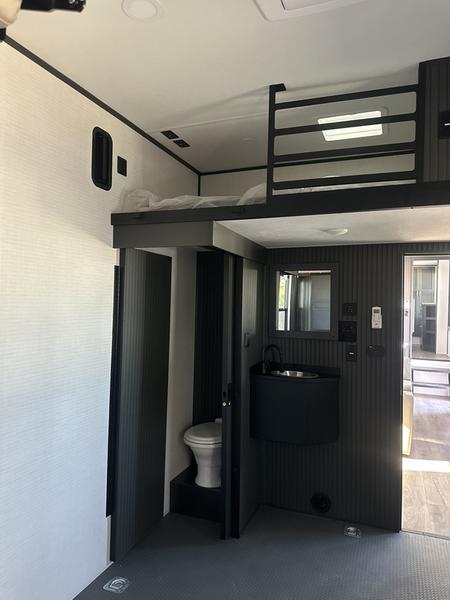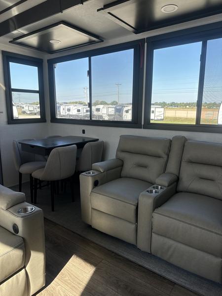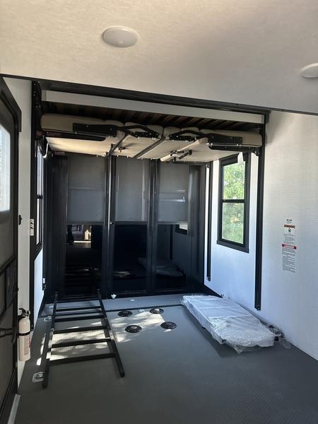 When you're ready to kick up some mud, hitch this toy hauler up and head out! You can set up the patio deck once your toys are removed from the 14' separate garage and relax with a cold drink. You'll find seating space on the Sit N Sleep roll-over sofas with a removable dinette table in between, and the Sleep N Store electric queen bed will provide sleeping space for your guests. There is also a loft and a half bath for even more convenience. Head through the garage glass sliding doors to the living area with an L-shaped sofa and theater seating or start lunch in the middle kitchen with ample counter space. There is even a free-standing table and chairs like you would find at home. The full bath up front lets you clean up after a trail ride and the front private bedroom will have you feeling right at home. With a 66" x 80" king bed slide out, along with a large front wardrobe with washer and dryer prep, plus a dresser and TV backer if you want to add your own TV.