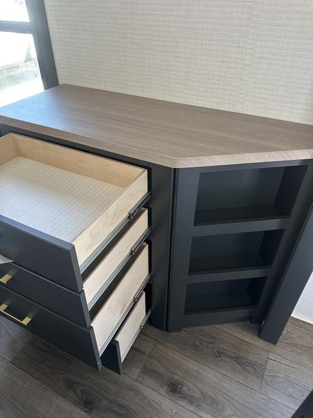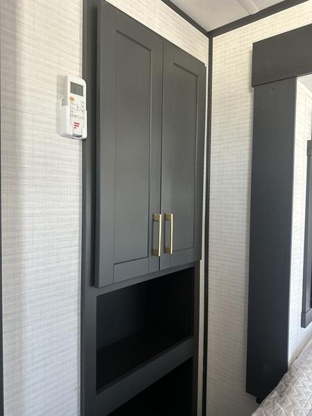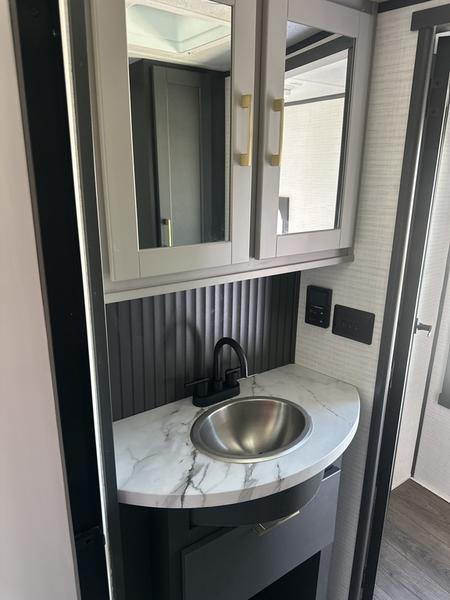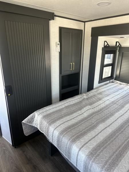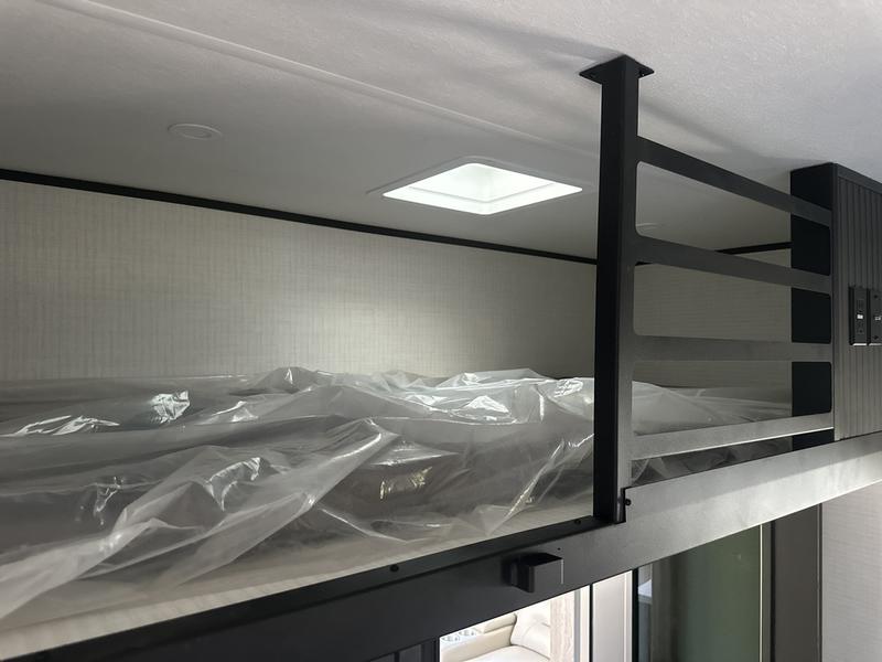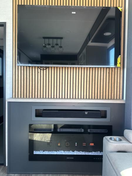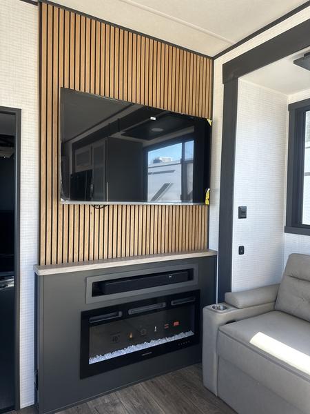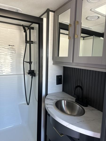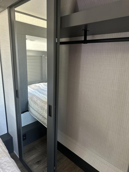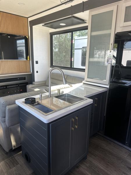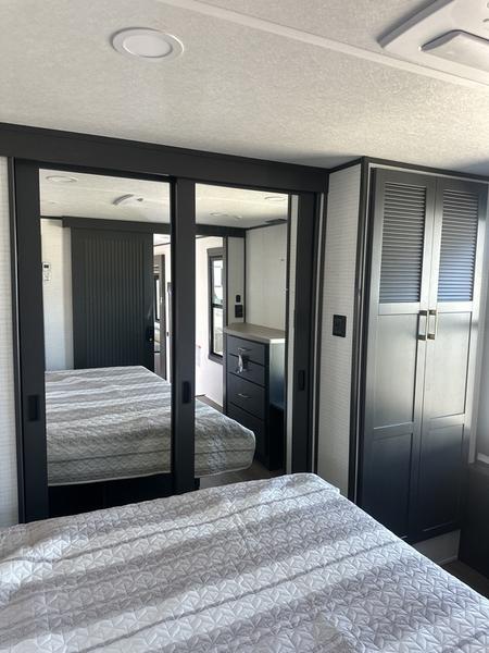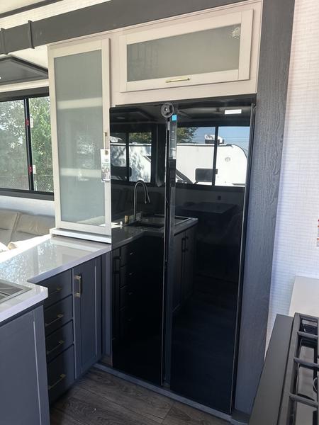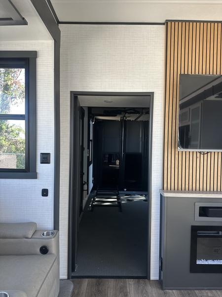 When you're ready to kick up some mud, hitch this toy hauler up and head out! You can set up the patio deck once your toys are removed from the 14' separate garage and relax with a cold drink. You'll find seating space on the Sit N Sleep roll-over sofas with a removable dinette table in between, and the Sleep N Store electric queen bed will provide sleeping space for your guests. There is also a loft and a half bath for even more convenience. Head through the garage glass sliding doors to the living area with an L-shaped sofa and theater seating or start lunch in the middle kitchen with ample counter space. There is even a free-standing table and chairs like you would find at home. The full bath up front lets you clean up after a trail ride and the front private bedroom will have you feeling right at home. With a 66" x 80" king bed slide out, along with a large front wardrobe with washer and dryer prep, plus a dresser and TV backer if you want to add your own TV.