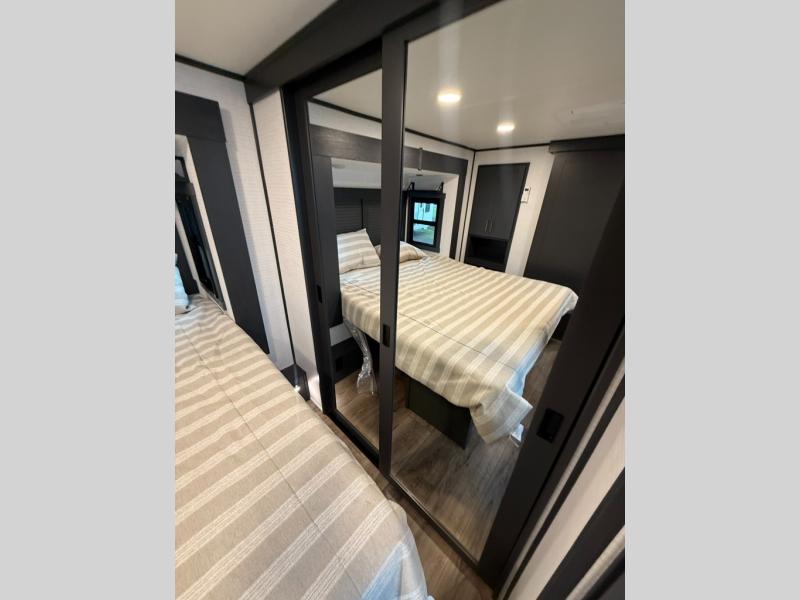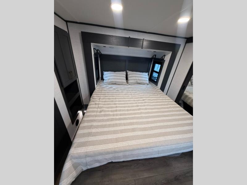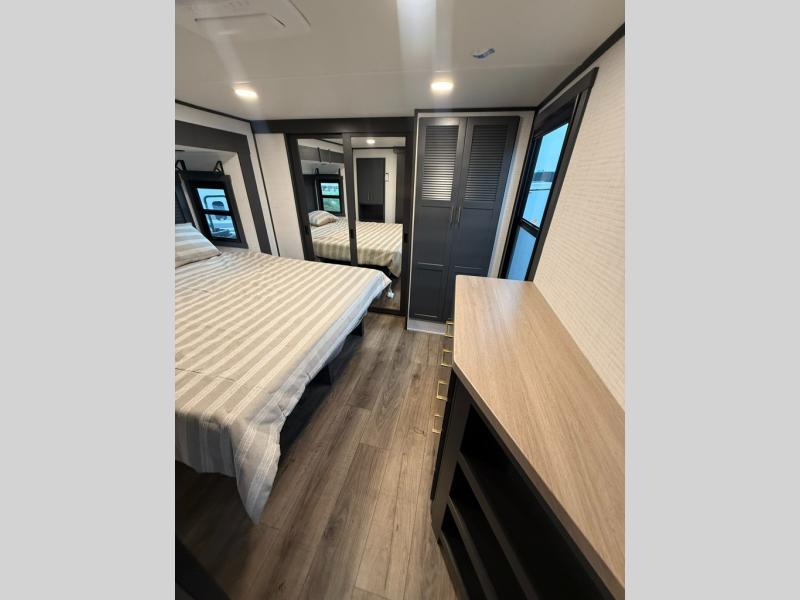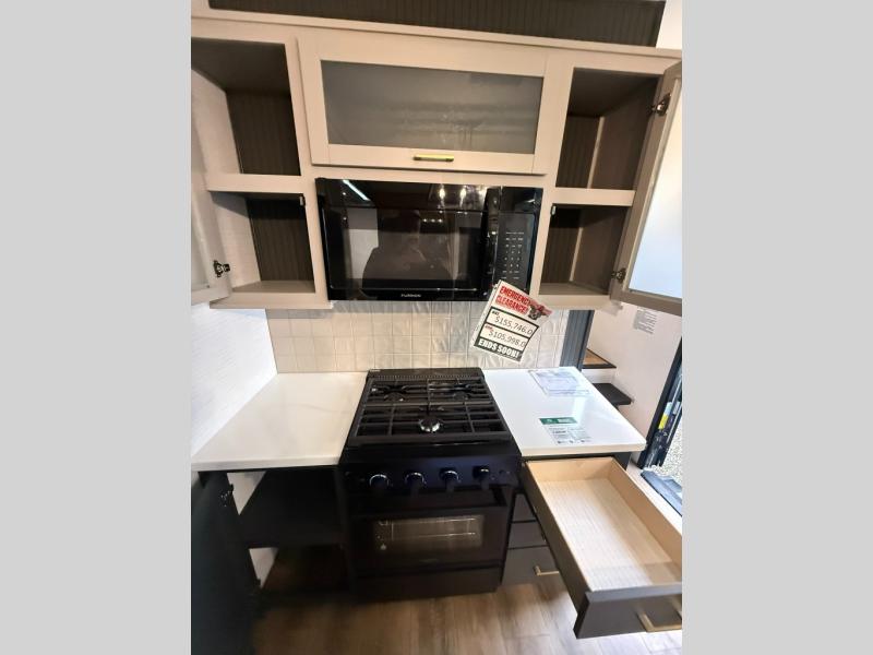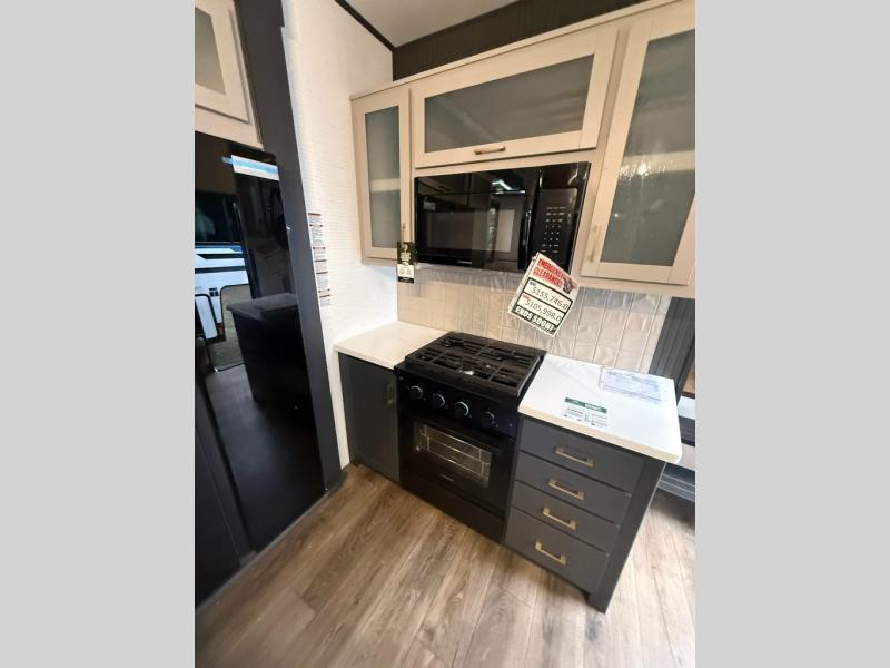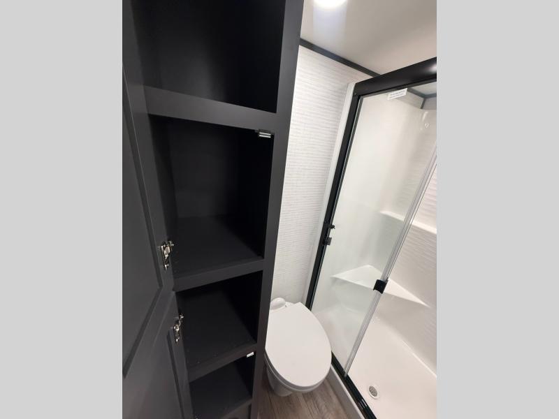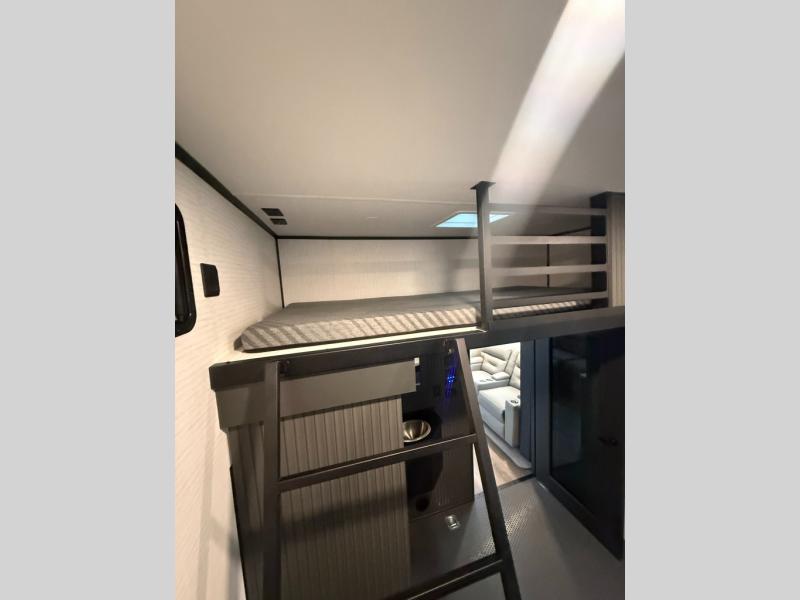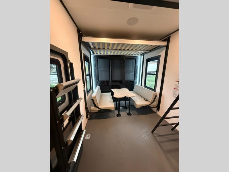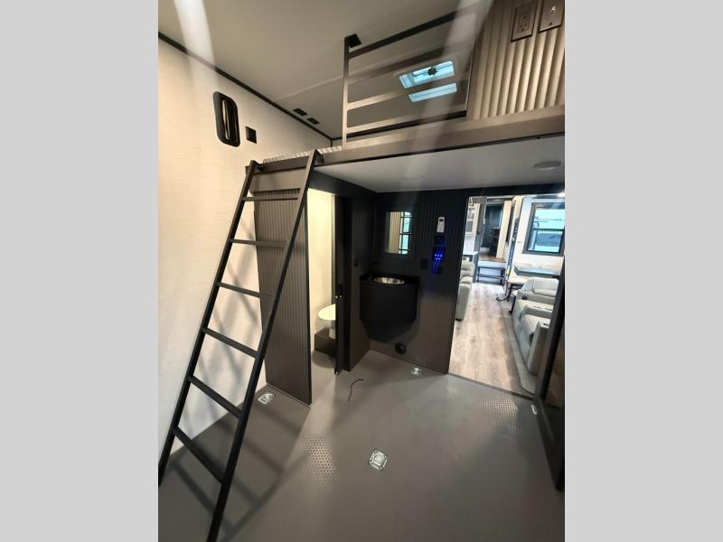 When you're ready to kick up some mud, hitch this toy hauler up and head out! You can set up the patio deck once your toys are removed from the 14' separate garage and relax with a cold drink. You'll find seating space on the Sit N Sleep roll-over sofas with a removable dinette table in between, and the Sleep N Store electric queen bed will provide sleeping space for your guests. There is also a loft and a half bath for even more convenience. Head through the garage glass sliding doors to the living area with an L-shaped sofa and theater seating or start lunch in the middle kitchen with ample counter space. There is even a free-standing table and chairs like you would find at home. The full bath up front lets you clean up after a trail ride and the front private bedroom will have you feeling right at home. With a 66" x 80" king bed slide out, along with a large front wardrobe with washer and dryer prep, plus a dresser and TV backer if you want to add your own TV.