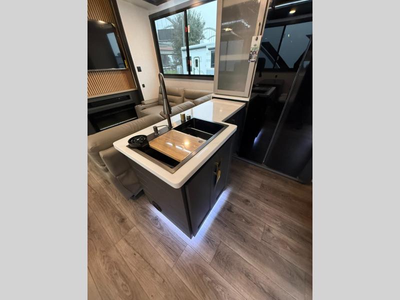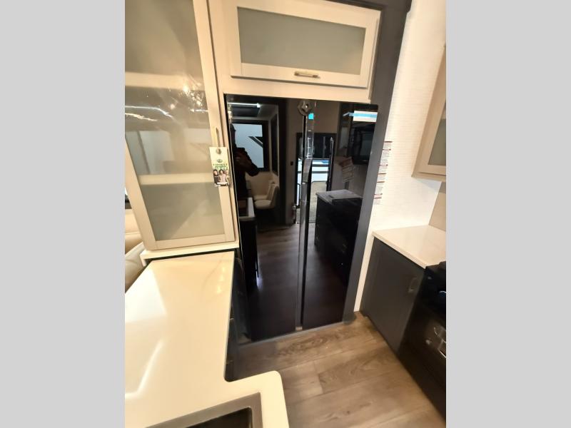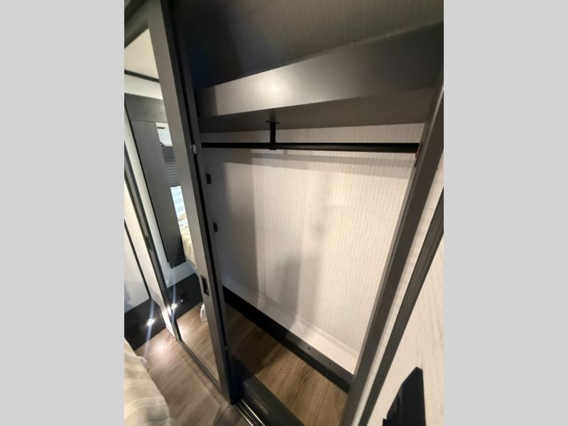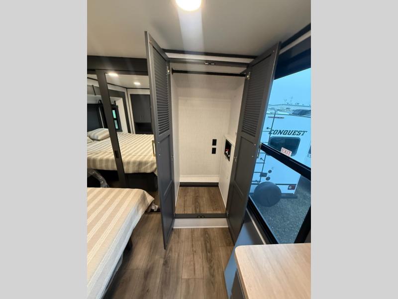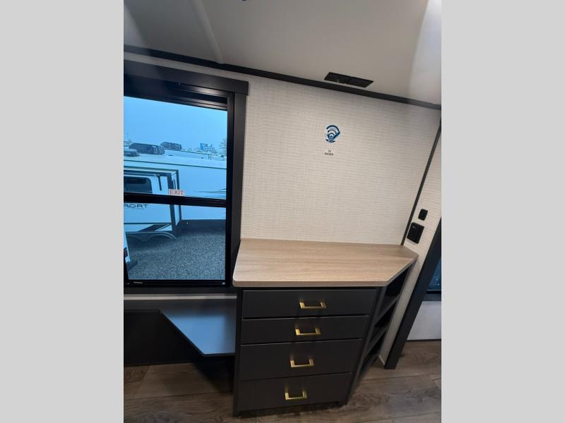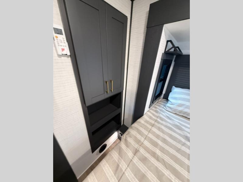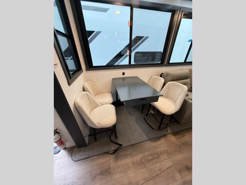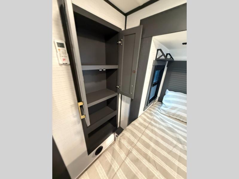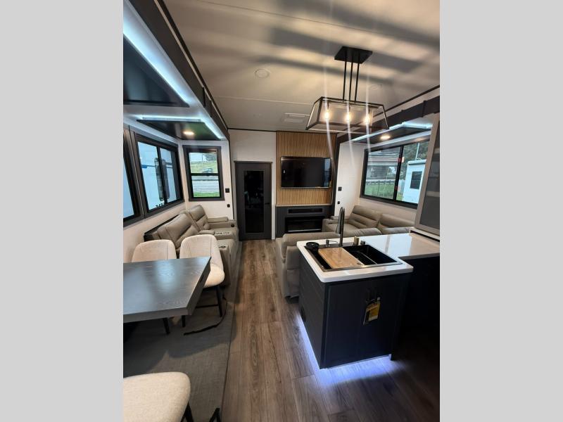When you're ready to kick up some mud, hitch this toy hauler up and head out! You can set up the patio deck once your toys are removed from the 14' separate garage and relax with a cold drink. You'll find seating space on the Sit N Sleep roll-over sofas with a removable dinette table in between, and the Sleep N Store electric queen bed will provide sleeping space for your guests. There is also a loft and a half bath for even more convenience. Head through the garage glass sliding doors to the living area with an L-shaped sofa and theater seating or start lunch in the middle kitchen with ample counter space. There is even a free-standing table and chairs like you would find at home. The full bath up front lets you clean up after a trail ride and the front private bedroom will have you feeling right at home. With a 66" x 80" king bed slide out, along with a large front wardrobe with washer and dryer prep, plus a dresser and TV backer if you want to add your own TV.