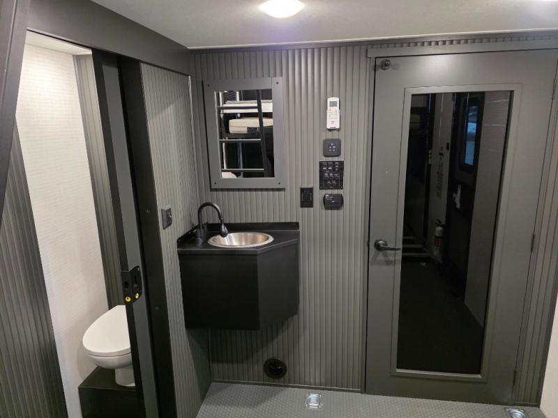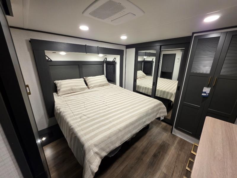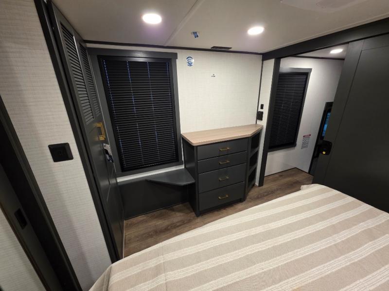 When you're ready to kick up some mud, hitch this toy hauler up and head out! You can set up the patio deck once your toys are removed from the 14' separate garage and relax with a cold drink. You'll find seating space on the Happi Jack dinette with removable dinette tables in between, and the Happi Jack queen bed system will provide sleeping space for your guests. There is also a loft and a half bath for even more convenience. Head through the garage glass sliding doors to the living area with an L-shaped sofa and theater seating or start lunch in the middle kitchen with ample counter space. There is even a table and chairs like you would find at home. The full bath up front lets you clean up after a trail ride, and the front private bedroom will have you feeling right at home. With a 66" x 80" king bed slide out, along with a large front wardrobe with washer and dryer prep, plus a dresser and TV backer if you want to add your own TV.