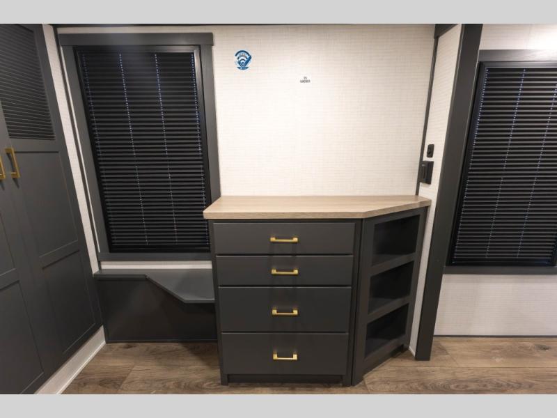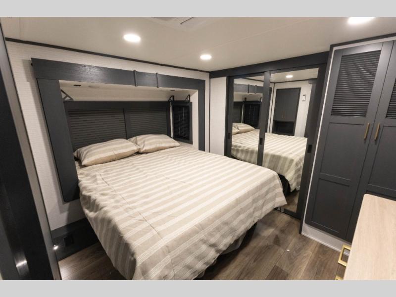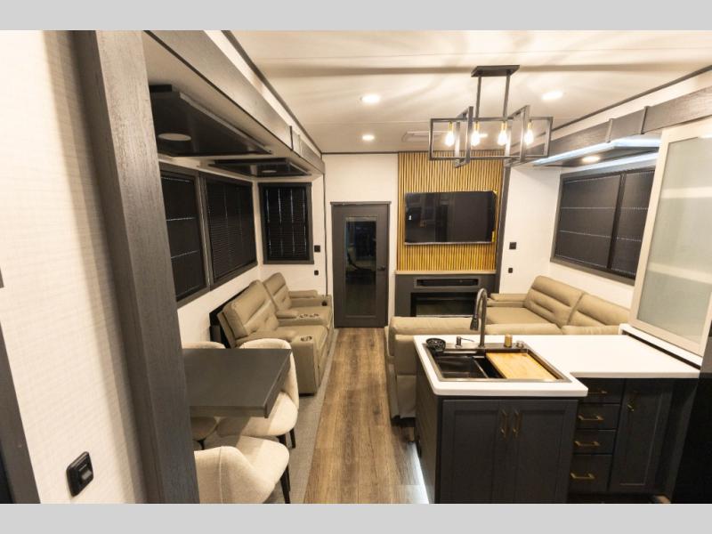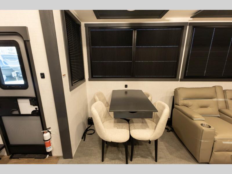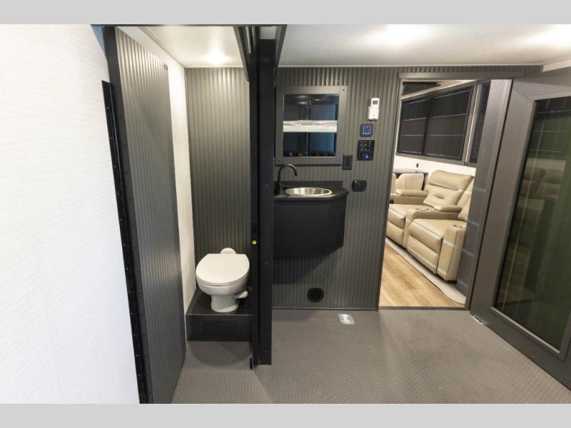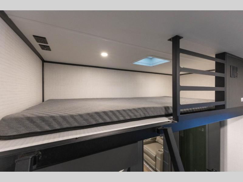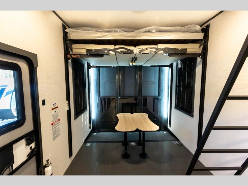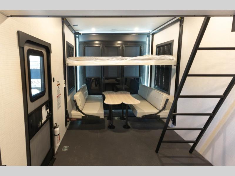 When you're ready to kick up some mud, hitch this toy hauler up and head out! You can set up the patio deck once your toys are removed from the 14' separate garage and relax with a cold drink. You'll find seating space on the Happi Jack dinette with removable dinette tables in between, and the Happi Jack queen bed system will provide sleeping space for your guests. There is also a loft and a half bath for even more convenience. Head through the garage glass sliding doors to the living area with an L-shaped sofa and theater seating or start lunch in the middle kitchen with ample counter space. There is even a table and chairs like you would find at home. The full bath up front lets you clean up after a trail ride, and the front private bedroom will have you feeling right at home. With a 66" x 80" king bed slide out, along with a large front wardrobe with washer and dryer prep, plus a dresser and TV backer if you want to add your own TV.