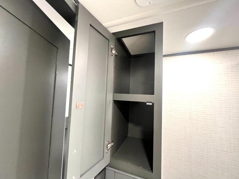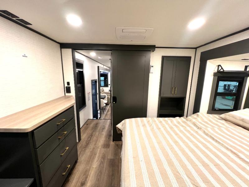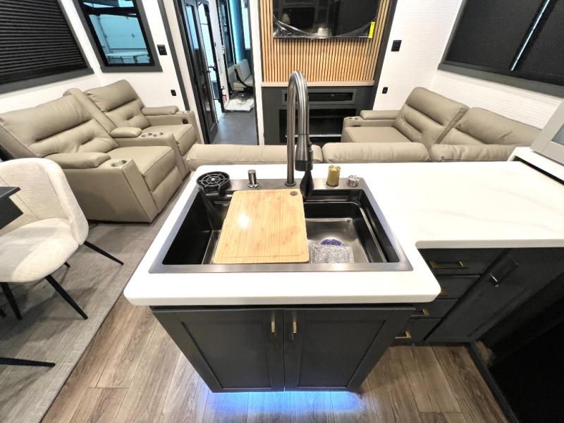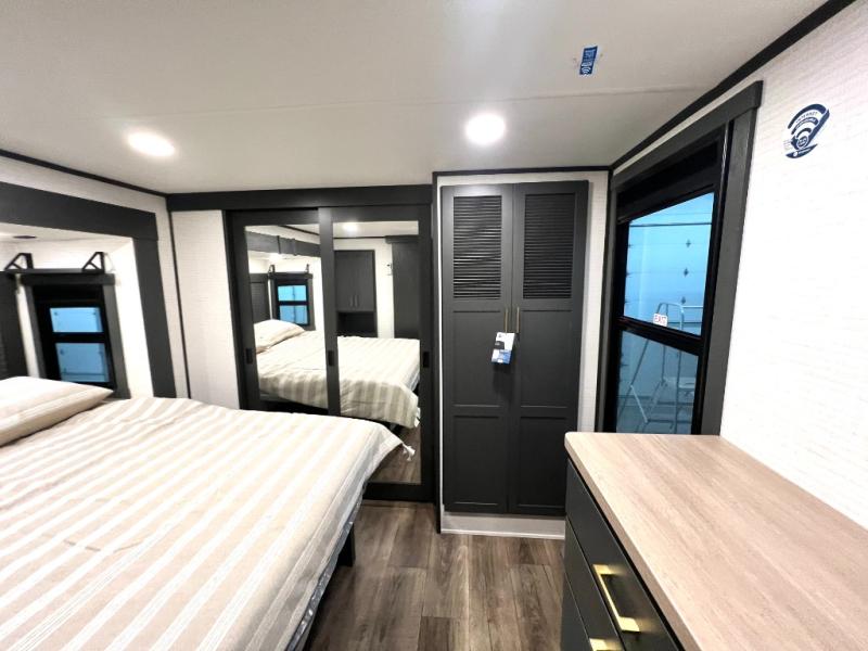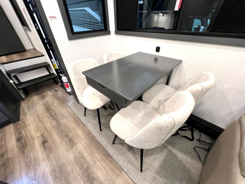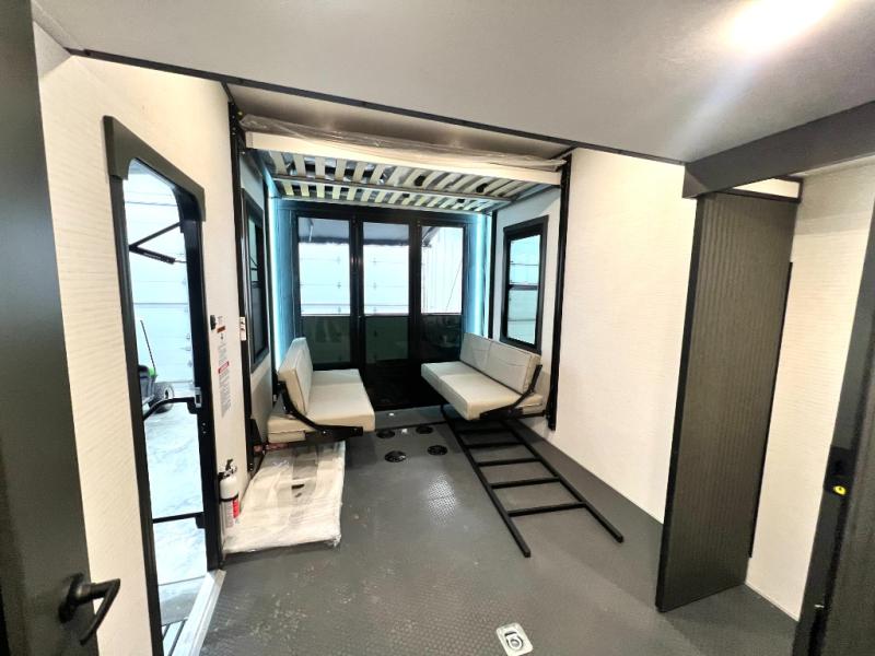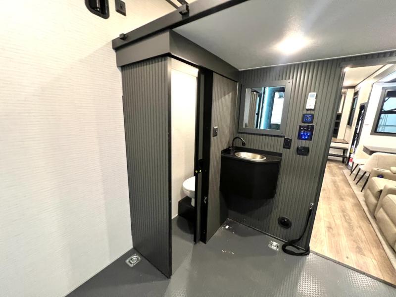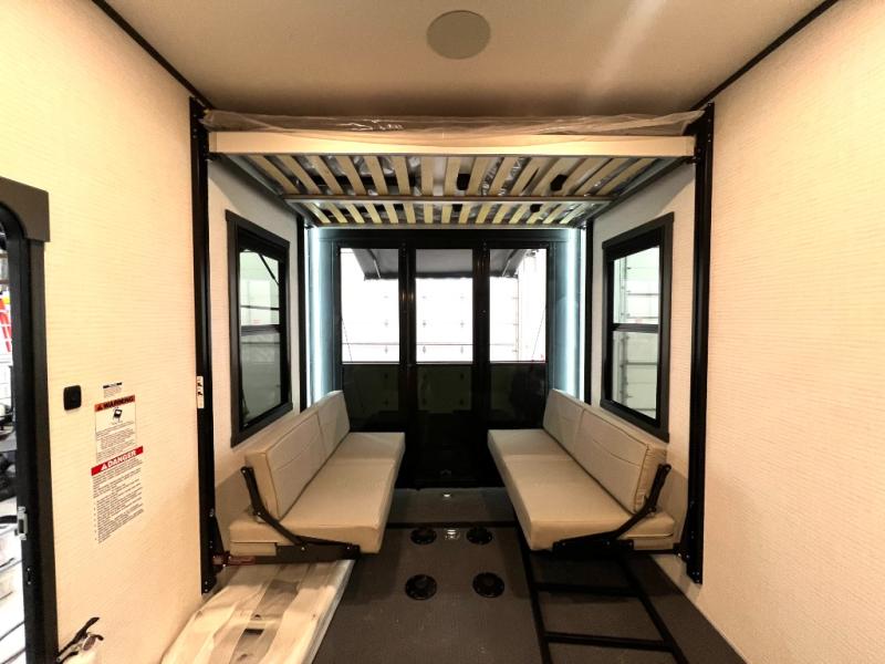 When you're ready to kick up some mud, hitch this toy hauler up and head out! You can set up the patio deck once your toys are removed from the 14' separate garage and relax with a cold drink. You'll find seating space on the Happi Jack dinette with removable dinette tables in between, and the Happi Jack queen bed system will provide sleeping space for your guests. There is also a loft and a half bath for even more convenience. Head through the garage glass sliding doors to the living area with an L-shaped sofa and theater seating or start lunch in the middle kitchen with ample counter space. There is even a table and chairs like you would find at home. The full bath up front lets you clean up after a trail ride, and the front private bedroom will have you feeling right at home. With a 66" x 80" king bed slide out, along with a large front wardrobe with washer and dryer prep, plus a dresser and TV backer if you want to add your own TV.