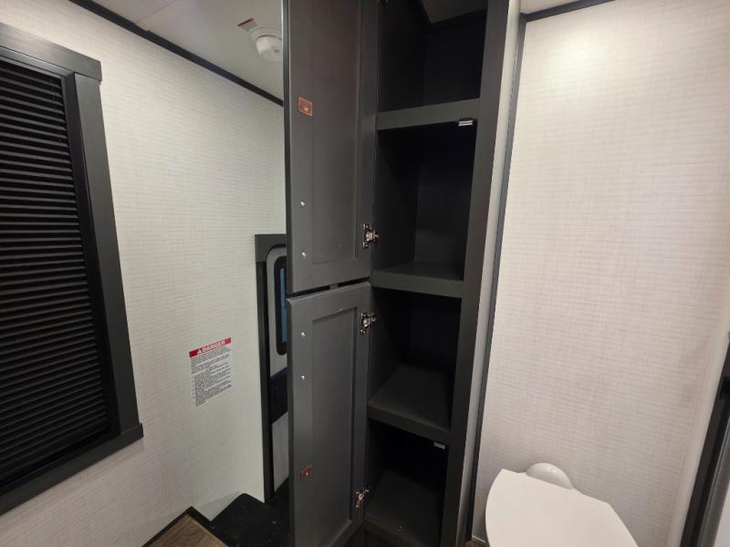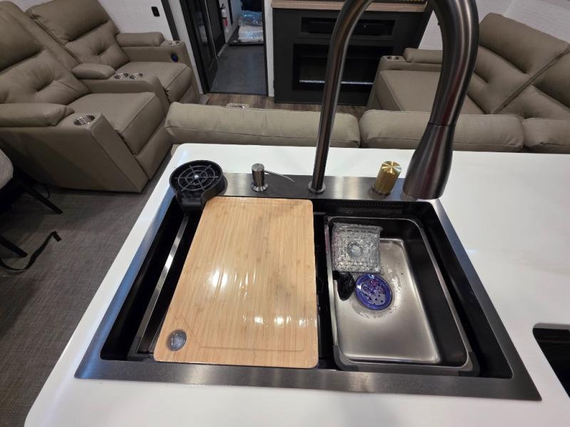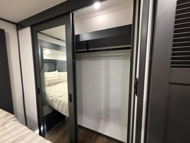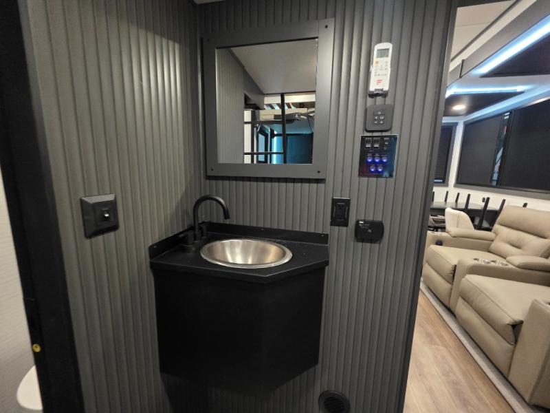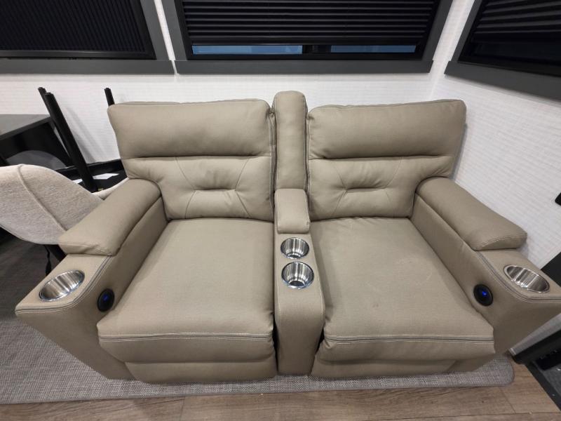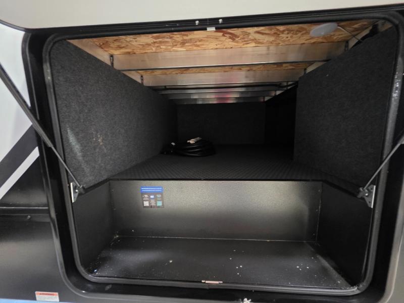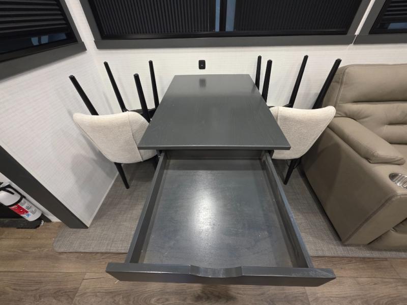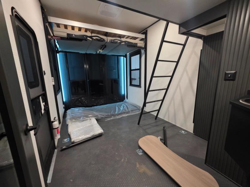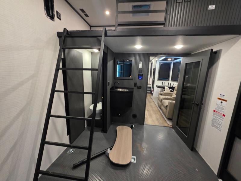When you're ready to kick up some mud, hitch this toy hauler up and head out! You can set up the patio deck once your toys are removed from the 14' separate garage and relax with a cold drink. You'll find seating space on the Happi Jack dinette with removable dinette tables in between, and the Happi Jack queen bed system will provide sleeping space for your guests. There is also a loft and a half bath for even more convenience. Head through the garage glass sliding doors to the living area with an L-shaped sofa and theater seating or start lunch in the middle kitchen with ample counter space. There is even a table and chairs like you would find at home. The full bath up front lets you clean up after a trail ride, and the front private bedroom will have you feeling right at home. With a 66" x 80" king bed slide out, along with a large front wardrobe with washer and dryer prep, plus a dresser and TV backer if you want to add your own TV.