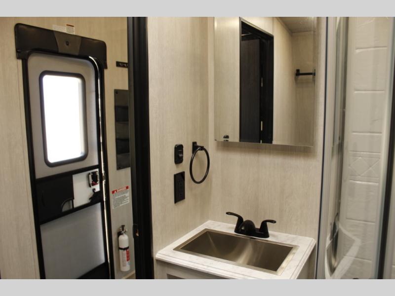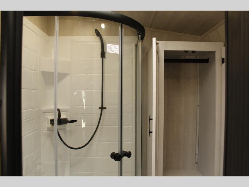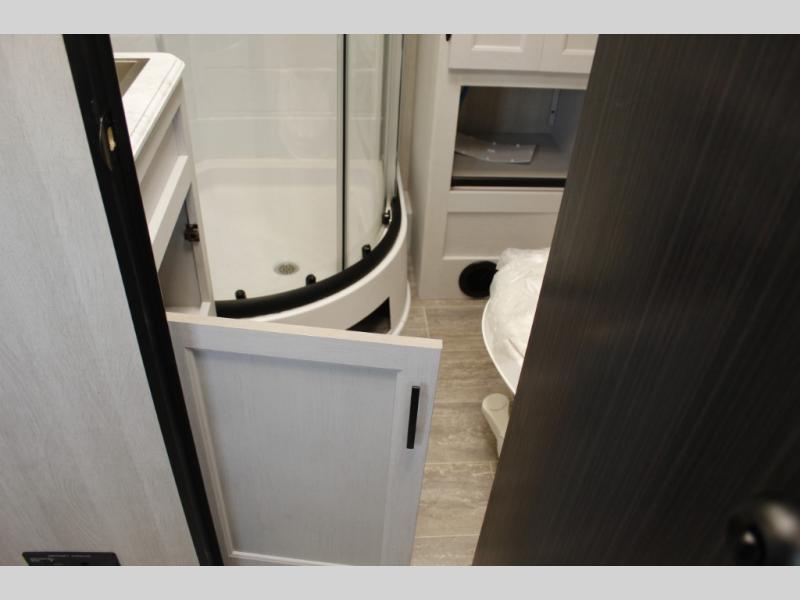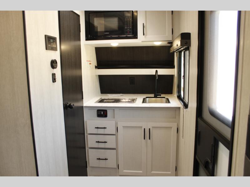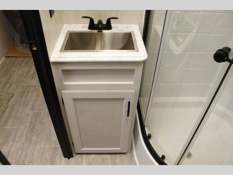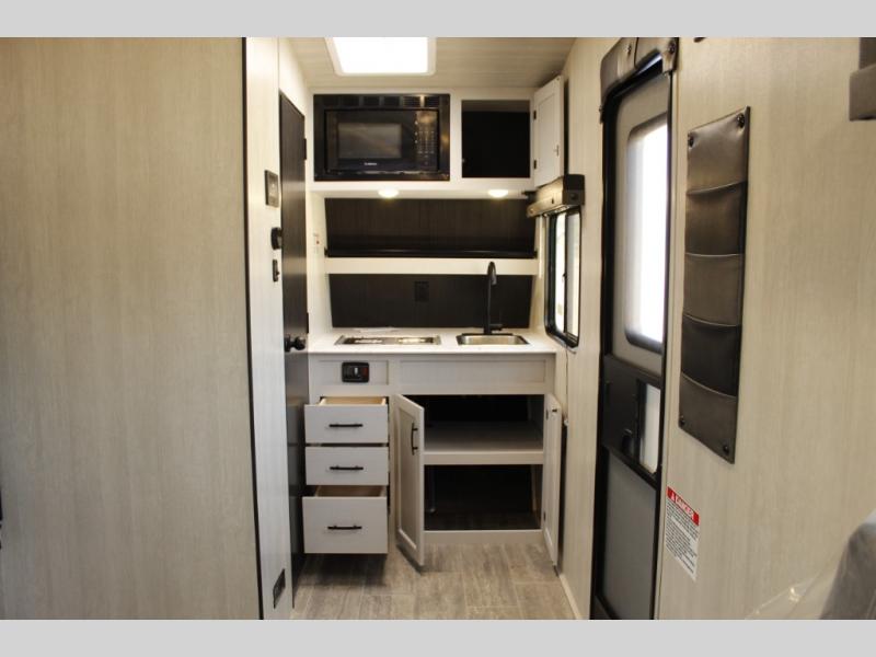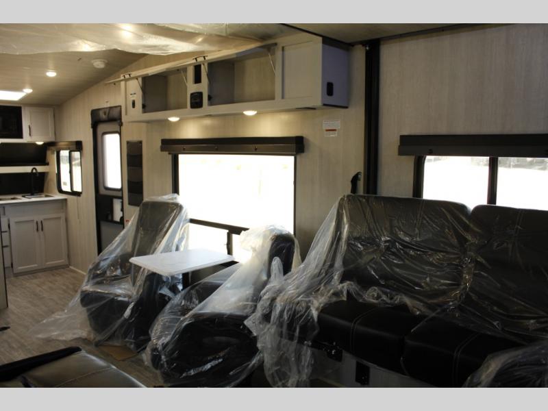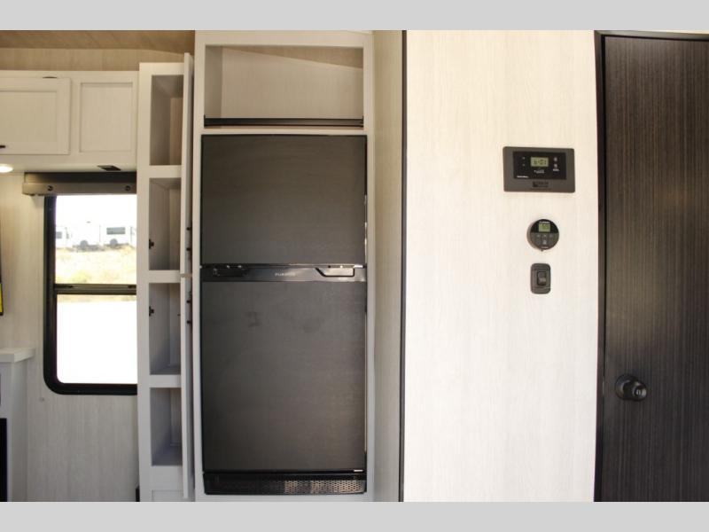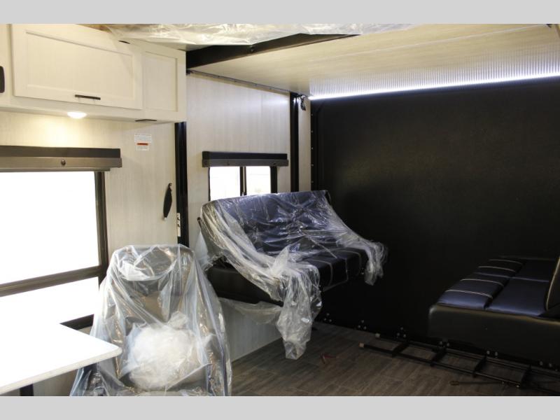 This toy hauler with 16' 1" cargo space will be perfect for trail riding fun! Once you've unloaded your toys, you can relax on the dual sofas with a table in between or enjoy a cold drink on the dual lounge chairs with a table. The entertainment center is across from the chairs for added convenience, and the kitchen pantry is nearby so you can grab a snack. A two burner cooktop, refrigerator, and sink also comes standard so you can prepare meals each day. And don't overlook the full bath with a toilet, sink, neo-angled shower, and bath wardrobe for clean towels.