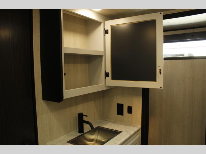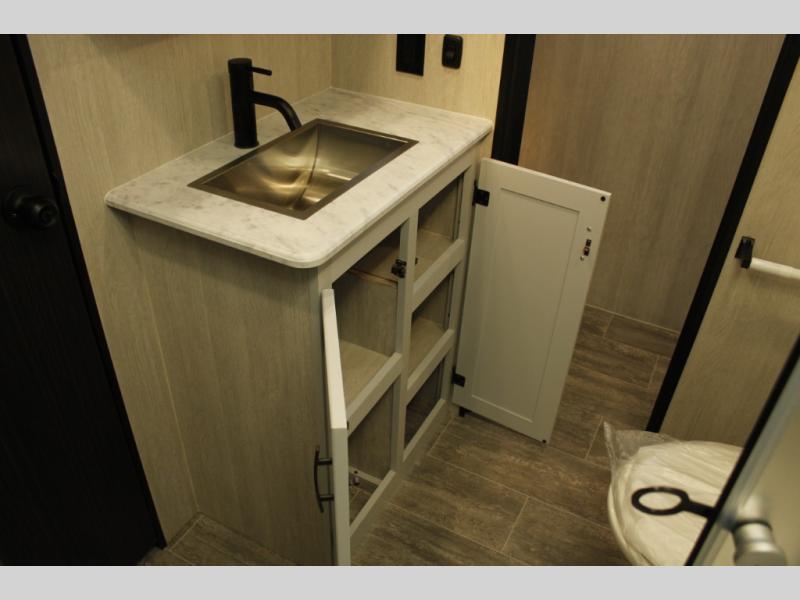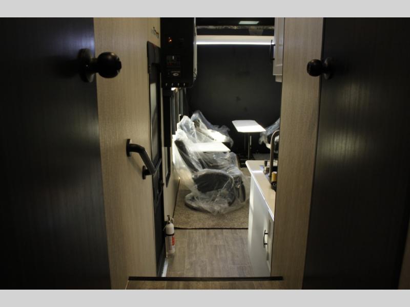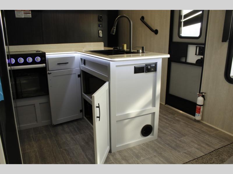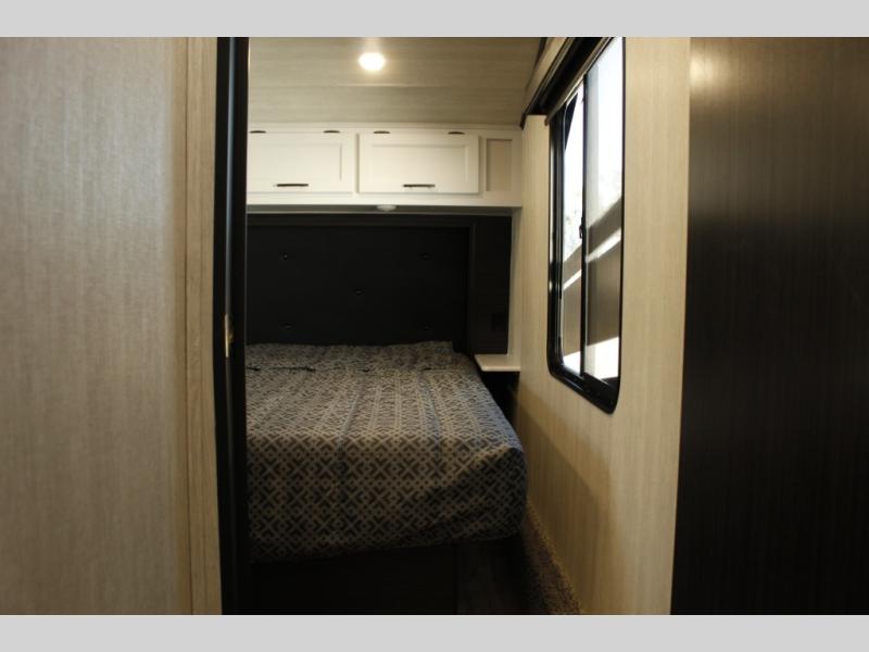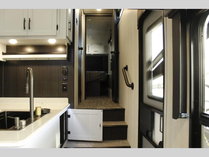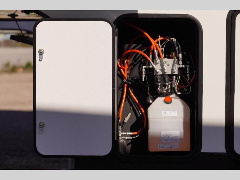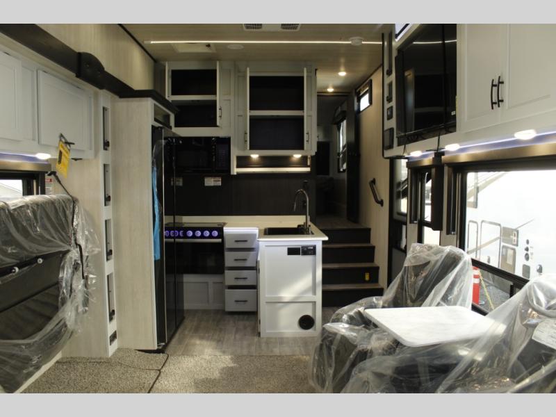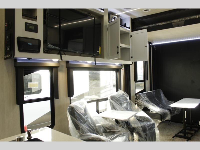 Imagine you, your family and your toys at competitions or fun events or weeklong trips with this fifth wheel and all the comforts inside. The cargo area becomes the main living and kitchen area with a slide out sofa, and an L-shaped countertop for more prep space, plus two chairs and dual opposing sofas with tables. The power queen bed in the rear stays up and away during the day then can easily be dropped down to sleep on. The front master bedroom is spacious as well with a slide out vanity/wardrobe and the second entry into the bathroom which is super convenient.