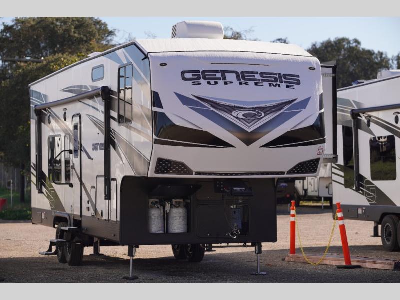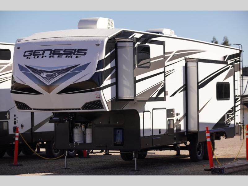 All sizes of off-road toys can fit into one of these Genesis Supreme fifth wheel toy haulers or travel trailer toy haulers! They are made for the outdoor enthusiasts and can handle harsh environments while still providing a luxurious lifestyle. With innovative floorplans built by engineers, you can know you will find what you're looking for in a toy hauler. Start your off-road journey today with your favorite model!