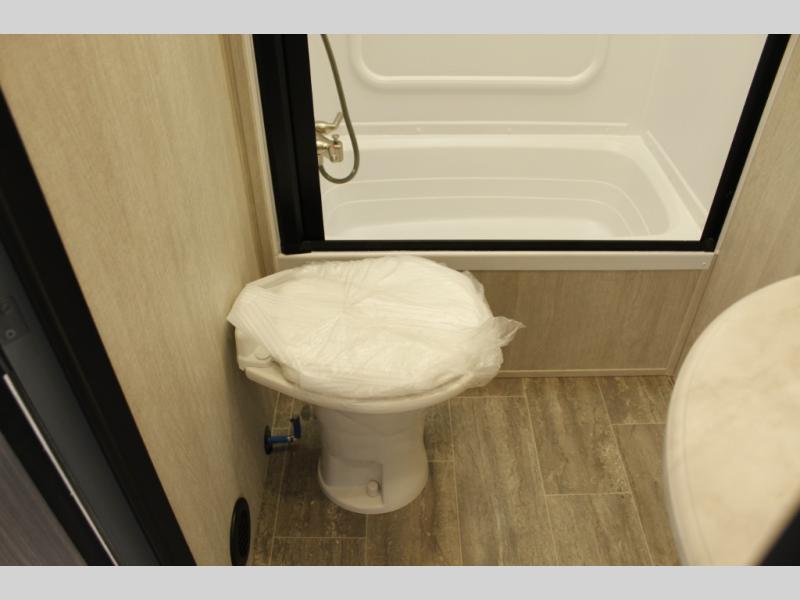 If you and your spouse enjoy hitting the trails while camping then this toy hauler is for you! The cargo area also has two chairs with a table and a sofa with a table to relax on each night. The fully equipped kitchen comes with a refrigerator, three burner cooktop, and a microwave oven when you're on the go. Get a good night's rest on the 54" x 74" full bed and stay squeaky clean with the tub/shower in the front corner bathroom.