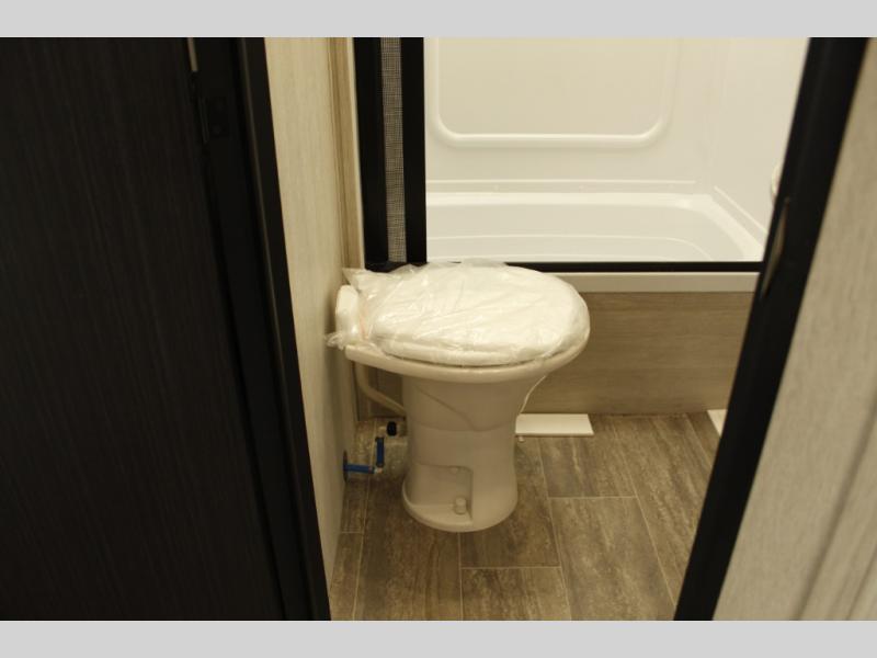 If you and your spouse enjoy hitting the trails while camping then this toy hauler is for you! The cargo area also has two chairs with a table and a sofa with a table to relax on each night. The fully equipped kitchen comes with a refrigerator, three burner cooktop, and a microwave oven when you're on the go. Get a good night's rest on the 54" x 74" full bed and stay squeaky clean with the tub/shower in the front corner bathroom.
