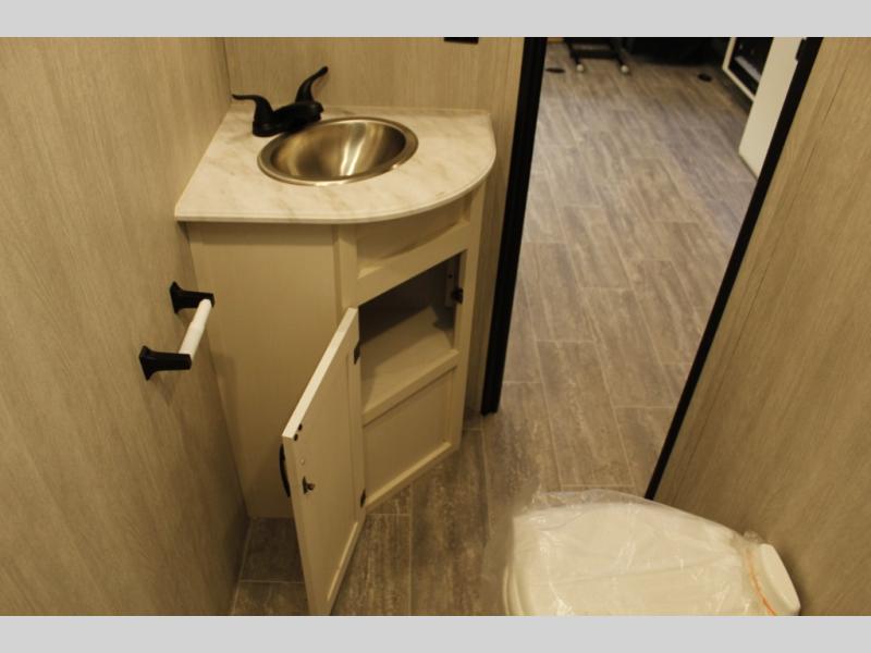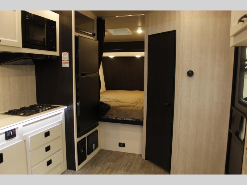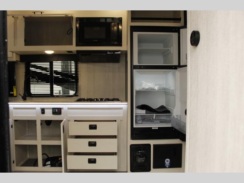 If you and your spouse enjoy hitting the trails while camping then this toy hauler is for you! The cargo area also has two chairs with a table and a sofa with a table to relax on each night. The fully equipped kitchen comes with a refrigerator, three burner cooktop, and a microwave oven when you're on the go. Get a good night's rest on the 54" x 74" full bed and stay squeaky clean with the tub/shower in the front corner bathroom.
