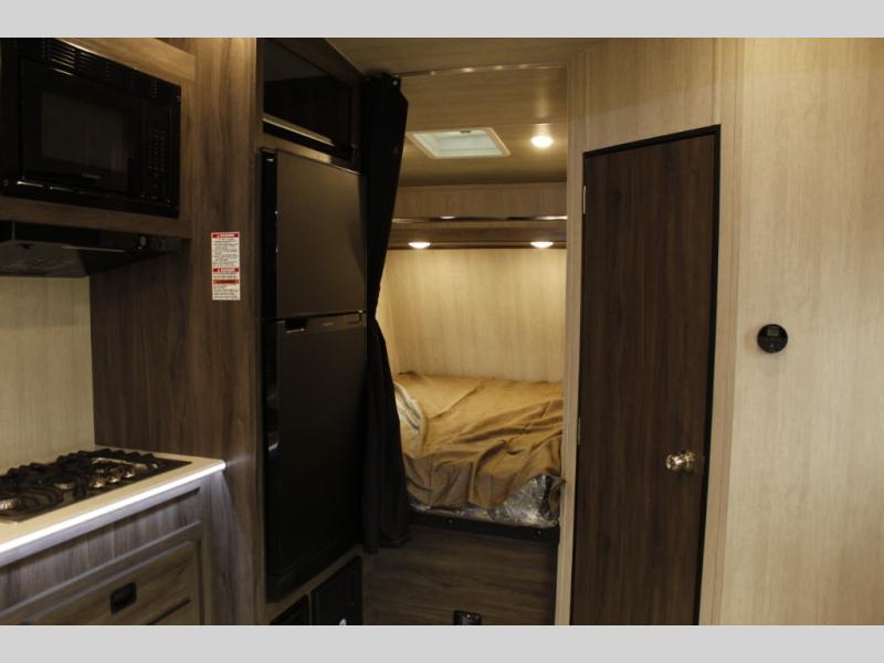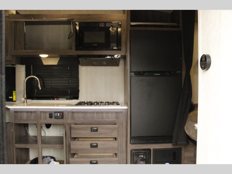 If you and your spouse enjoy hitting the trails while camping then this toy hauler is for you! The cargo area also has two chairs with a table and a sofa with a table to relax on each night. The fully equipped kitchen comes with a refrigerator, three burner cooktop, and a microwave oven when you're on the go. Get a good night's rest on the 54" x 74" full bed and stay squeaky clean with the tub/shower in the front corner bathroom.