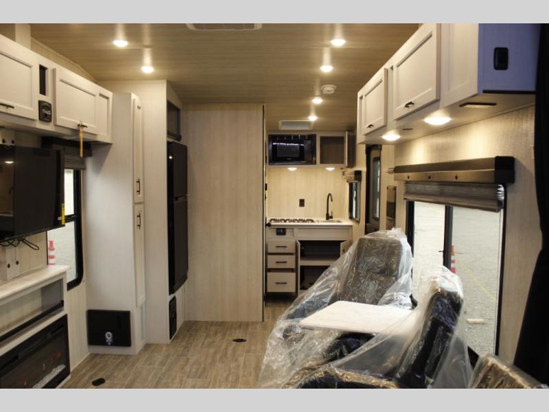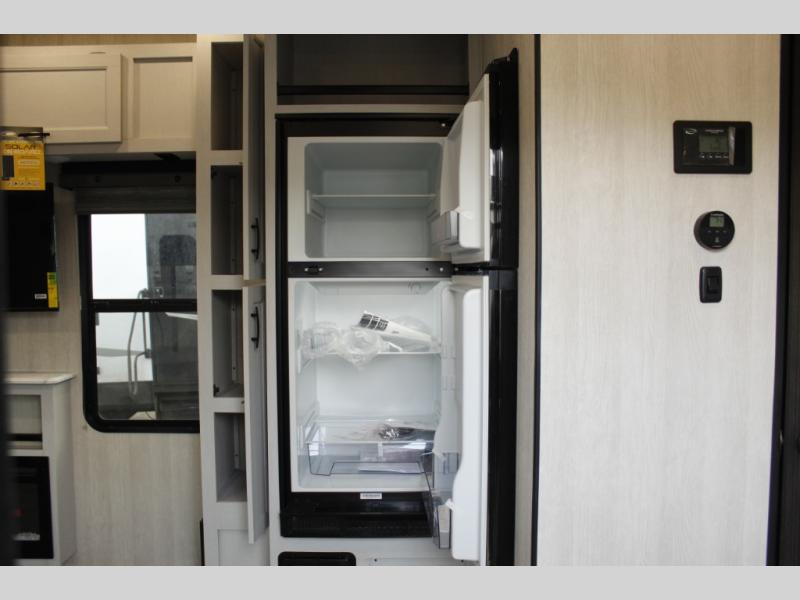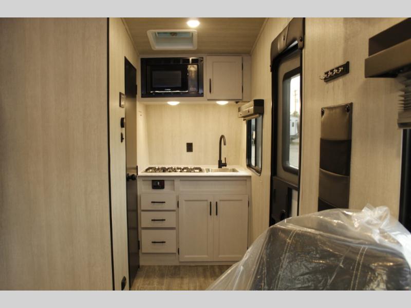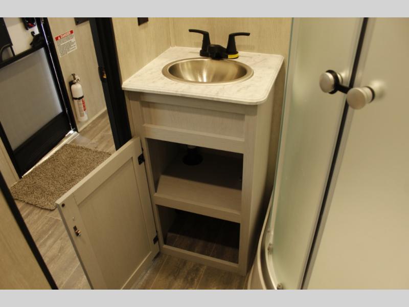 This toy hauler with 16' 1" cargo space will be perfect for trail riding fun! Once you've unloaded your toys, you can relax on the dual sofas with a table in between or enjoy a cold drink on the dual lounge chairs with a table. The entertainment center is across from the chairs for added convenience, and the kitchen pantry is nearby so you can grab a snack. A two burner cooktop, refrigerator, and sink also comes standard so you can prepare meals each day. And don't overlook the full bath with a toilet, sink, neo-angled shower, and bath wardrobe for clean towels.