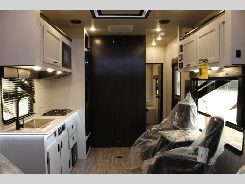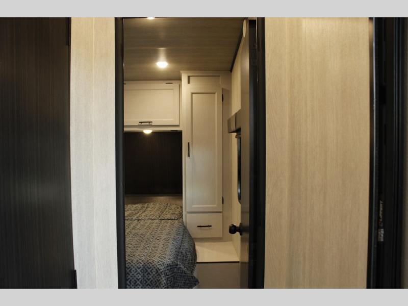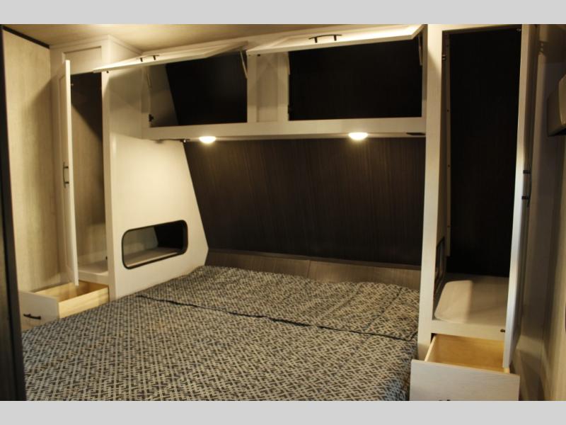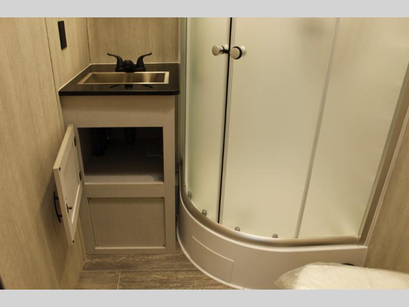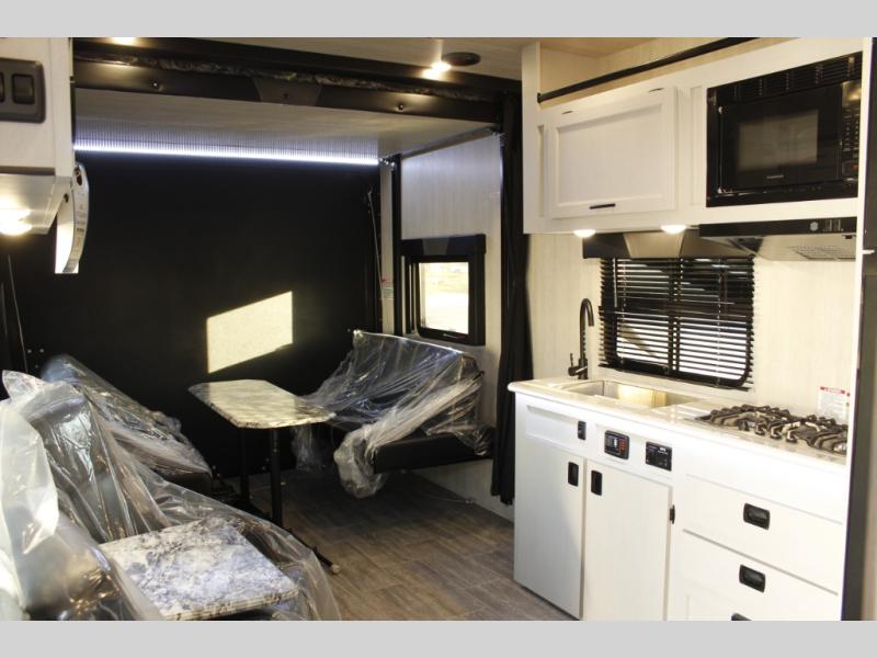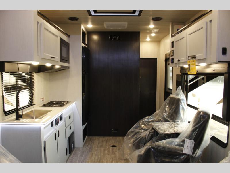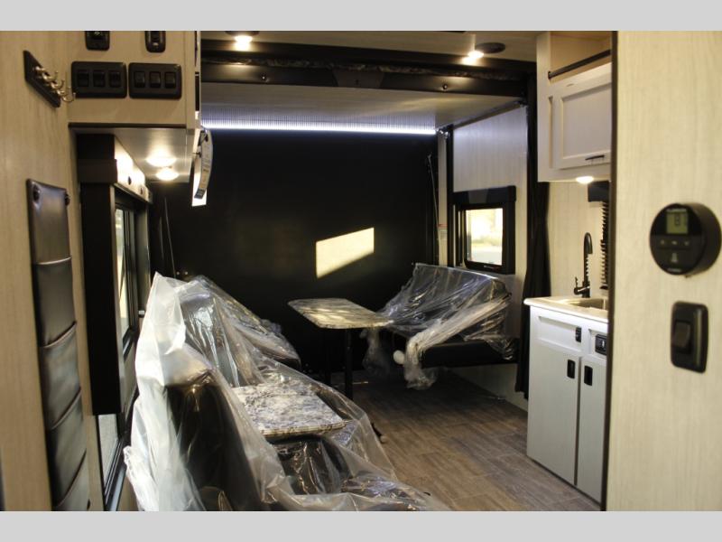 This toy hauler will feel a little more like home since it includes a front private bedroom with a queen bed and dual wardrobes for your things. There is a spacious full bath with radius shower, vanity with medicine cabinet plus toilet, and the full kitchen will allow you to cook meals each day on the three burner cooktop and microwave. There is also a 10 cu. ft. 12V refrigerator to store perishables for the week. You will also enjoy a 200W solar panel outside, along with a patio awning, a 7' ramp door, and many more features.