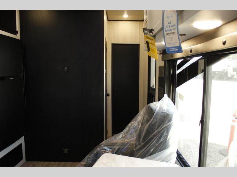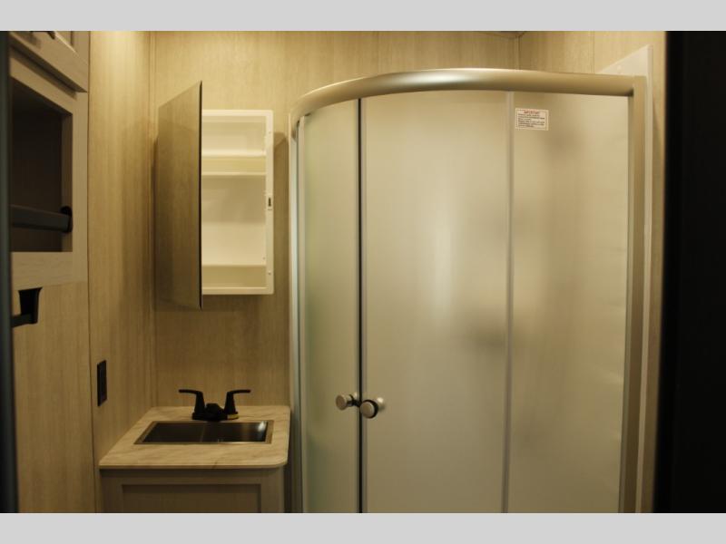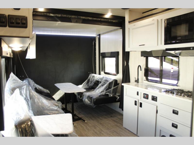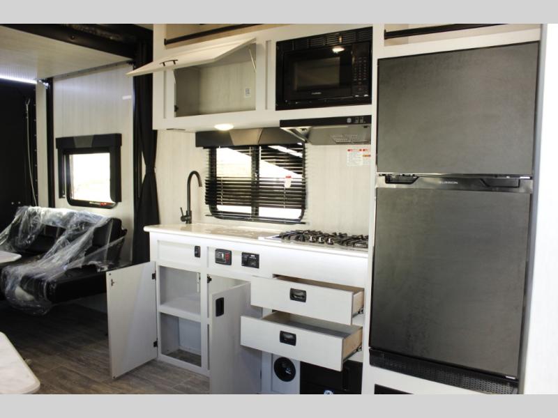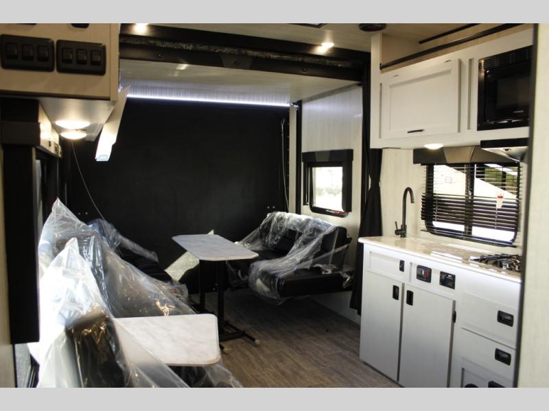 This toy hauler will feel a little more like home since it includes a front private bedroom with a queen bed and dual wardrobes for your things. There is a spacious full bath with radius shower, vanity with medicine cabinet plus toilet, and the full kitchen will allow you to cook meals each day on the three burner cooktop and microwave. There is also a 10 cu. ft. 12V refrigerator to store perishables for the week. You will also enjoy a 200W solar panel outside, along with a patio awning, a 7' ramp door, and many more features.