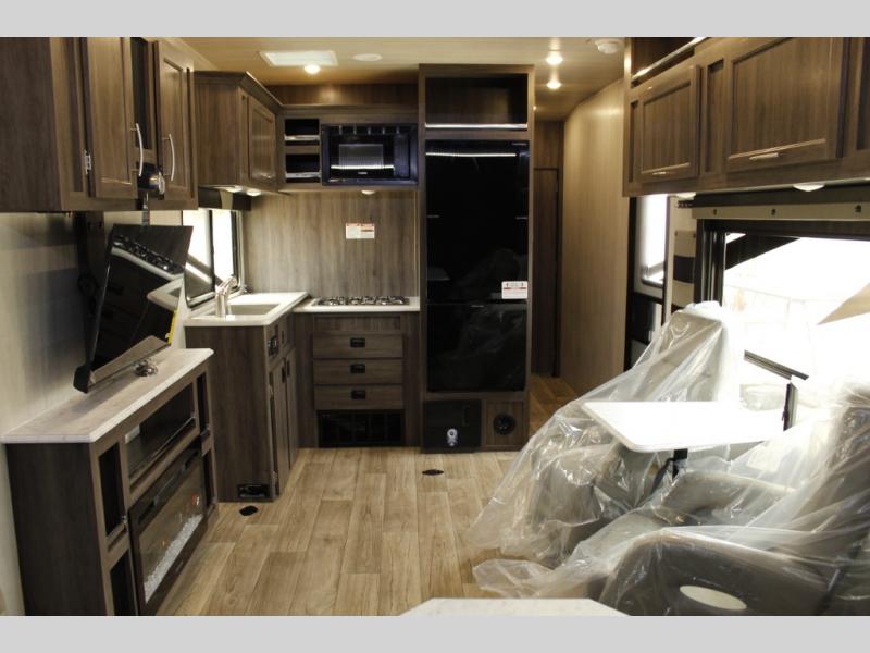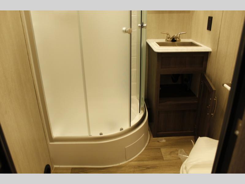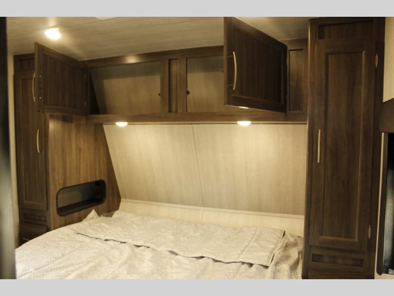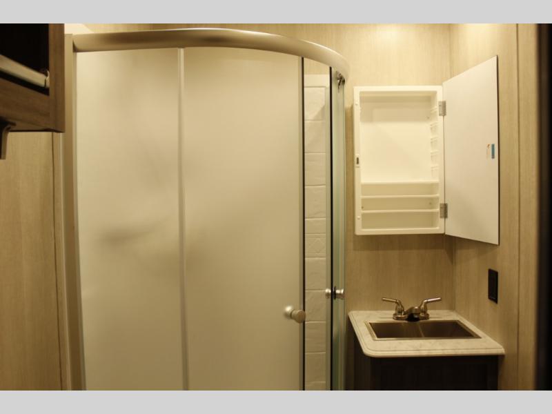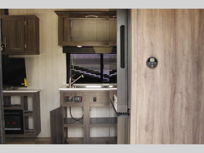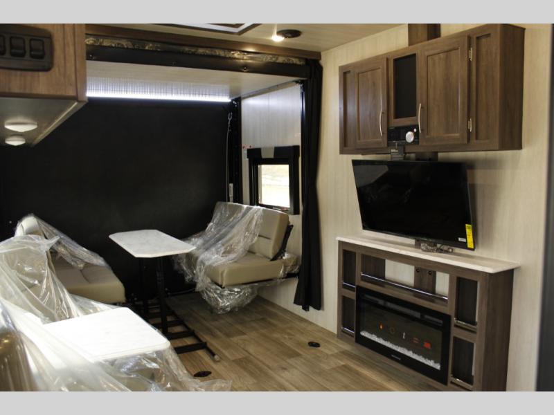 Grab your riding gear, load up the bikes, and head for the hills in this toy hauler for four. Once your toys are unloaded from the 15' total garage space, you can relax on the dual opposing sofas or on the dual lounge chairs with a table in between. There is also an entertainment center across from the chairs, and an optional queen bed above the sofas if you need more sleeping space. A full kitchen with a three burner cooktop, microwave oven, sink, and refrigerator lets you make meals each day, and the full bath will be much appreciated after trail riding. The front of this model features the private bedroom, complete with an RV queen bed, dual wardrobes, and an overhead cabinet for books and more!