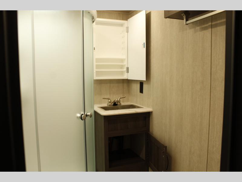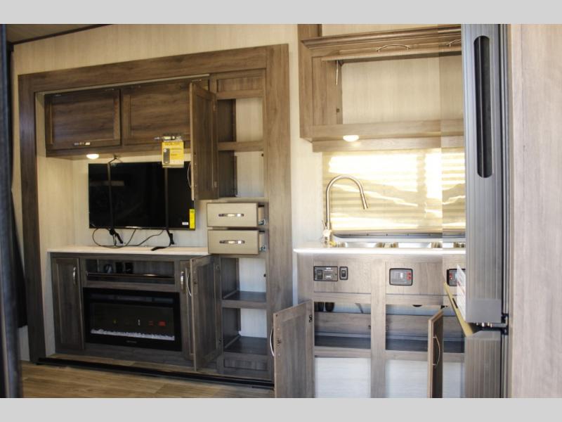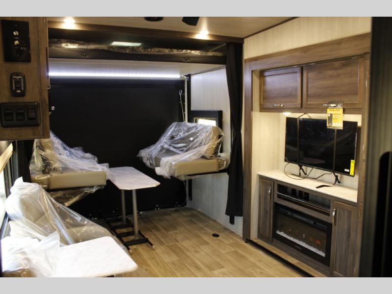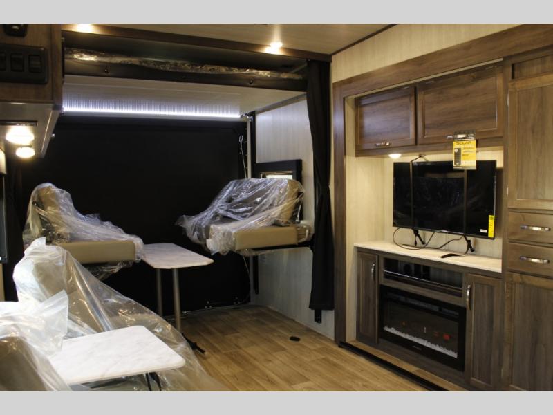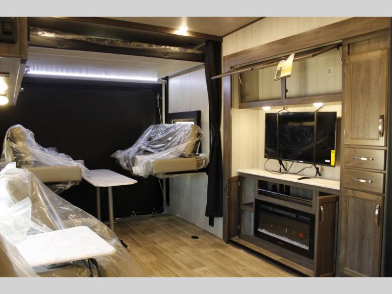 This toy hauler is ready for adventure when you are! There are two swivel/rocker chairs with a table and picture window where you can enjoy your coffee at each morning. The entertainment center slide out also includes a fireplace and pantry to keep dry goods. A 7' laminated ramp door will make it easy to unload your toys, and there is an opposing rear power dinette in the garage area that will provide more sleeping space for guests. The full kitchen and bath are sure to come in handy when you're camping all weekend, and you'll love having a private bedroom up front, complete with a queen bed, nightstand, and a dresser!