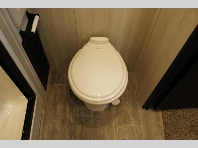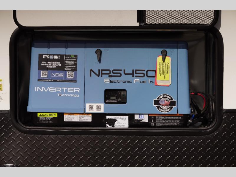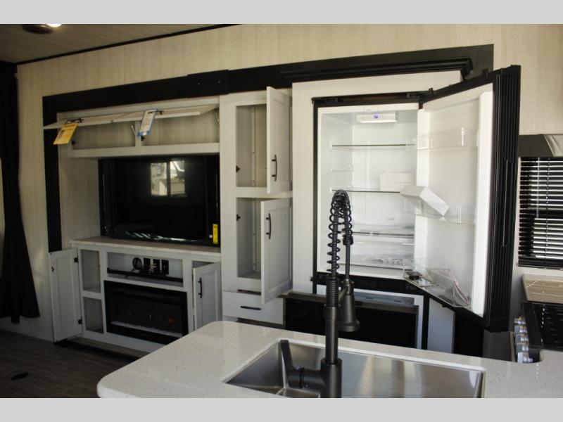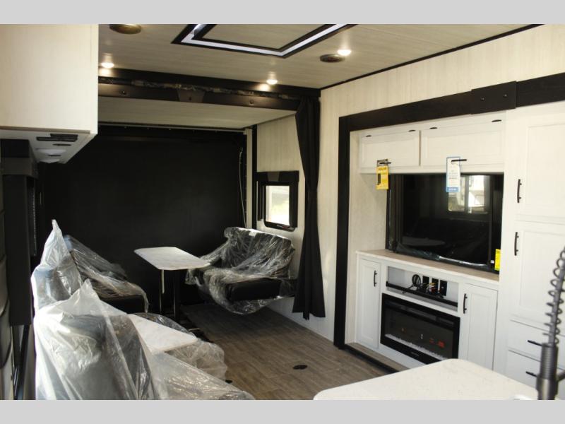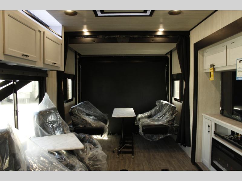 Spend your days kicking up mud and enjoy nights with comforts of home in this toy hauler! The fireplace and 50" TV across from the two swivel rockers provide easy viewing, and the 15' of cargo space will store your gear and toys perfectly. The chef of your crew can make meals on the three burner stove or in the microwave oven, and there is a pantry and refrigerator to store food. A spacious full bath will let you clean up after riding the trails, and the front private bedroom with an RV queen bed is sure to bring you comfort. And if you have any guests stay over, they can sleep on the opposing rear power dinette and drop down bed.