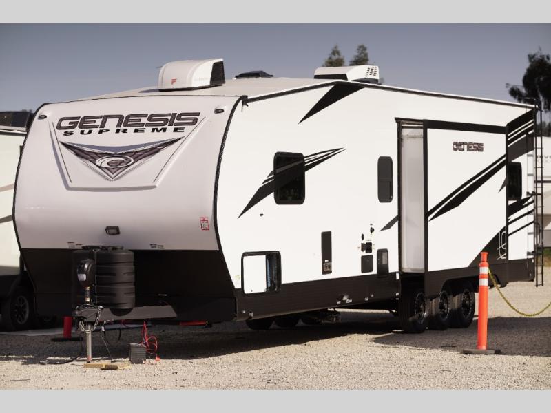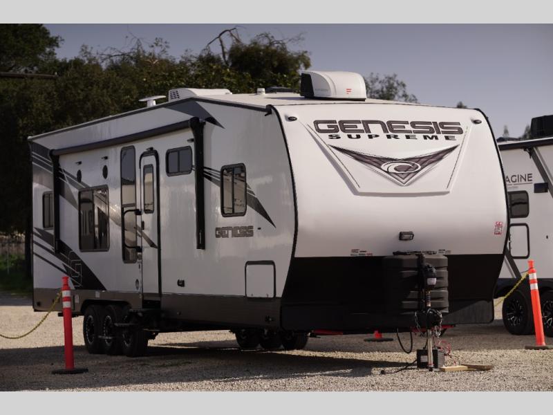 All sizes of off-road toys can fit into one of these Genesis Supreme fifth wheel toy haulers or travel trailer toy haulers! They are made for the outdoor enthusiasts and can handle harsh environments while still providing a luxurious lifestyle. With innovative floorplans built by engineers, you can know you will find what you're looking for in a toy hauler. Start your off-road journey today with your favorite model!