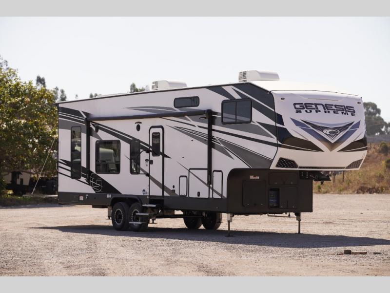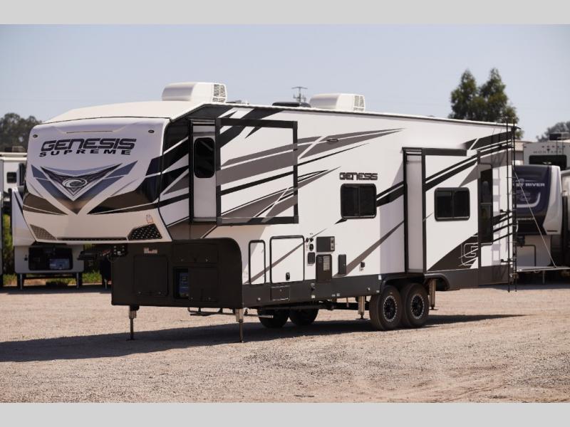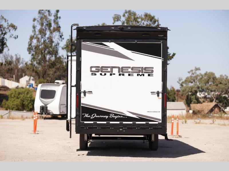 All sizes of off-road toys can fit into one of these Genesis Supreme fifth wheel toy haulers or travel trailer toy haulers! They are made for the outdoor enthusiasts and can handle harsh environments while still providing a luxurious lifestyle. With innovative floorplans built by engineers, you can know you will find what you're looking for in a toy hauler. Start your off-road journey today with your favorite model!