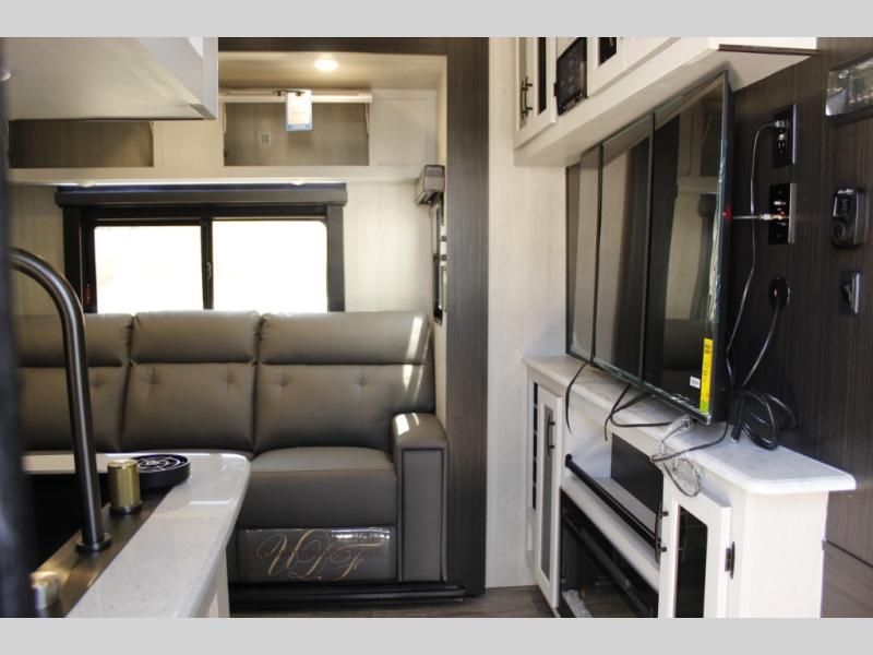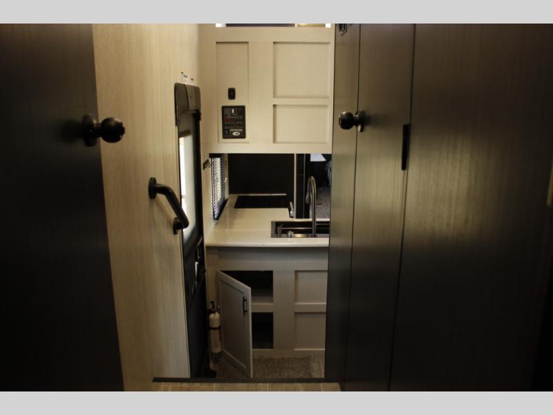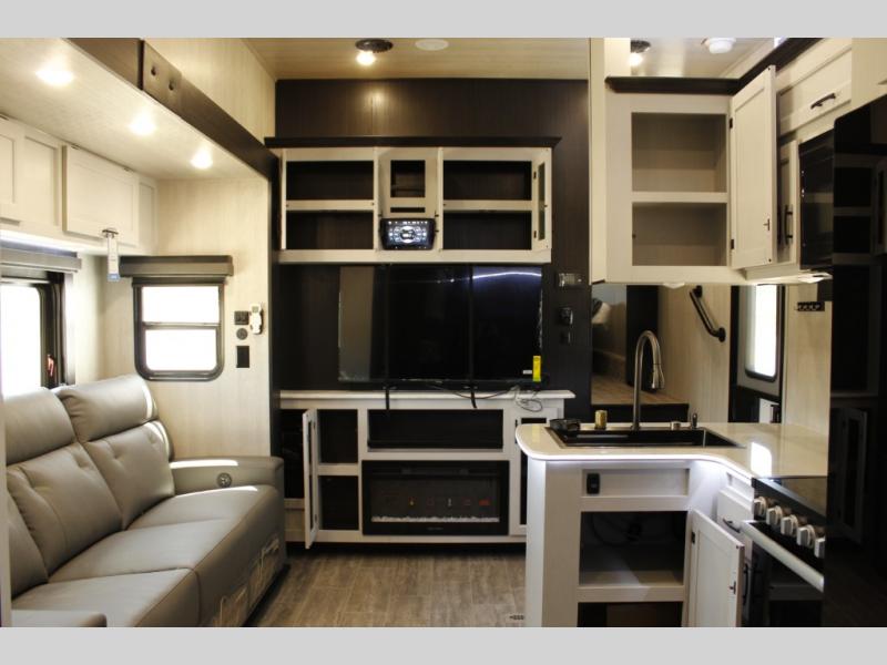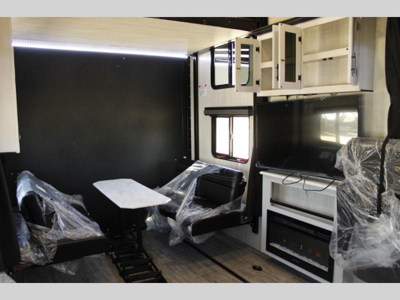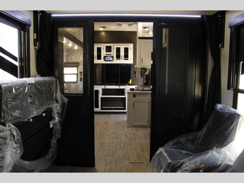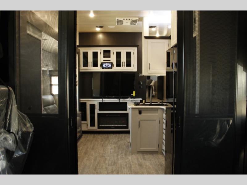 You won't to camp any other way than in this triple axle, dual entry toy hauler! Your guests can make the separate garage their bedroom at night since there is a Happi Jack bed with an opposing dinette plus more sleeping space and a fireplace to keep them cozy. You'll find your own accommodations in the front private bedroom with an RV king bed, dual nightstands, and a wardrobe slide out to keep all your clothes tidy. The combined kitchen and living area is designed perfectly to entertain and relax since there is a U-shaped dinette slide, a large pantry for snacks, and a 40" TV with a fireplace!