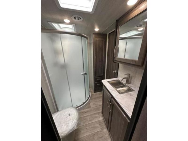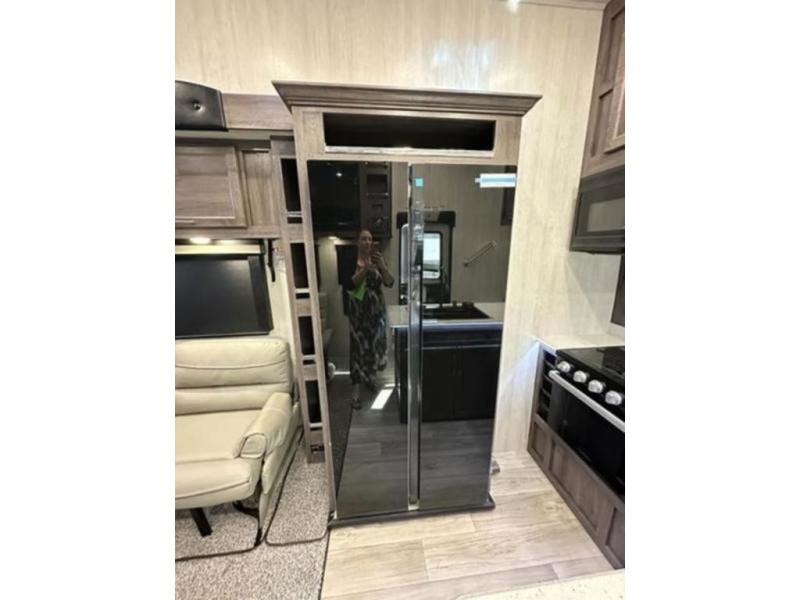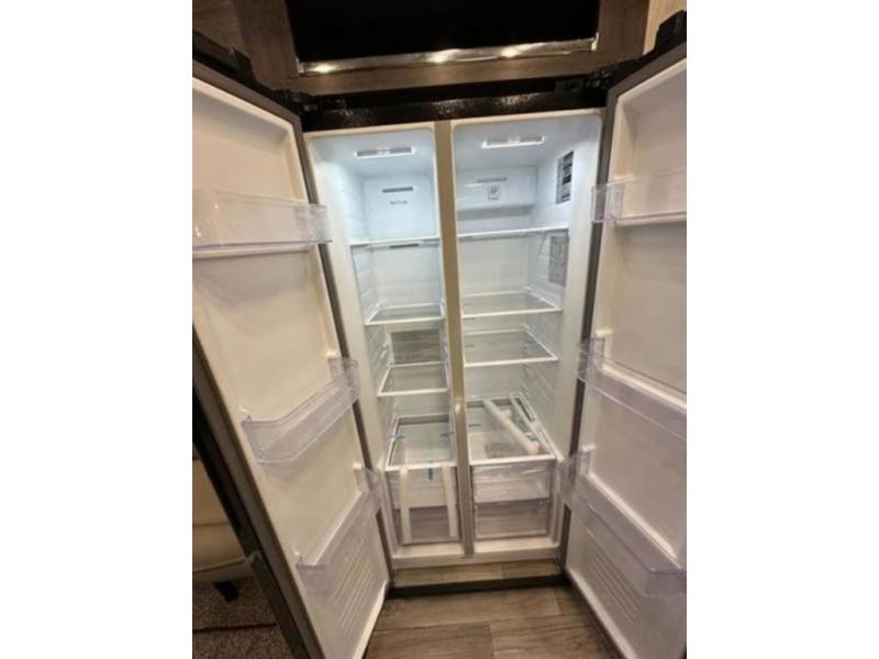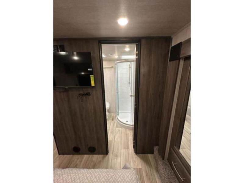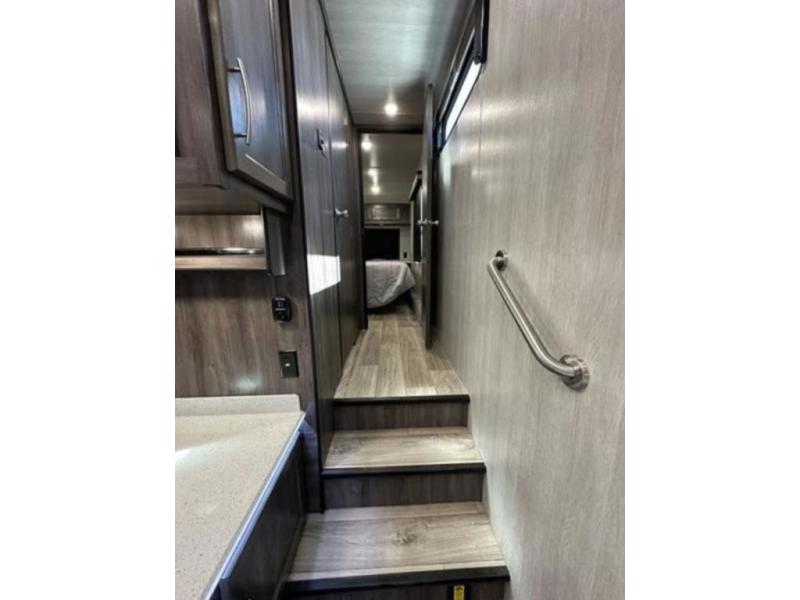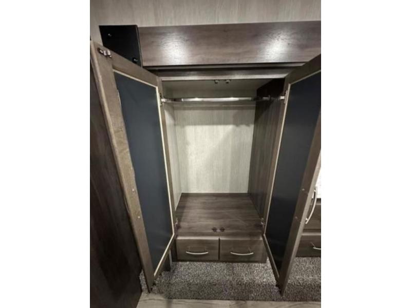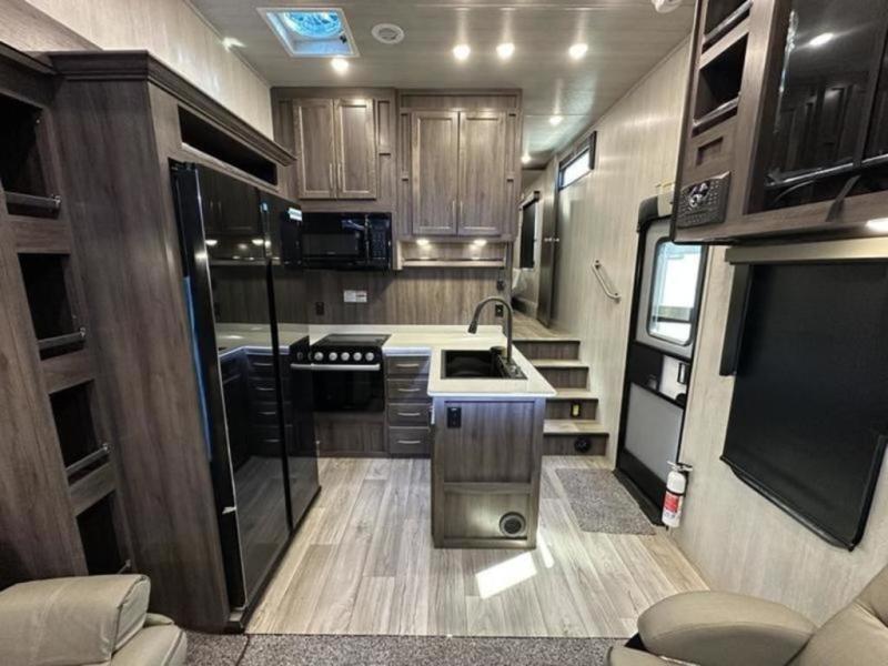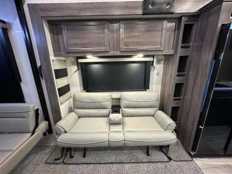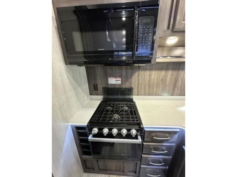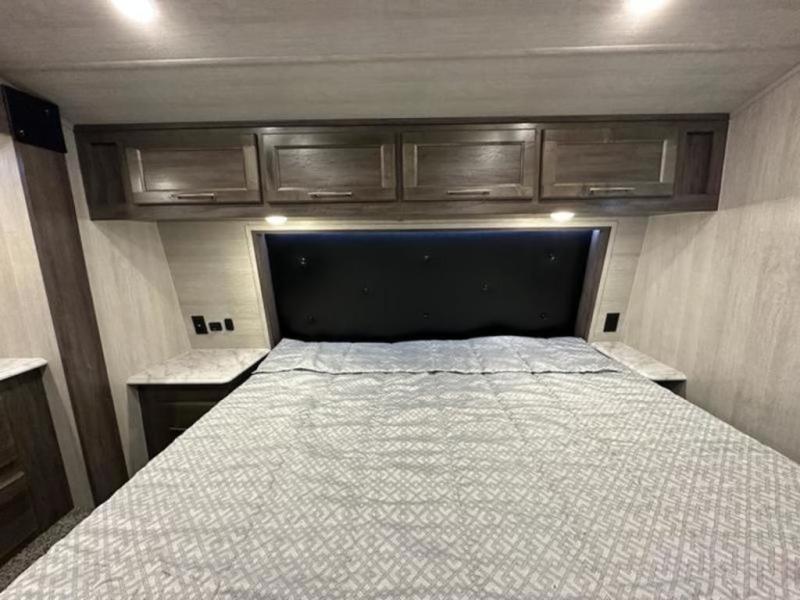 Load up your four wheeler in this toy hauler with a 14' 4" cargo length and head to the campground! You will love having a 40 gallon fuel station to fill up before you hit the trails and there is a full bath onboard so you can clean up when you return. There is plenty of space to relax on the sofa bed slide out, dual swivel/rocker chairs, and power sofa bed under the power queen bed in the garage. You can prepare meals on the three burner cooktop or use the extra large over-the-range residential microwave oven, and the 8 cu. ft. extra large double door refrigerator will hold perishables for the whole week! When it's time to call it a day, head to the front master bedroom for a great night's rest on the RV king bed, and you'll also enjoy a nightstand here, a countertop, plus a slide out for more interior space!