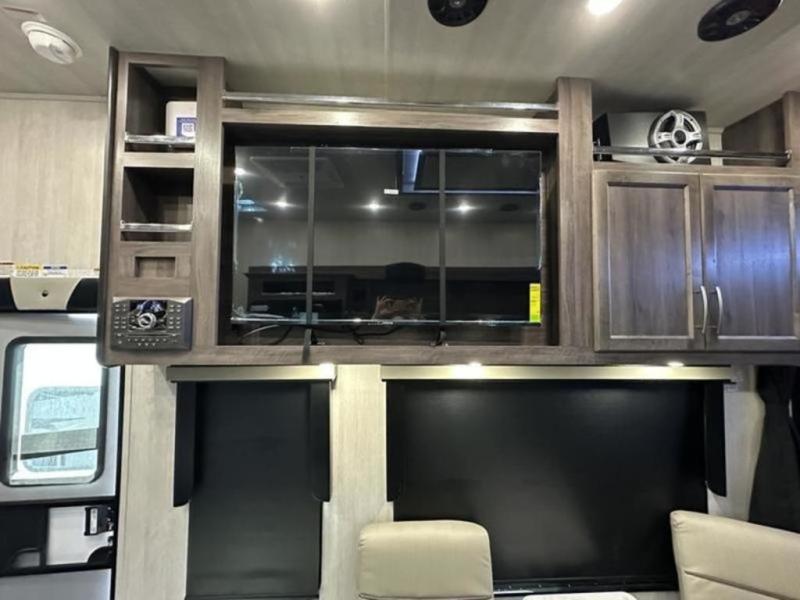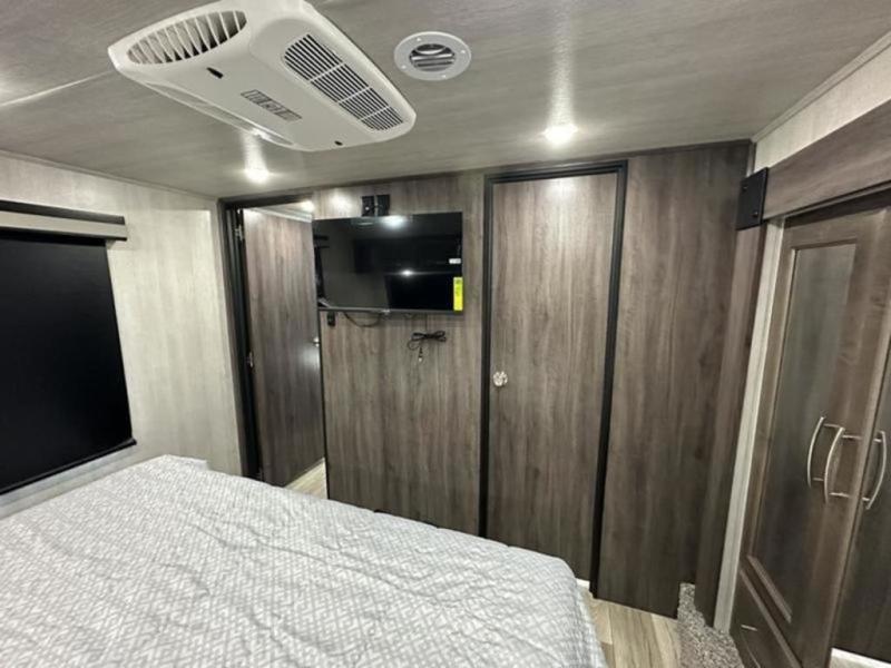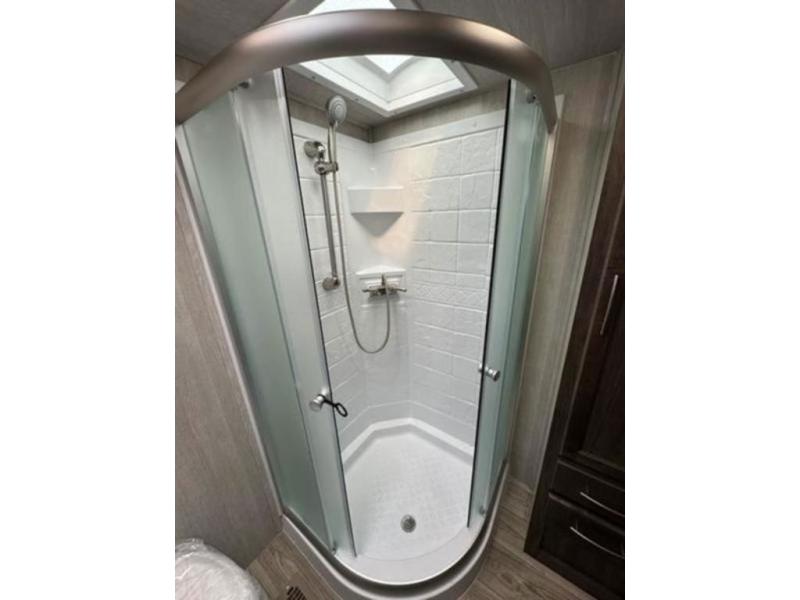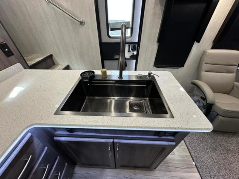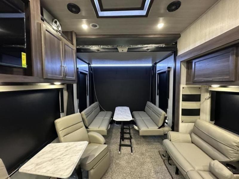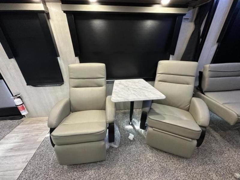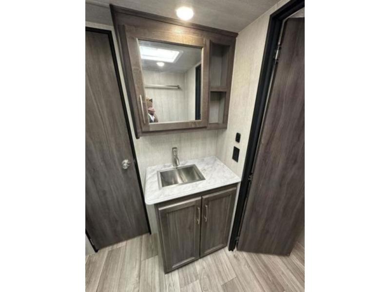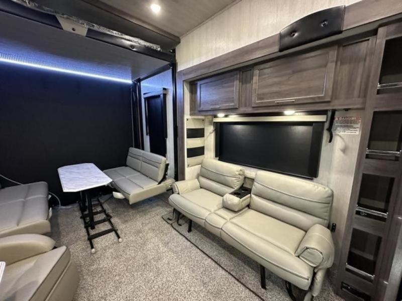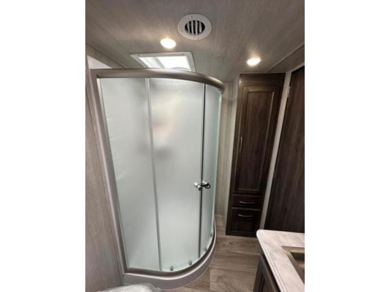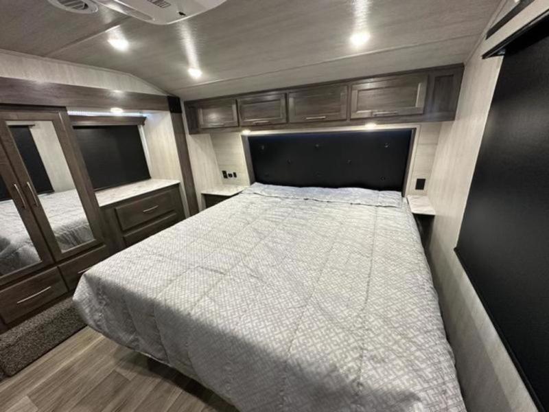 Load up your four wheeler in this toy hauler with a 14' 4" cargo length and head to the campground! You will love having a 40 gallon fuel station to fill up before you hit the trails and there is a full bath onboard so you can clean up when you return. There is plenty of space to relax on the sofa bed slide out, dual swivel/rocker chairs, and power sofa bed under the power queen bed in the garage. You can prepare meals on the three burner cooktop or use the extra large over-the-range residential microwave oven, and the 8 cu. ft. extra large double door refrigerator will hold perishables for the whole week! When it's time to call it a day, head to the front master bedroom for a great night's rest on the RV king bed, and you'll also enjoy a nightstand here, a countertop, plus a slide out for more interior space!
