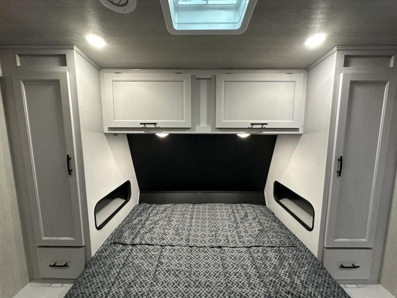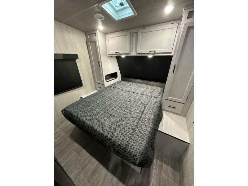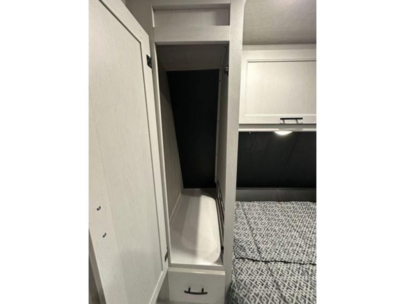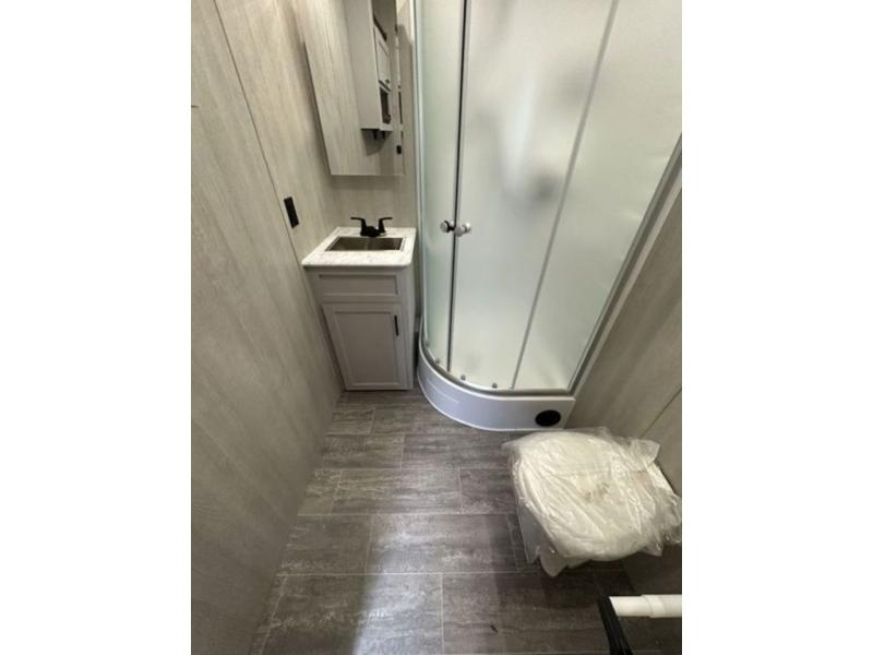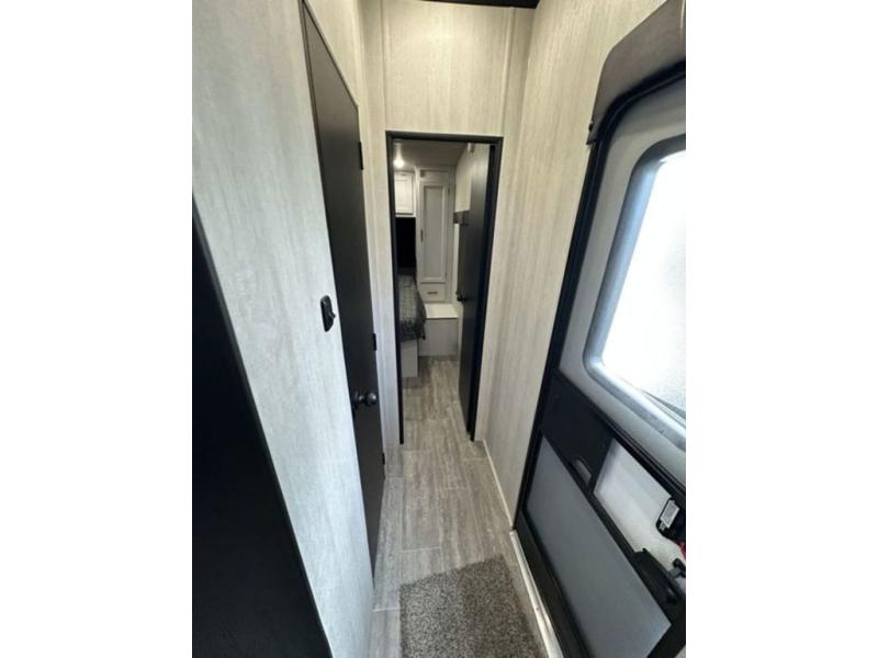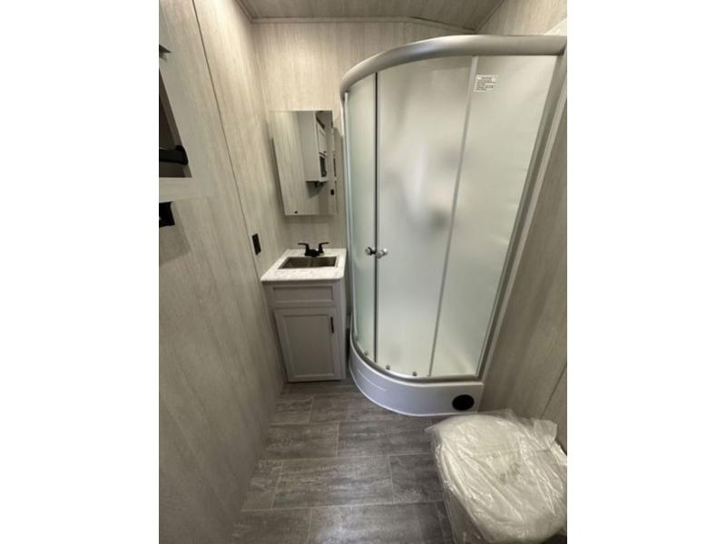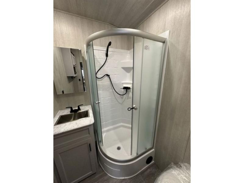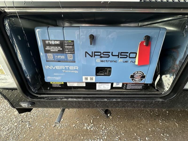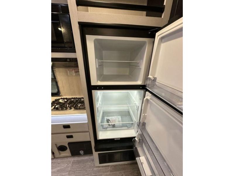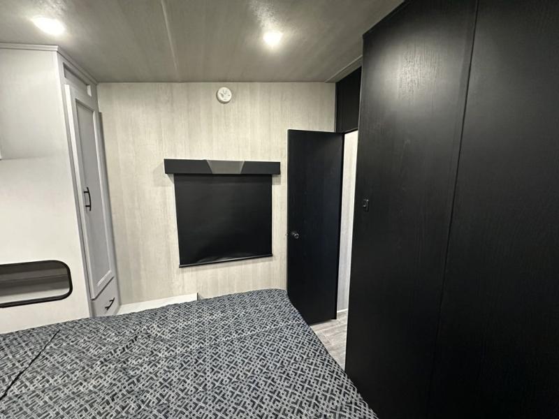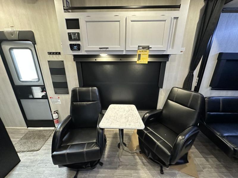 This toy hauler will feel a little more like home since it includes a front private bedroom with a queen bed and dual wardrobes for your things. There is a spacious full bath with a tub/shower surround, and the full kitchen will allow you to cook meals each day on the three burner cooktop and microwave. There is also an 10 cu. ft. 12V refrigerator to store perishables for the week. You will also enjoy a 200W solar panel outside, along with a patio awning, a 7' ramp door, and many more features.