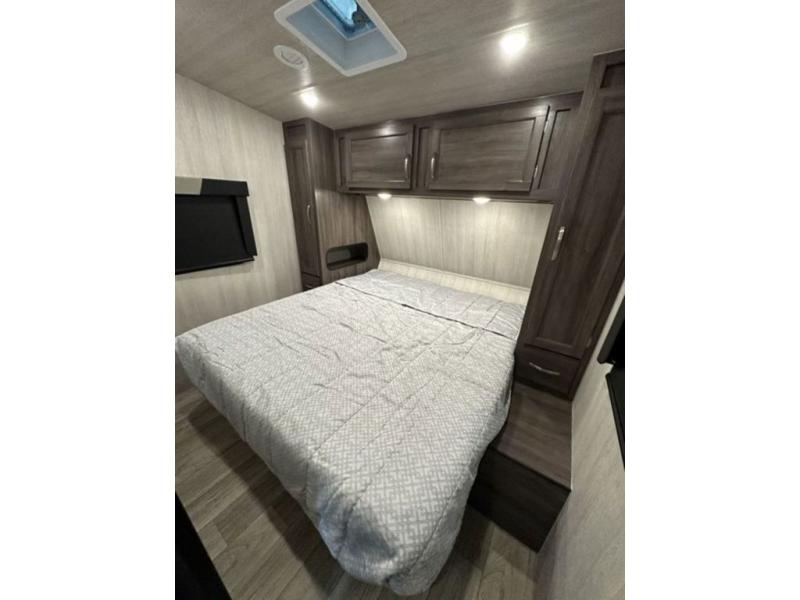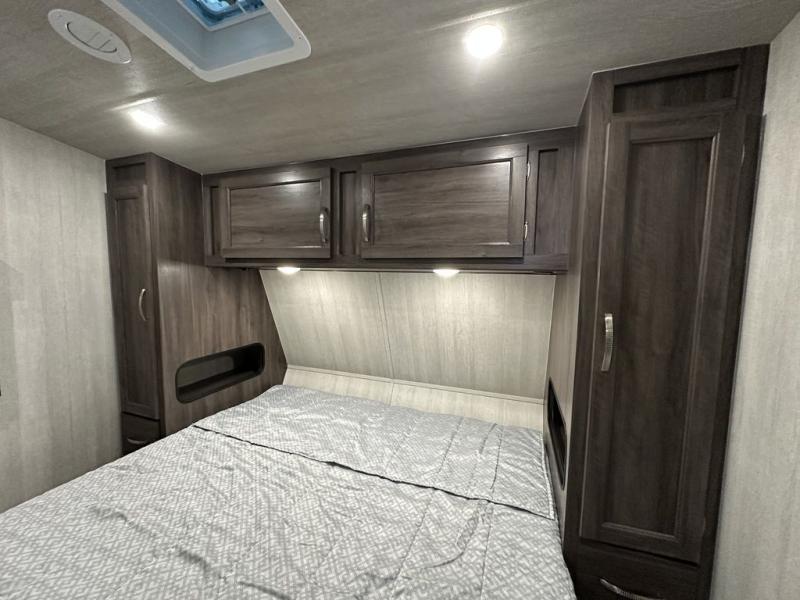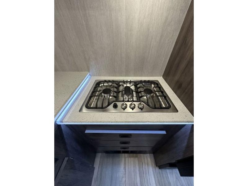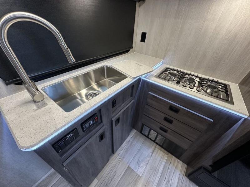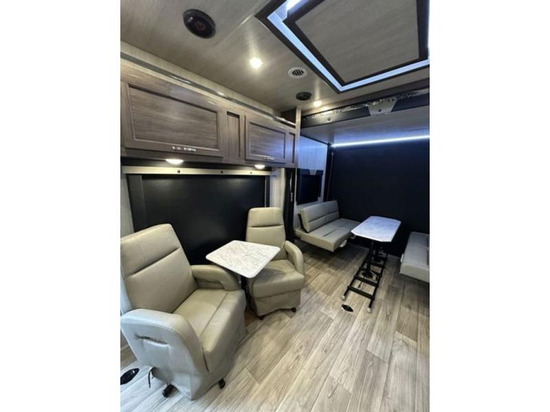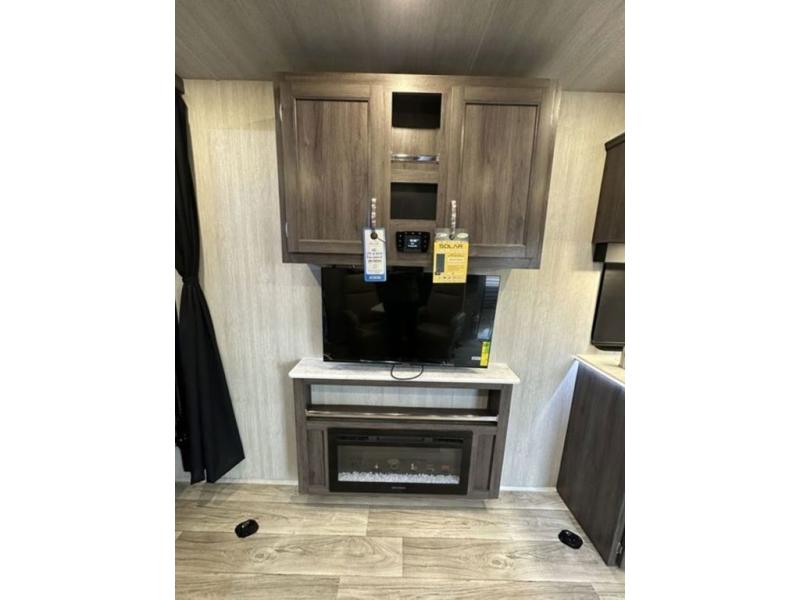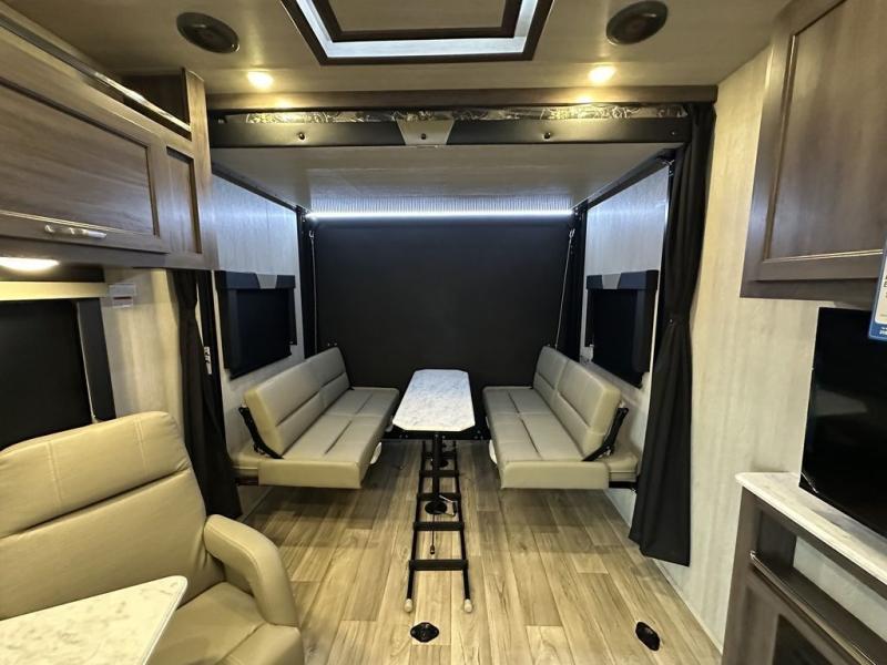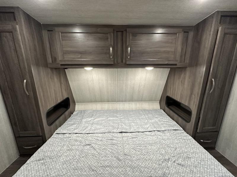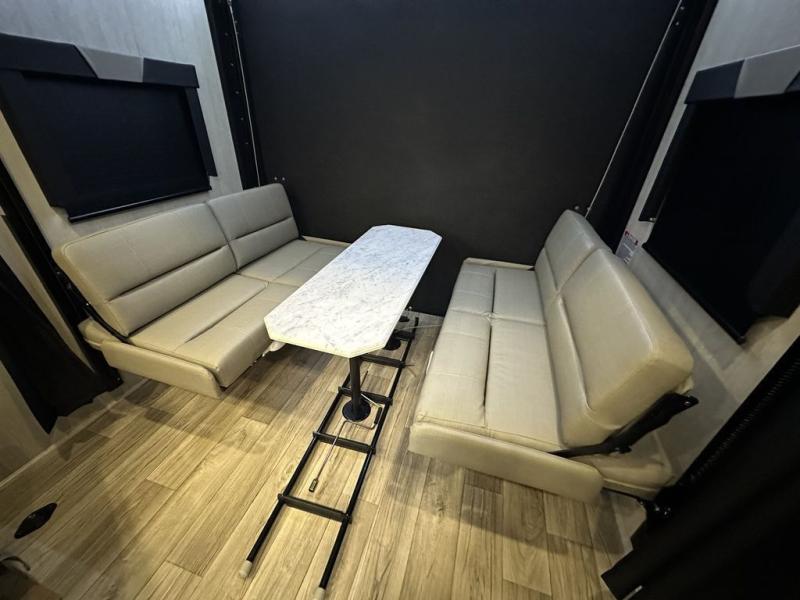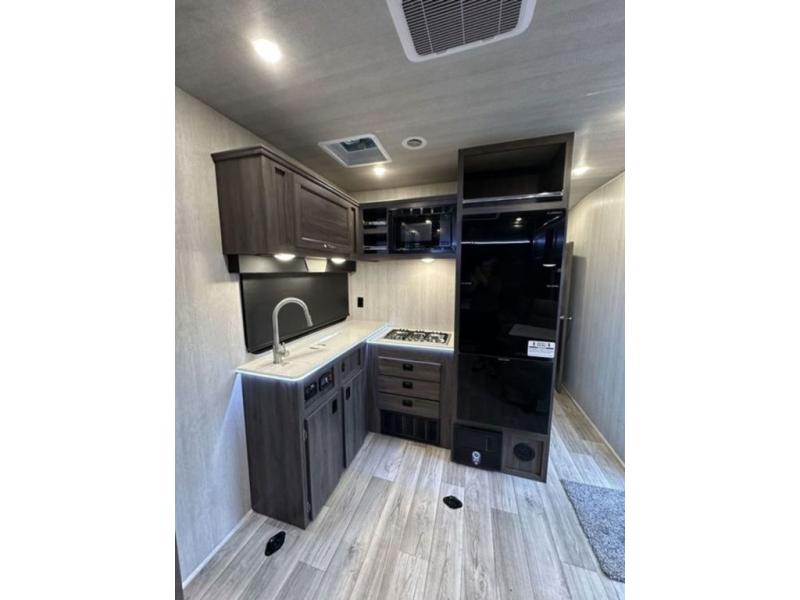Grab your riding gear, load up the bikes, and head for the hills in this toy hauler for four. Once your toys are unloaded from the 15' total garage space, you can relax on the dual opposing sofas or on the dual lounge chairs with a table in between. There is also an entertainment center across from the chairs, and an optional queen bed above the sofas if you need more sleeping space. A full kitchen with a three burner cooktop, microwave oven, sink, and refrigerator lets you make meals each day, and the full bath will be much appreciated after trail riding. The front of this model features the private bedroom, complete with an RV queen bed, dual wardrobes, and an overhead cabinet for books and more!