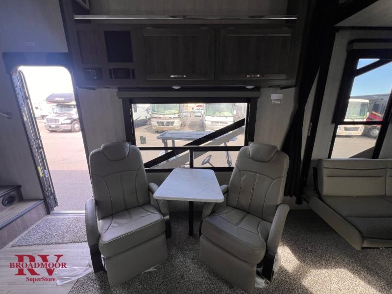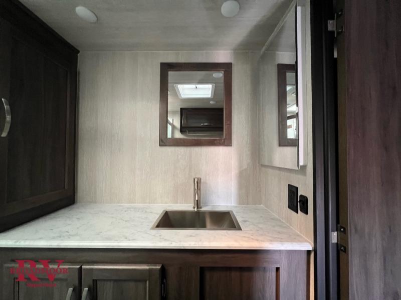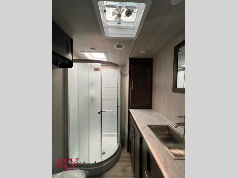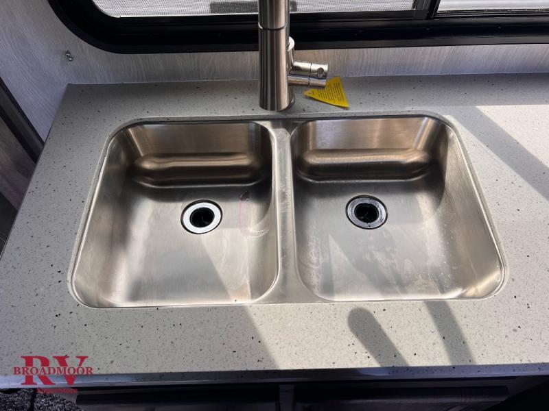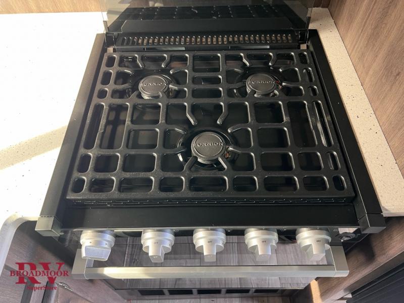 Your camping life is going to be a blast with the Genesis Supreme Vortex toy hauler! These work horses get the job done but also make it fun. You will be able to use the 40-gallon fuel station to gas up your toys when you come back from the trails, and the power awning with LED lights will give you protection as you use the exterior features. The 16" deluxe aluminum alloy wheels will get you to and from your destination with confidence, and the 30,000 or 35,000 BTU furnace will ensure that you don't freeze while you sleep on cool nights. You can keep power flowing with the 4.0kW generator with transfer switch, and you'll also enjoy the function and the style of the solid-surface countertops in the kitchen.