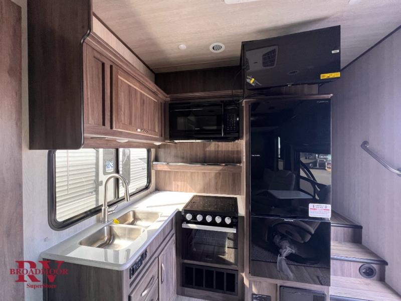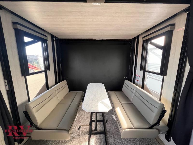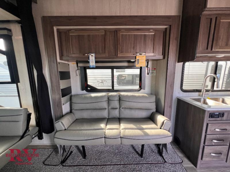 You can store your ATVs in the 15' 11" garage on this Vortex toy hauler and use the 7' laminated ramp door with beaver tail to get them out. For other gear, there are slam-door storage compartments, and you'll also be able to put fresh products in the 6-cubic foot double-door refrigerator. When you get hungry, use the three-burner range to make a fresh batch of French toast, and when you get tired, use the RV queen bed, power queen bunk, and sofa bed to get some rest. You can add space to the interior by adding the two optional slides, and you can also add some entertainment by adding the optional TVs.